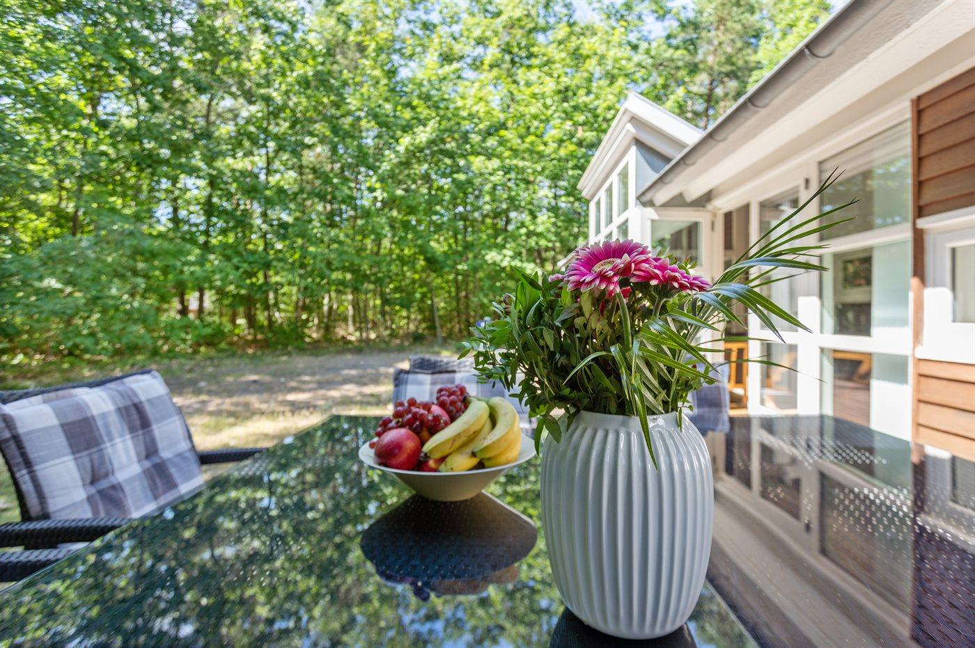 Et herligt og moderne sommerhus i træ, beliggende lidt nord for Rønne i et naturskønt sommerhusområde med skov, søer, cykel- og vandrestier og kun 600 meter til en af øens gode badestrande.
