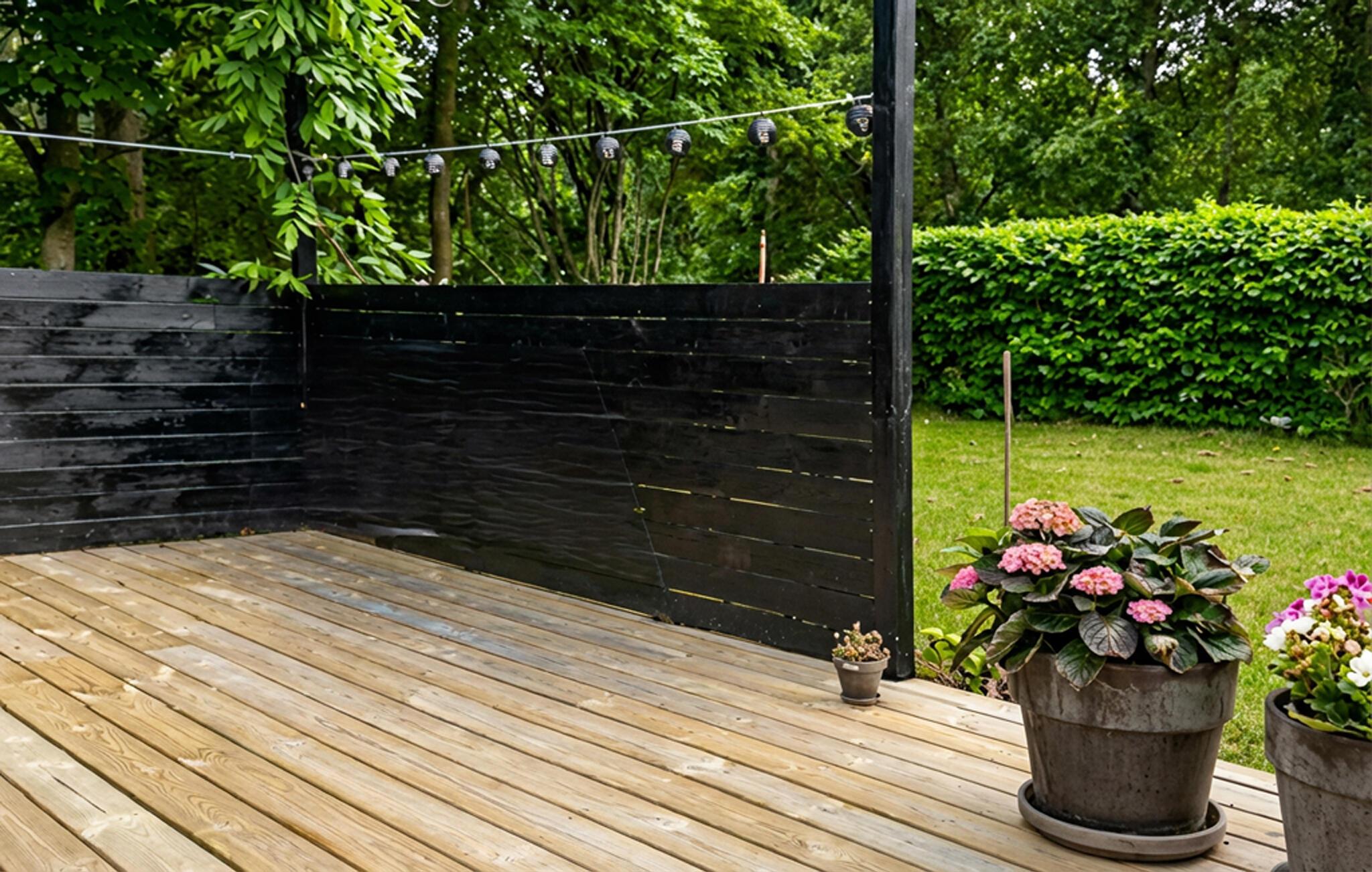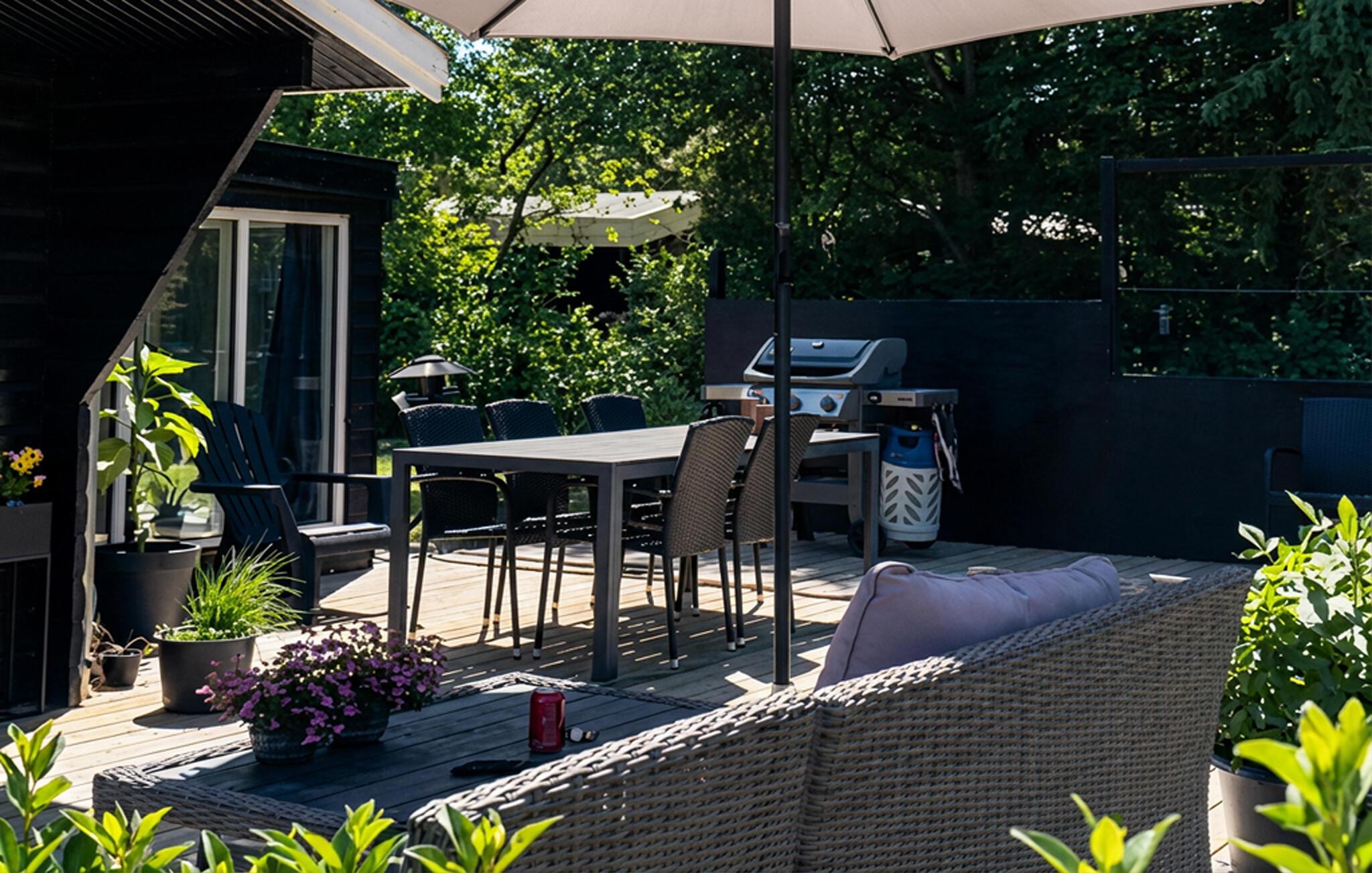 Træd ud på den rummelige træterrasse. En parasol og forskellige siddepladser giver fleksible muligheder for udendørs ophold. Slap af i havemøblerne og brug grillen til fælles middage. Takket være hækken tilbyder haven masser af privatliv.
