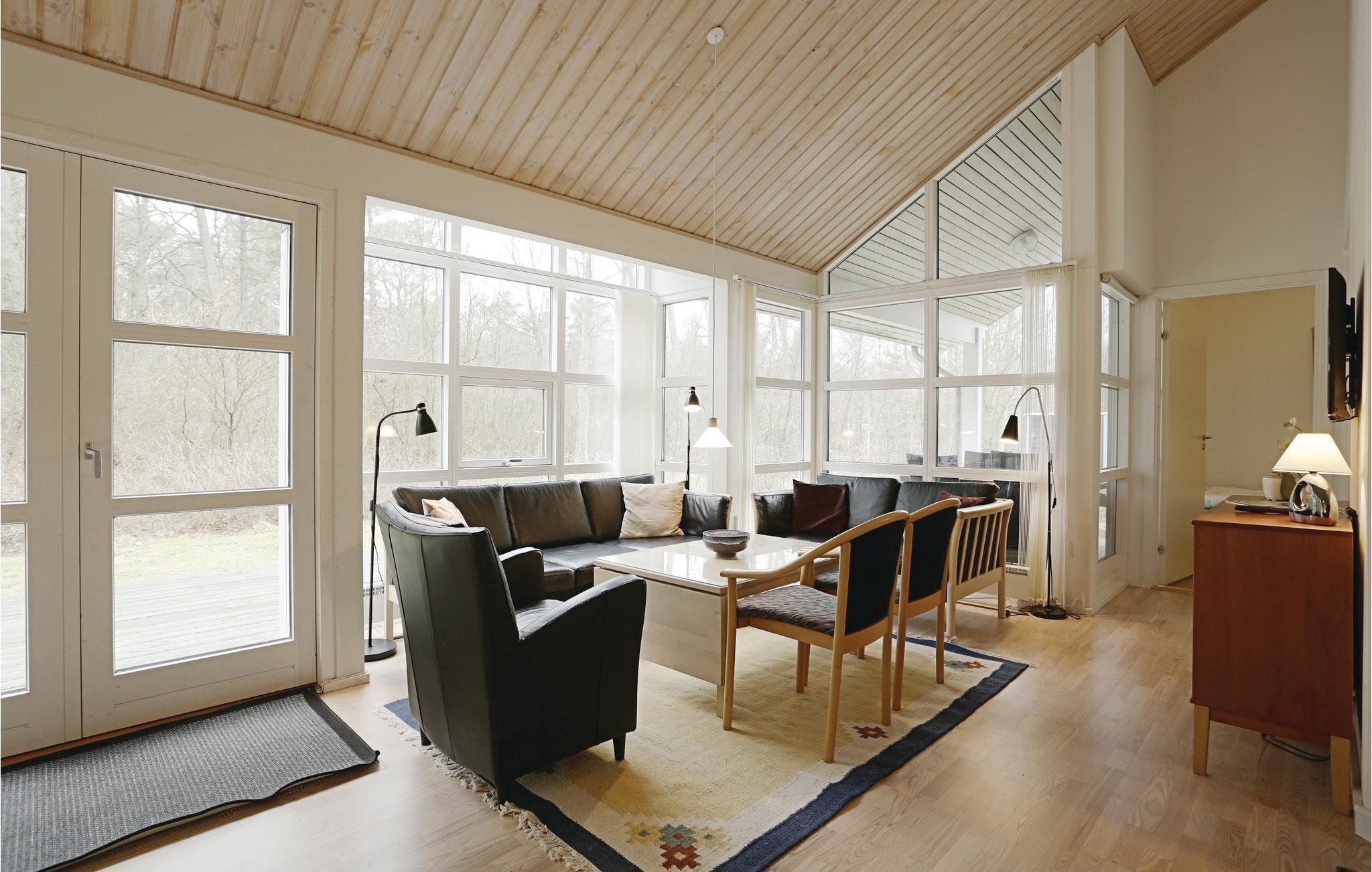 Pænt og velindrettet kvalitetsferiehus med god plads til 2 familier, beliggende i et stort og børnevenligt skovområde med flere feriehuse i nærheden. Dette rummelige feriehus byder på en dejlig stor opholdsstue med nydelige møbler og brændeovn samt et pænt åbent køkken, med god plads til at tilberede skønne feriemåltider. Huset virker stort på grund af den store højde der er i rummene. Dejligt stort badeværelse med spa-bad og sauna samt ekstra badeværelse. Huset indeholder også 4 dejlige soveværelser og en hems og rumfordelingen er utrolig praktisk rumfordeling. Fra husets opholdsstue er der udgang til en skøn og rummelig træterrasse, hvor I kan nyde ferien i rolige omgivelser og slappe af i husets nydelige havemøbler. Området byder på gode muligheder for vandreture, cykelture og den smukke Rubinsø bør ses. Fin sandstrand i nærheden og røgerierne i Hasle er indenfor cykelafstand. Et kvalitetsferiehus med høj komfort og velegnet til ferieophold uanset årstid.