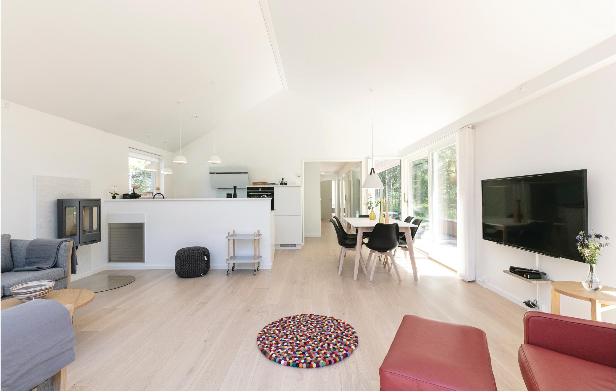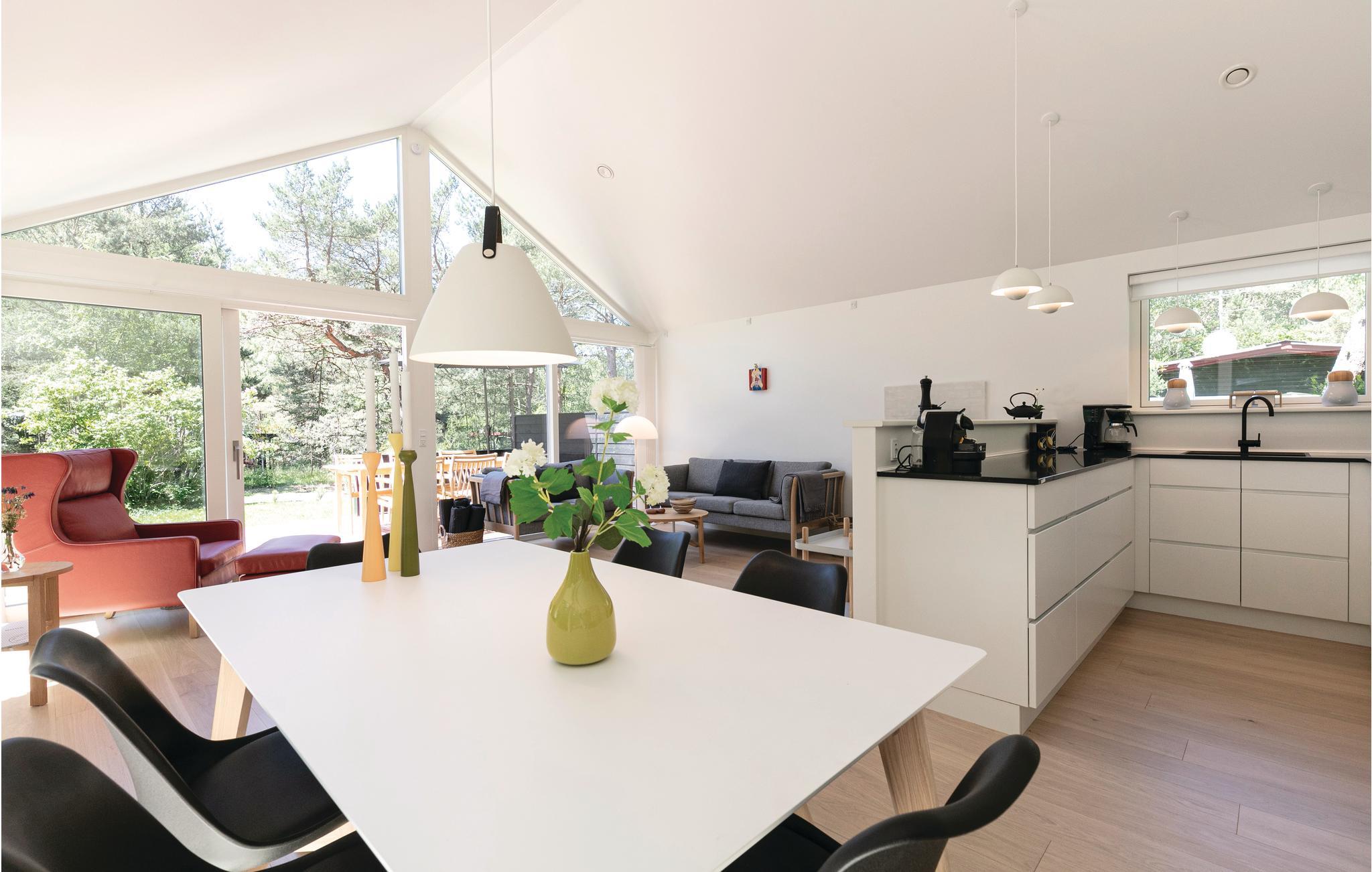 Nyopført og flot kvalitetssommerhus med lys og moderne indretning og attraktiv beliggenhed nær god sandstrand og cykel- og vandrestier. Dette nydelige og rummelige sommerhus fremtræder overalt velindrettet med stor åben spise- og opholdsstue med komfortable møbler, brændeovn og varmepumpe / klimaanlæg samt gratis internet. Dejligt moderne indrettet åbent køkken, hvor det er en fornøjelse at tilberede feriens måltider med udsigt til den smukke natur. I dette flotte og velindrettede kvalitetssommerhus har I 3 gode soveværelser og fra "master-bedroom" er der direkte udgang til terrasseområdet. Nydeligt og lækkert badeværelse samt et gæstetoilet i tilknytning til "master-bedroom", begge med gulvvarme. Fra stuen er der udgang til husets store træterrasse, hvor I bare kan slappe af i de flotte havemøbler og hyggelige omgivelser med udsigt til skov og naturen. Er I til en badetur i Østersøen eller en løbetur i skoven, så ligger disse gratis faciliteter i umiddelbar nærhed, og gør ferieopholdet til en endnu større oplevelse. Husets udebruser kan også anbefales, og hvem har ikke lyst til at stå ude i det fri, og blive skyllet af efter en tur på stranden. Den hyggelige by, Hasle, ligger heller ikke langt fra dette dejlige sommerhus, og her er gode indkøbsmuligheder, et hyggeligt røgeri, havnebad og meget andet. Husets høje komfort, nydelige indretning og mange moderne faciliteter gør det velegnet til hyggelige ferieophold uanset årstid.