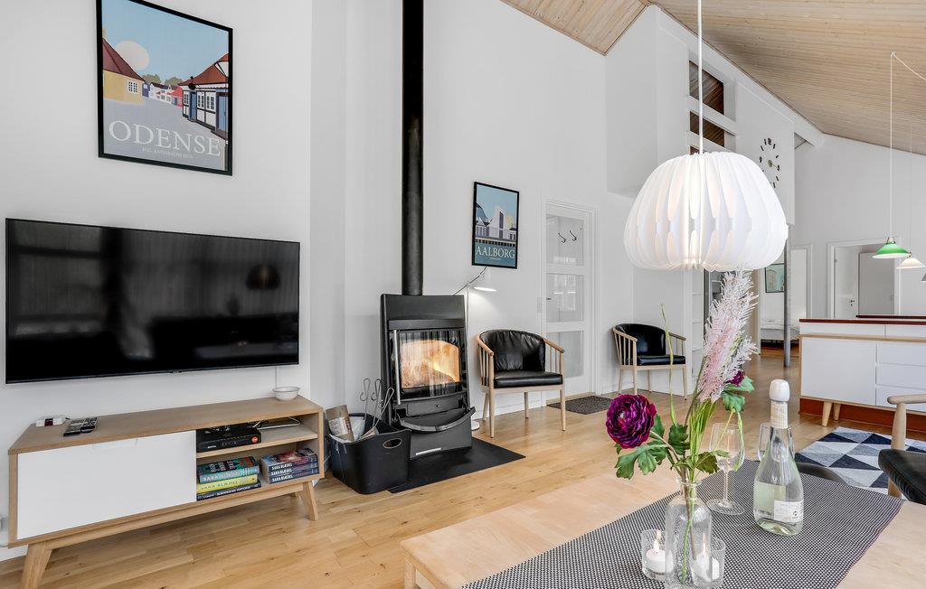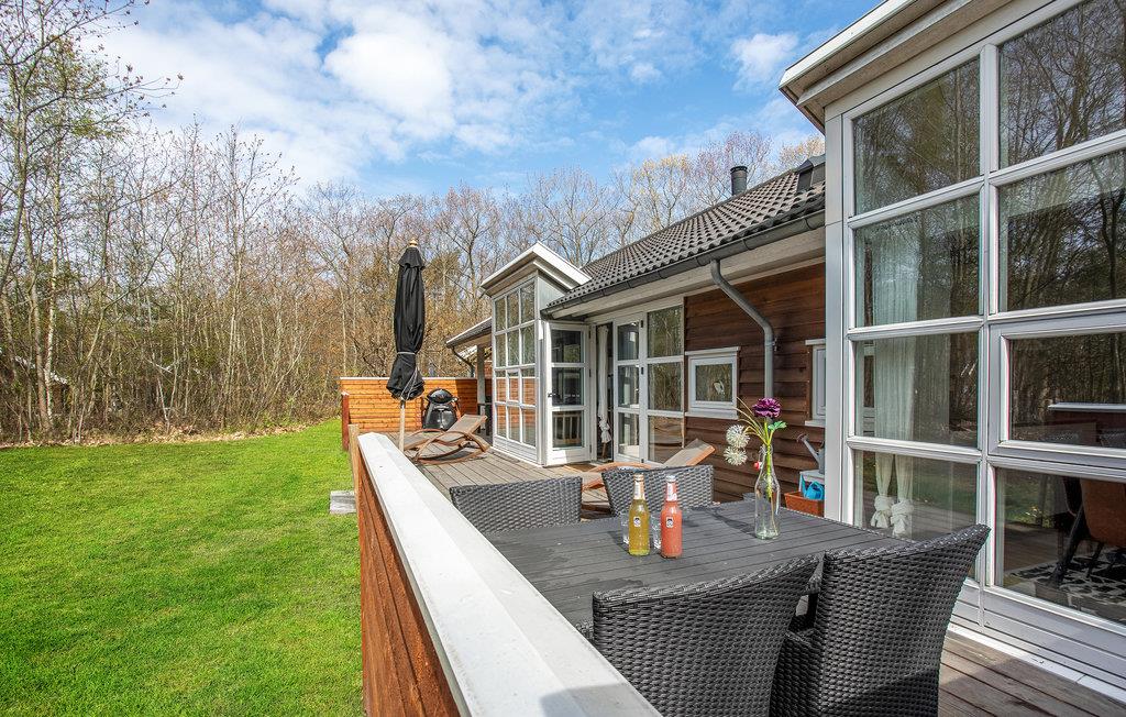 Charmerende sommerhus nær skov og strand med spa, brændeovn og stor terrasse til afslapning.