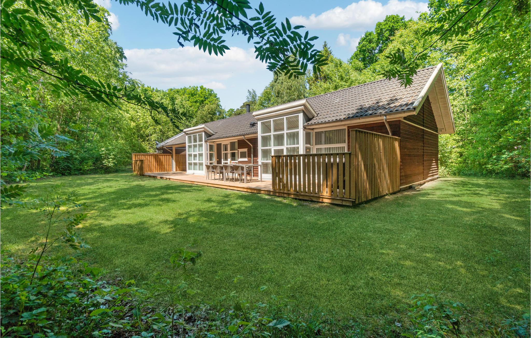 Moderne træsommerhus tæt på Rubinsøen og sandstrand med spabad og sauna for afslappende ferieoplevelser.