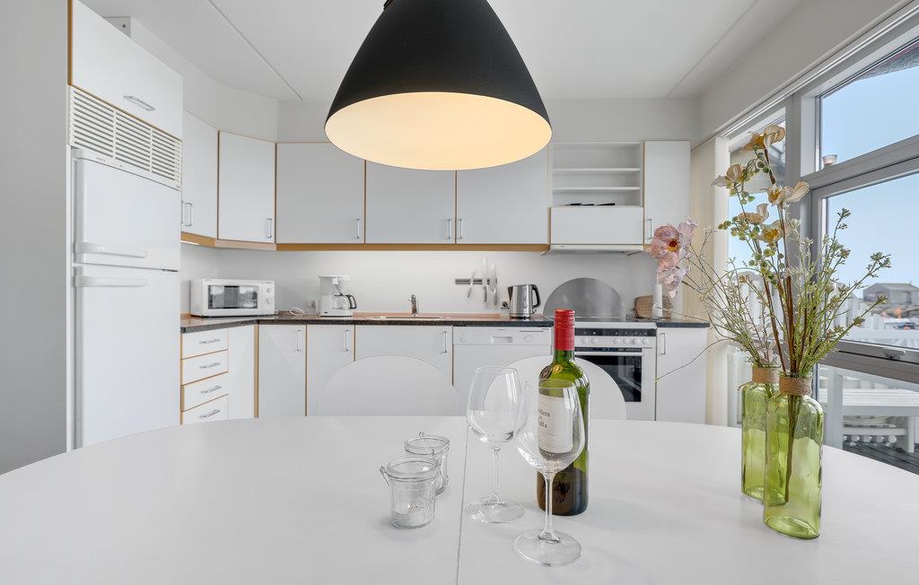 Dejligt, lyst og lækkert indrettet kvalitetsferiehus i to etager med en skøn havudsigt beliggende midt i det maritime miljø på Hasle småbådehavn. Rækkehuset udstråler kvalitet med bl.a. et dejligt stort spisekøkken med direkte udgang til en skøn terrasse med havudsigt, hvor I også kan grille. Dejlige badeværelser og gode soverum i lyse nuancer, der klæder huset. På husets 1. sal kan I nyde den flotte havudsigt fra den skønne opholdsstue med loft til kip, der giver et helt unikt lysindfald. Stuen har både komfortable møbler og brændeovn og her er naturligvis gratis internet samt en varmepumpe. Om aftenen kan I nyde den flotte solnedgang ude på balkonen. Området oser af maritim hygge, når småbådene kommer sejlende ind med dagens fangst. Området byder på bl.a. nyt havnebad, sandstrand, caféer, butikker, røgeri og det maritime miljø på Hasle Havn. Her får I et feriehus med høj komfort og en nydelig indretning samt meget velegnet til ferieophold uanset årstid - velkommen!