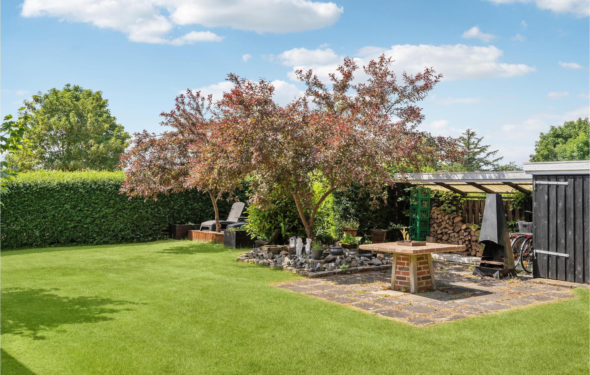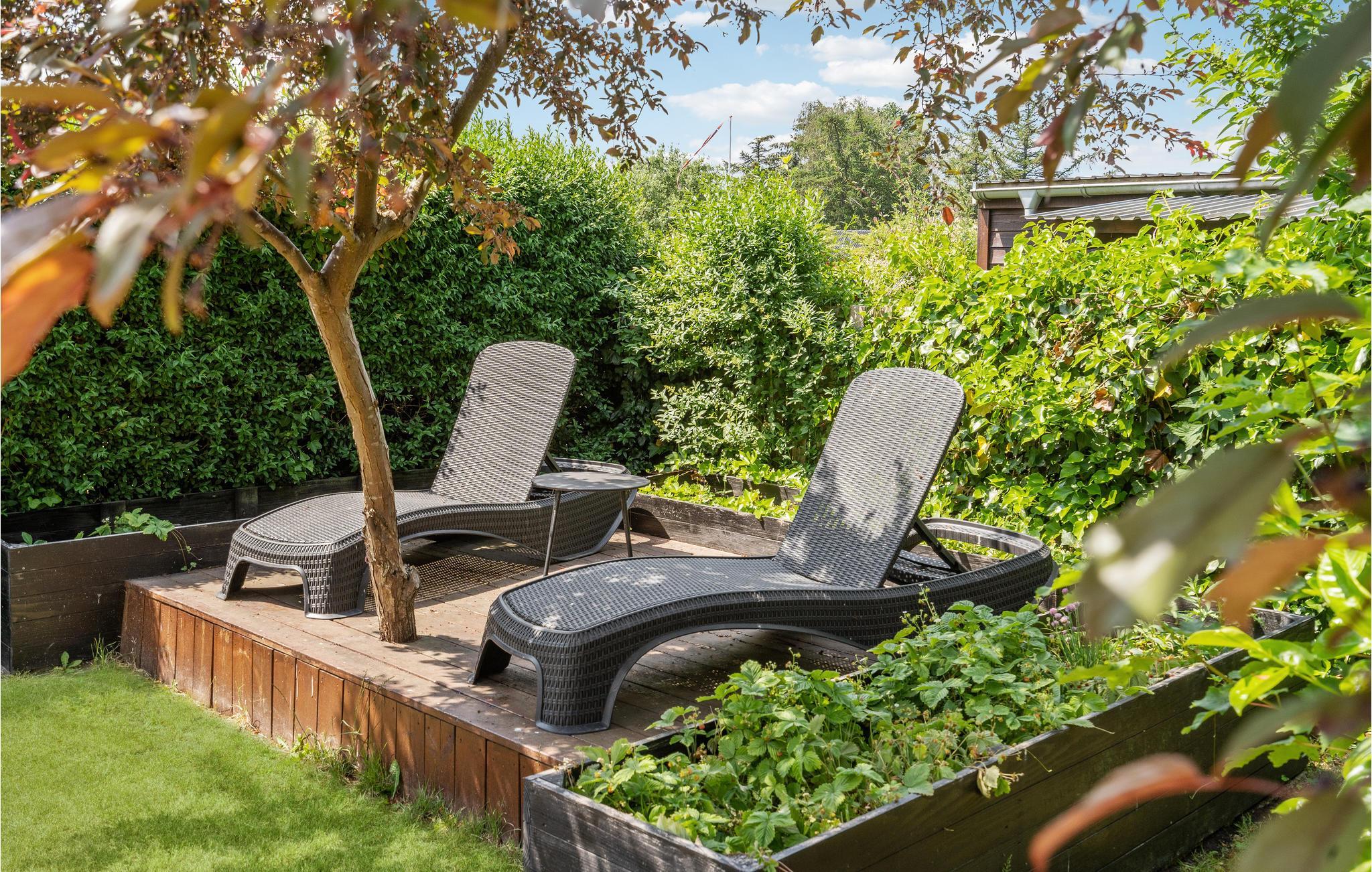 Hyggeligt familievenligt træhus tæt på Hasmark Strand med stor terrasse og smuk have.