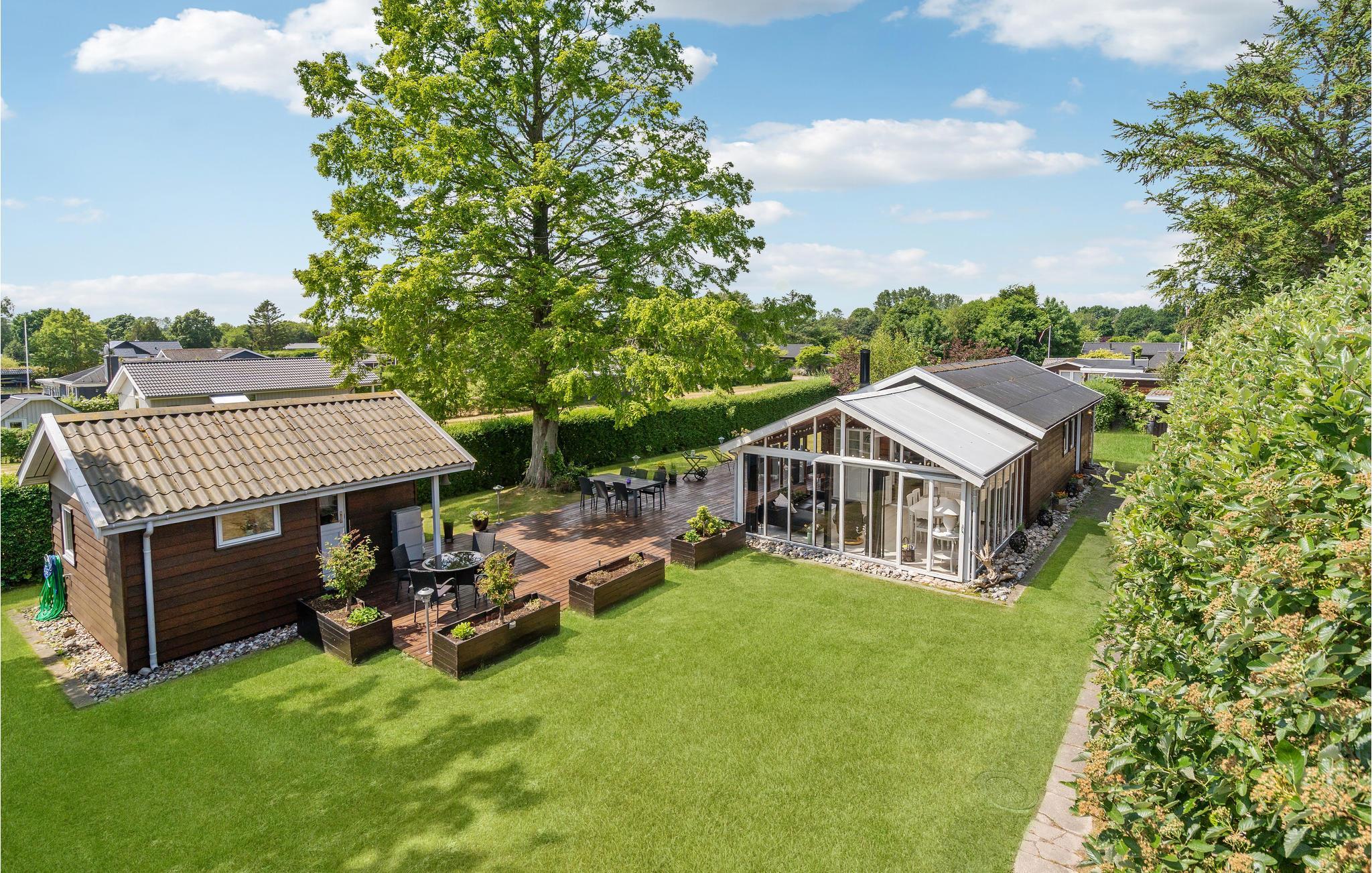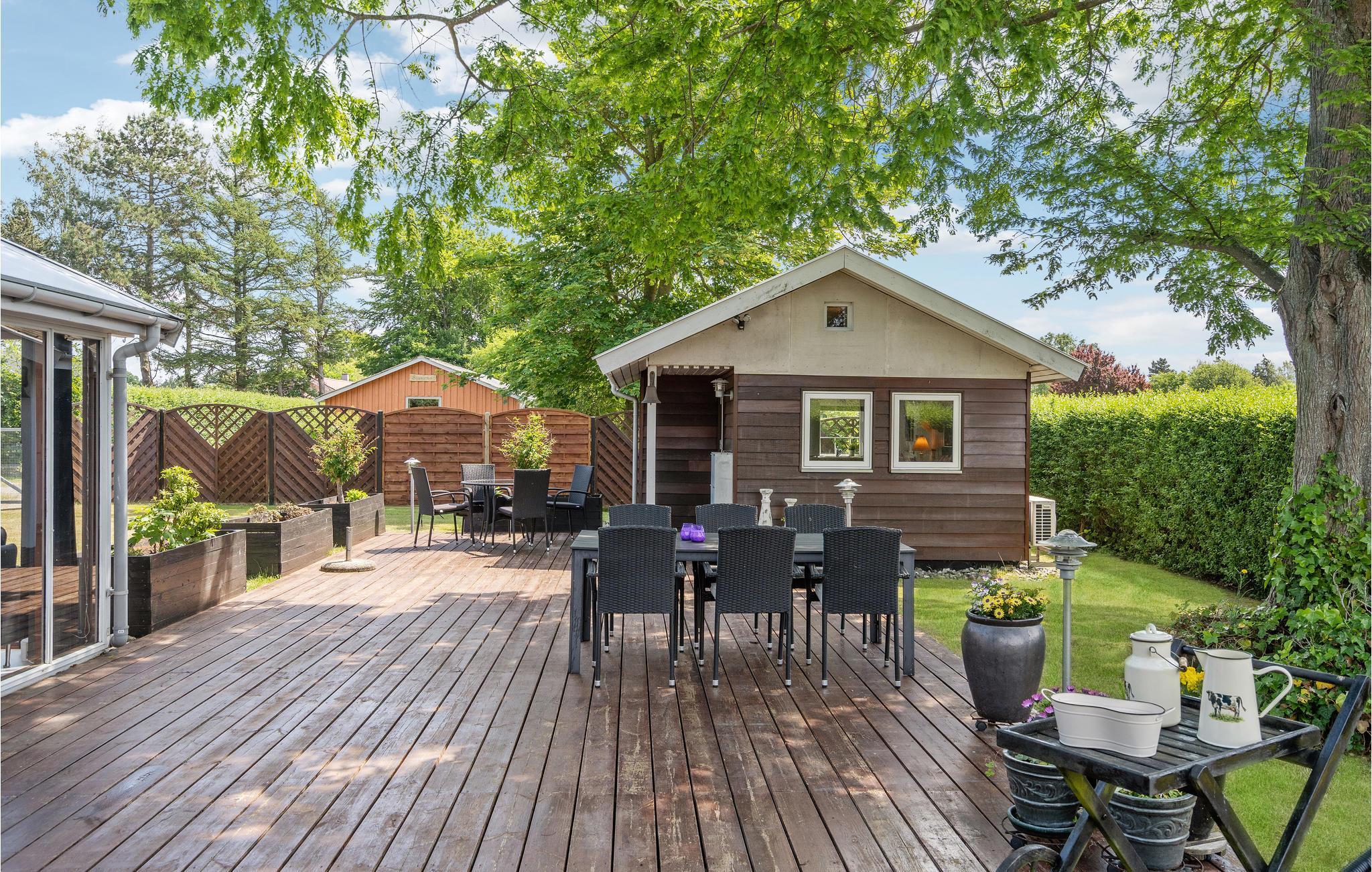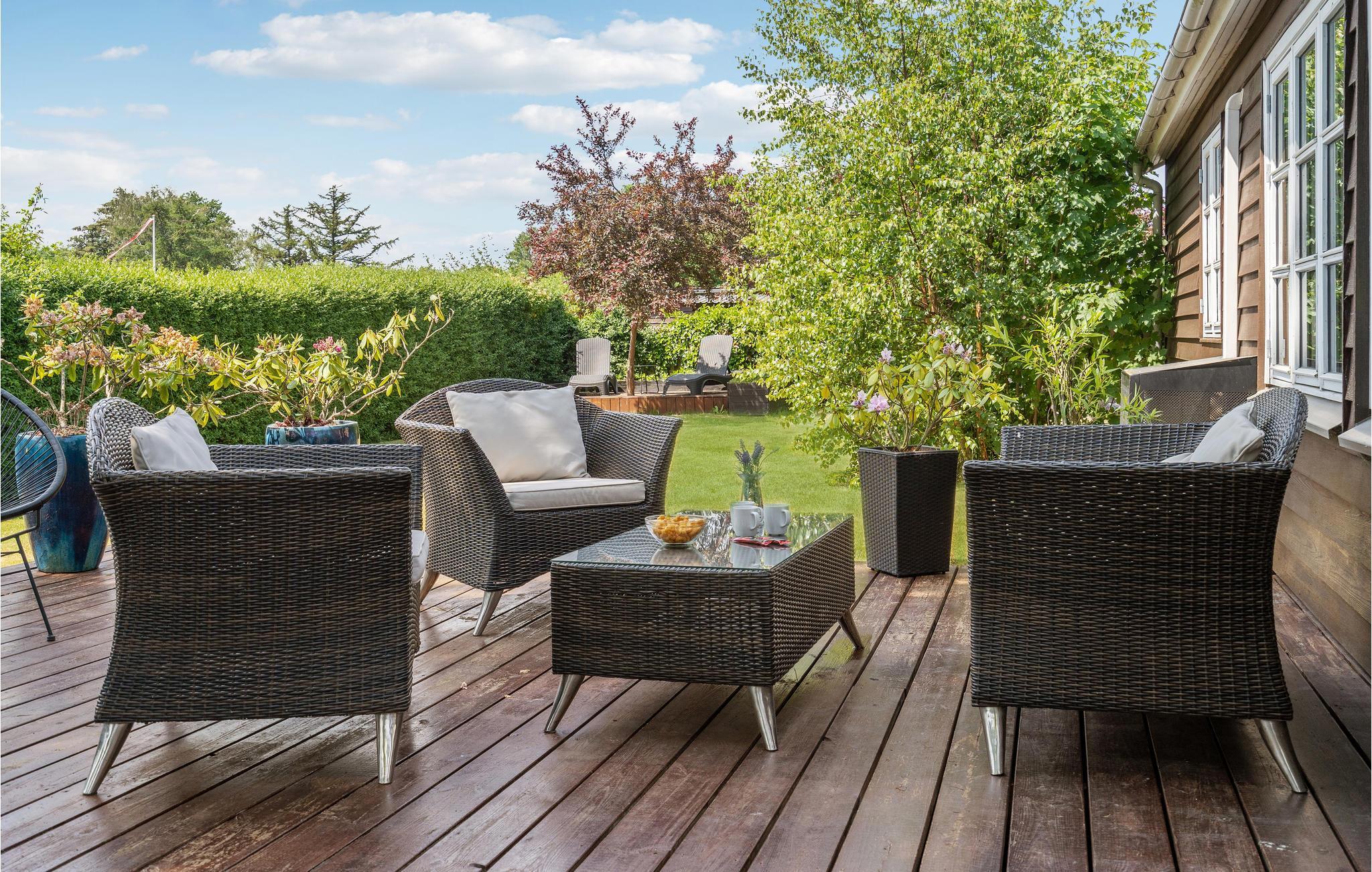 Smagfuldt familievenligt feriehus med stor træterrasse og tæt på vandet.