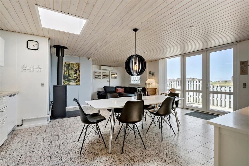 Fra stuen er der direkte adgang til et skønt terrassemiljø mod øst og nord. Når solen stiger op og farver Ringkøbing Fjord orangerød i morgengryet, er det oplagt at tage morgenkaffen med herud og nyde det smukke syn. Terrassen er også stedet, hvor I kan nyde en kølig forfriskning under åben himmel eller tænde op i grillen.