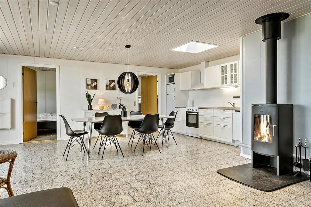 Lejligheden byder på en moderne og komfortabel indretning, og I kan glæde jer til at indtage et stort, åbent opholdsområde, hvor køkkenet og stuen glider i ét. Køkkenet er lækkert indrettet og giver god plads til at være sammen om at lave lækre retter, og takket være opvaskemaskinen slipper I for at bruge ferietiden på at vaske op. Spisebordet og sofaarrangementet giver god plads til måltider og aftenhygge, og med tv samt wi-fi er underholdningen sikret. Ovenlys og vinduespartier fra gulv til loft giver et skønt lysindfald og udsigt til naturen, og med både varmepumpe og brændeovn kommer I ikke til at fryse. De to soveværelser giver sengepladser til fem personer, og ferielejligheden fuldendes af et badeværelse med bruseniche.