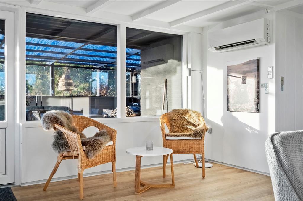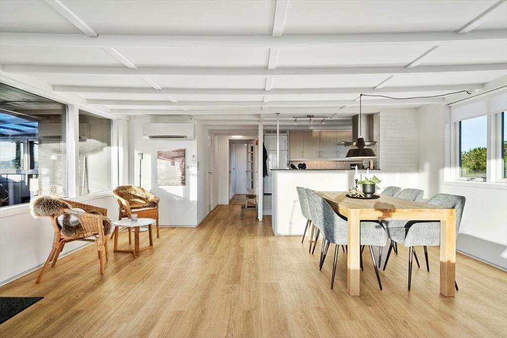 Den fantastiske natur følger med indenfor via stuens store panoramavinduer, der giver jer en helt unik udsigt over klitlandskabet. På kølige dage kan I tænde op i brændeovnen eller lade varmepumpen skabe en behagelig varme, mens I nyder afslappende stunder i sofaen. Det åbne køkken gør det nemt at samles om madlavningen, og ved spisebordet kan I nyde dagens måltider med udsigt til den skønne natur.