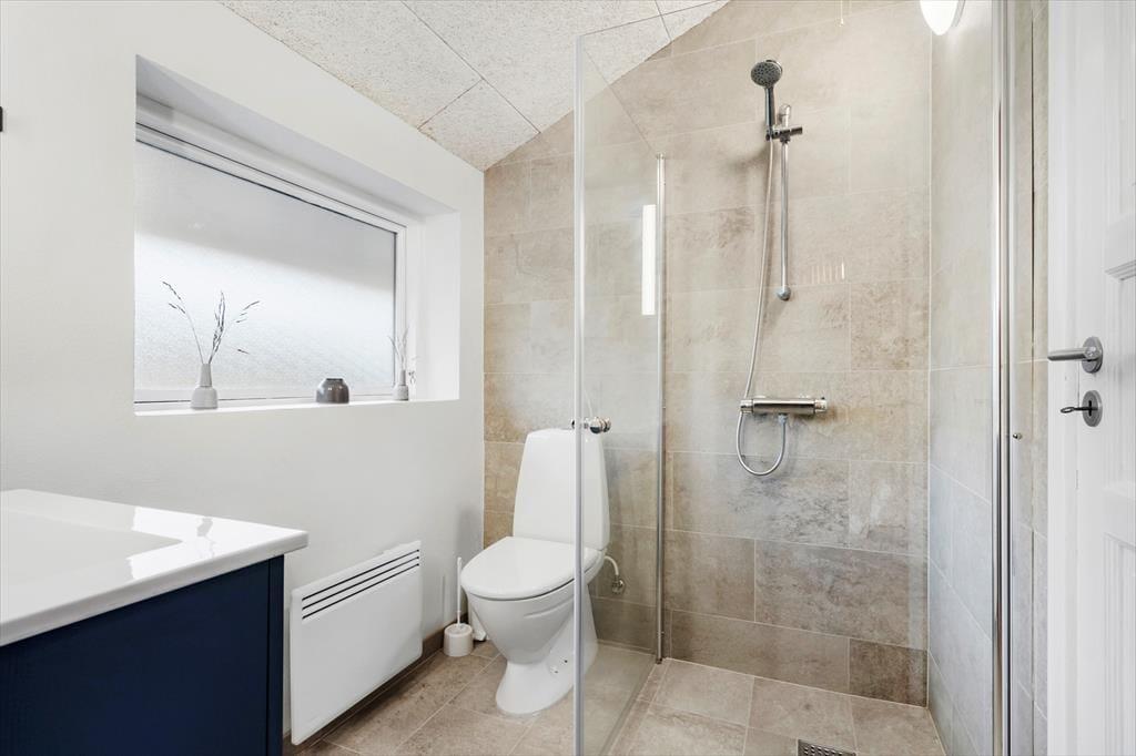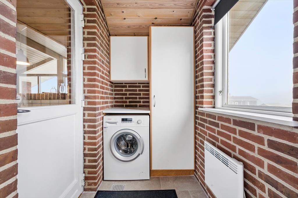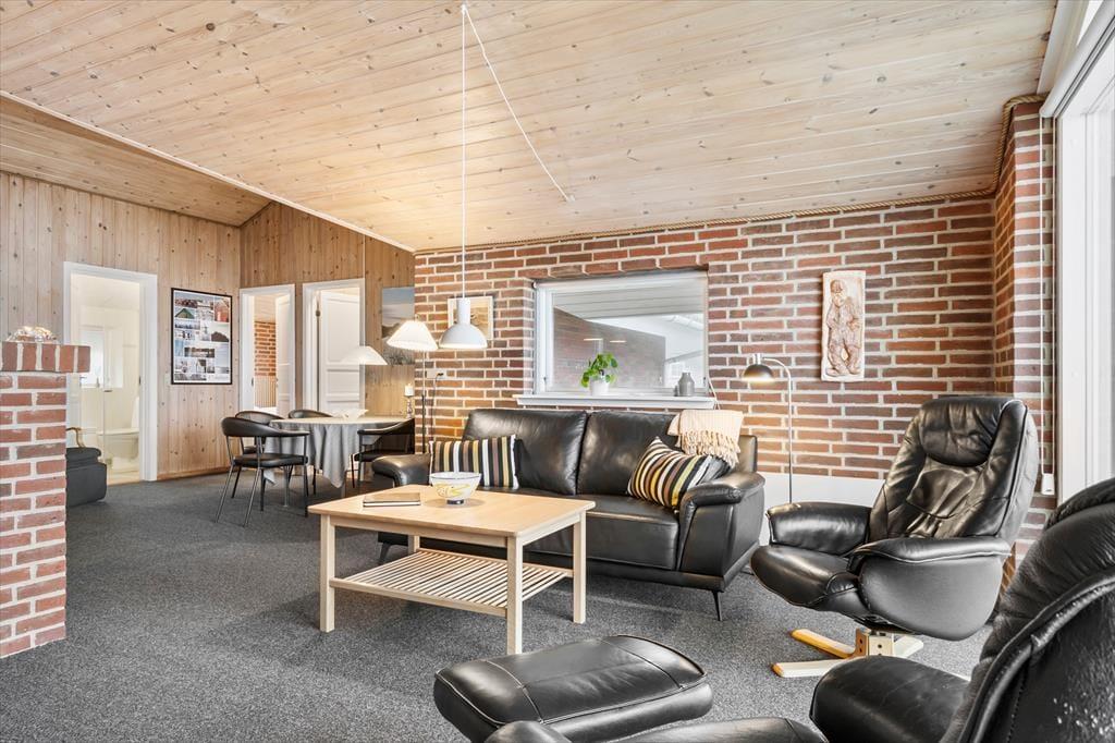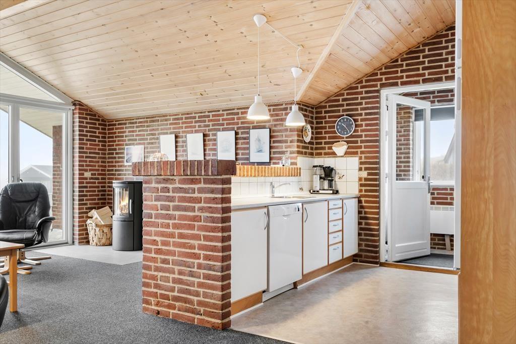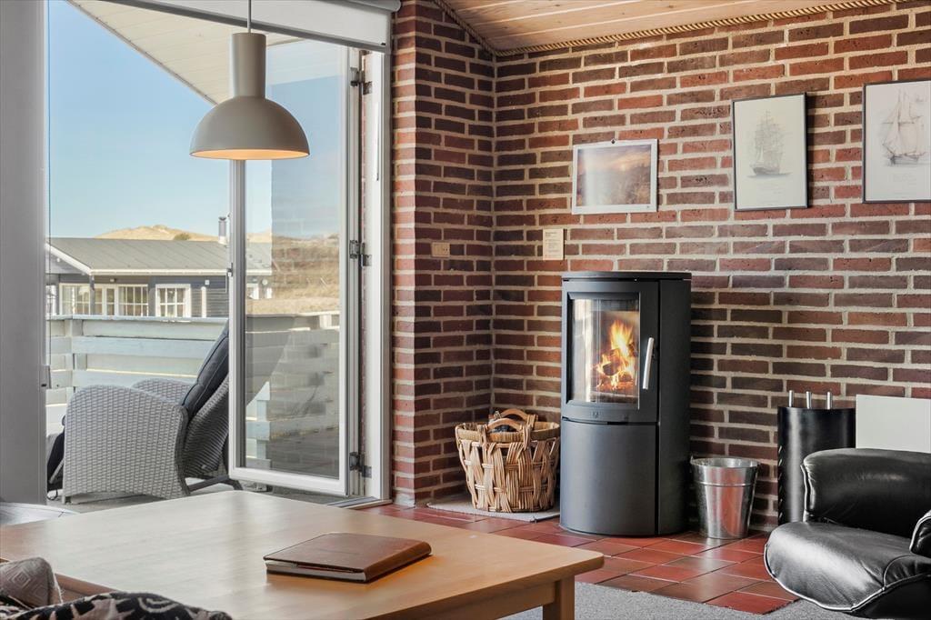 Feriehuset byder på tre store værelser, som tilsammen giver sengepladser til seks personer. I entréen er der god plads til sko, støvler og overtøj, og her er ligeledes en vaskemaskine samt praktisk fralægningsplads. Flisebadeværelset er indrettet med bruseniche, og med den tilstødende sauna får feriedagene wellness-faktor. Resten af ferieboligen består af opholdsafdelingen, der er opvarmet med en varmepumpe og en brændeovn. Det tosidede køkken giver god plads til at være flere kokke om at lave mad, og opvaskemaskinen gør rengøringen nem og bekvem. Retterne serveres let ved spisebordet, hvor I også har god plads til at spille brætspil eller planlægge morgendagens udflugter. Ved brændeovnen findes et sofaarrangement, hvor I kan se film eller læse den seneste krimi, men I kan selvfølgelig også nyde udsigten gennem det vestvendte vinduesparti til klitheden og “havbjergene” mod vest.
