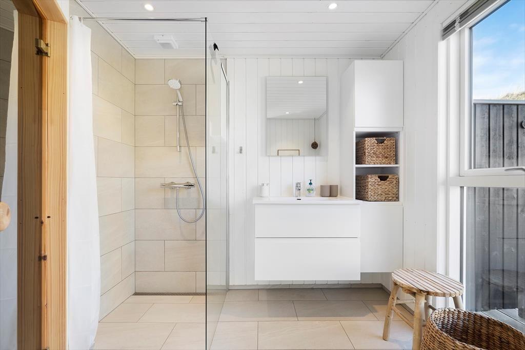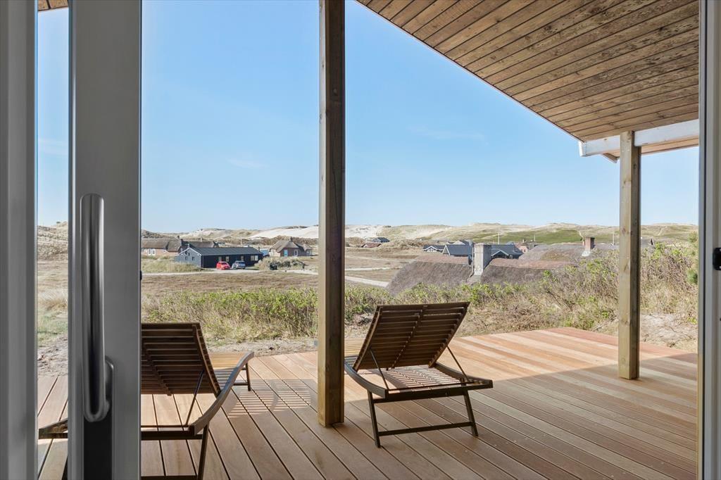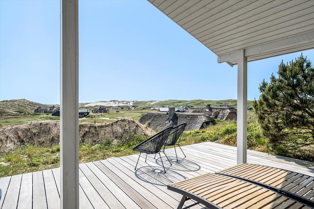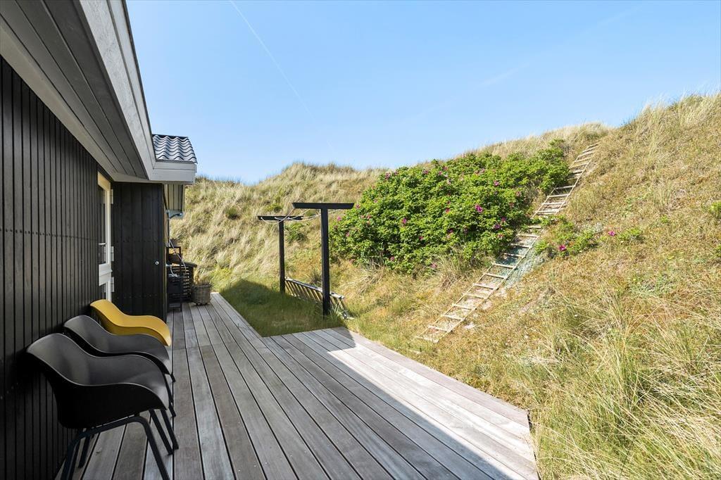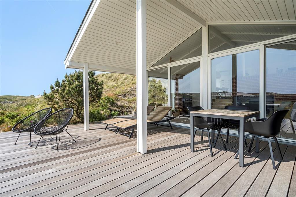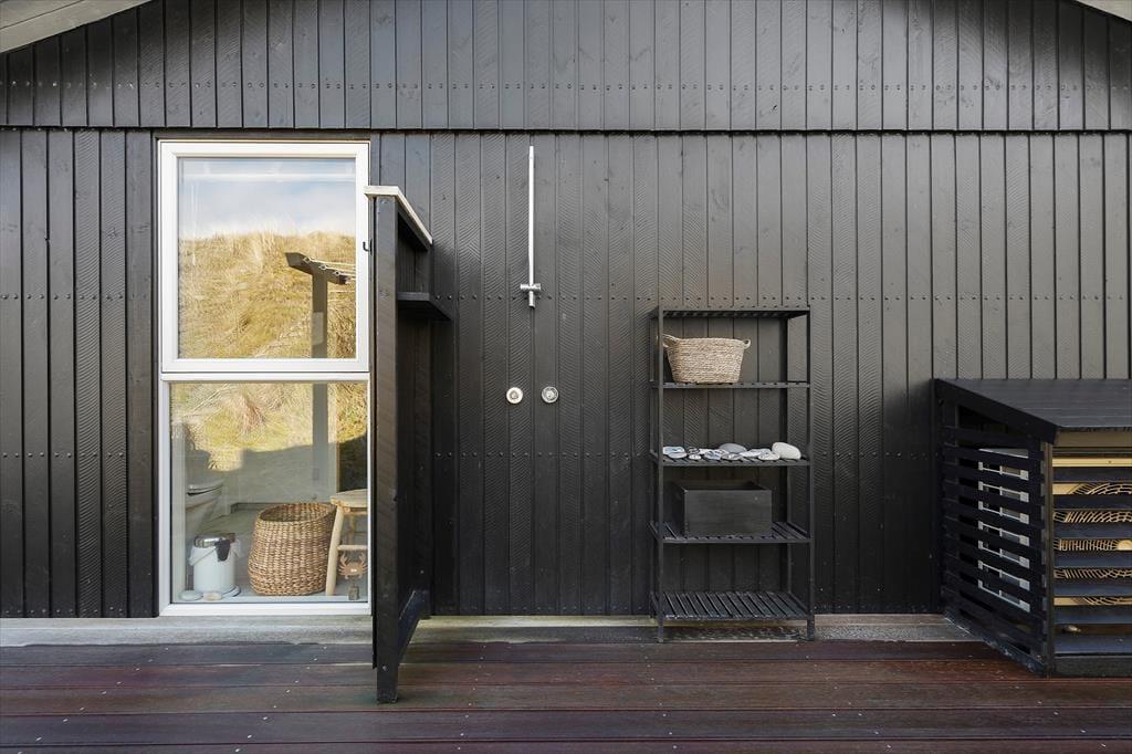 Mod øst, syd og vest har I glæde af terrasser i forskudte niveauer, og her kan I nyde sommerdagene i liggestolene, ligesom I kan servere alle dagens måltider og kølige drikke i solens varme skær. Som fra huset har I her en pragtfuld udsigt over området, og den bliver kun flottere, når I går op på klitten bag huset, som også giver terrasserne læ. Ligeledes er her en praktisk udebruser, så I kan skylle sand og saltvand af efter strandturen.