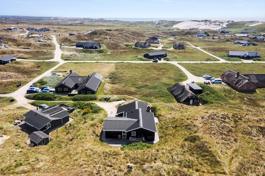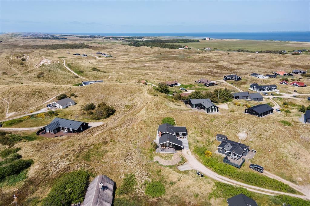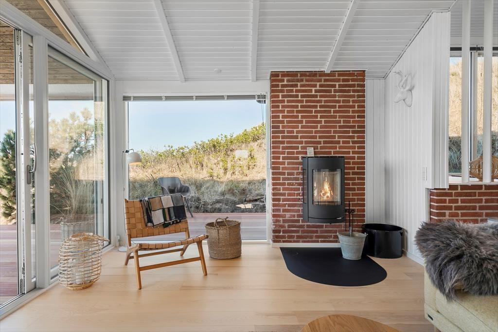 Huset ligger højt i landskabet, og derfor har I en skøn udsigt over det omkringliggende landskab, som herude på det yderste af vestkysten består af klithede. Udsigten kan I nyde i feriehusets skønne opholdsstue, hvor brændeovnen giver en hyggelig atmosfære og en behagelig temperatur, mens vinduespartier fra gulv til loft trækker udsigten og naturen ind. Stuen ligger i forskudt niveau, men med åben forbindelse til køkken-alrummet, der med store vinduespartier også har en lys, luftig atmosfære og en skøn udsigt. Det moderne køkken giver god plads til at være sammen om at lave lækre retter, som let serveres ved spisebordet, hvor I også har god plads til at dyste i brætspil. Sommerhuset byder på tre soveværelser med sengepladser til ialt 4 personer. Foruden entréen findes her også et badeværelse med bruseniche, gulvvarme og sauna.