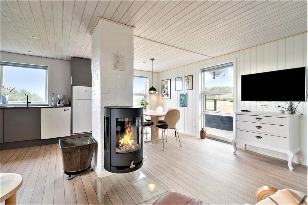 Feriehuset er lyst og venligt indrettet, og i opholdsafdelingen ligger køkkenet og stuen i åben forbindelse. Køkkenet er veludrustet og har god plads til, at I kan være flere kokke om madlavningen, og opvaskemaskinen gør den efterfølgende afrydning nem og bekvem. Stuen er indrettet med et spisebord og et sofaarrangement, og her har I god plads til at hygge med lækre måltider, gode film eller en bog og en varm kop te, mens ilden knitrer i brændeovnen. Huset byder på to gode soveværelser med i alt fire sengepladser, og badeværelset er indrettet med bruseniche og gulvvarme.