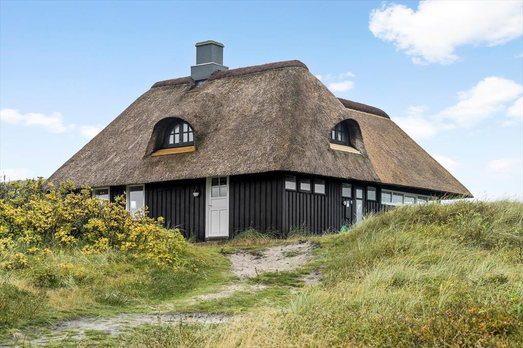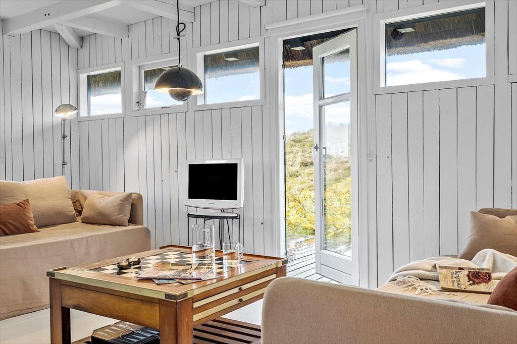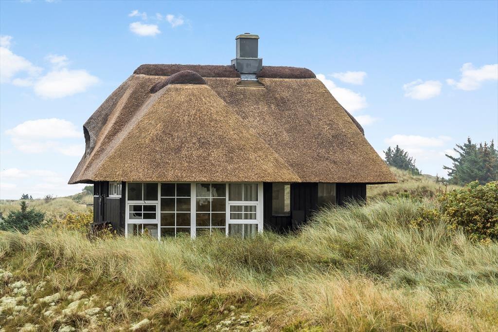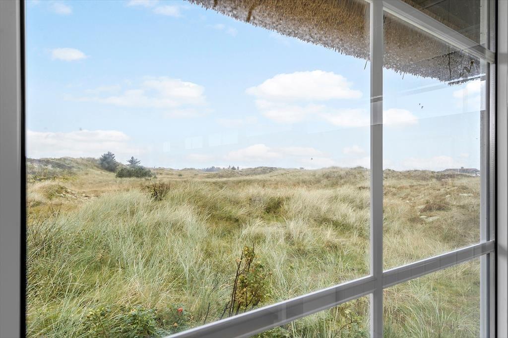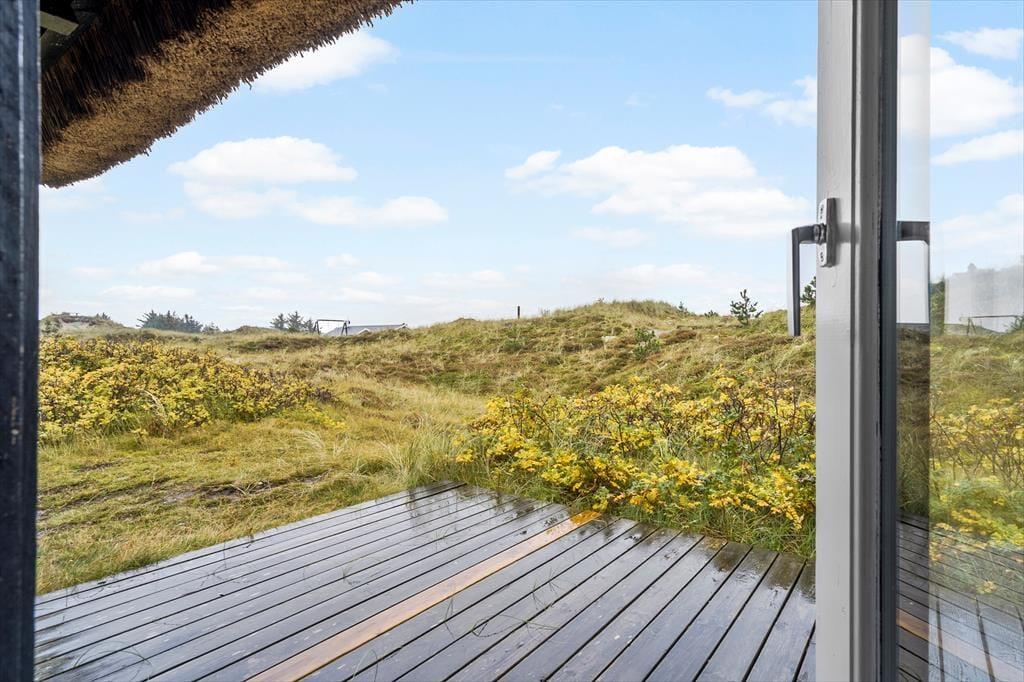 Ude i det fri får du rig mulighed for at nyde de smukke omgivelser og den fredfyldte atmosfære på den store naturgrund. Det stråtækte sommerhus passer godt ind i det kuperede landskab, og på den sydvestvendte træterrasse kan du sidde uforstyrret med kaffen eller solbade fuldstændigt i fred, for klitterne skærmer udearealerne helt af. Du kan med andre ord føle dig ét med naturen og komme ned i tempo, når du sidder her, og hvis du drømmer om at fordybe dig i gode bøger og holde siesta hver eneste dag, kan det passende foregå her. Trænger du til lidt mere udsyn, kan du gå op på det højeste punkt på grunden, hvor du har kig til Ringkøbing Fjord, der breder sig få hundrede meter væk.