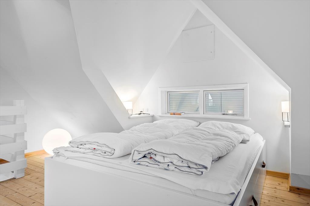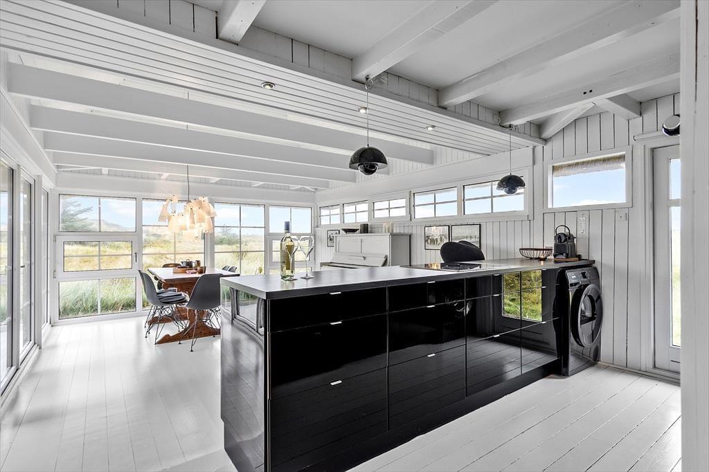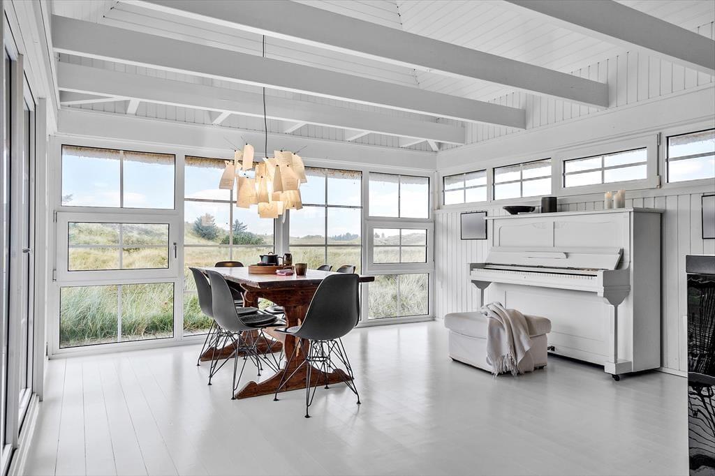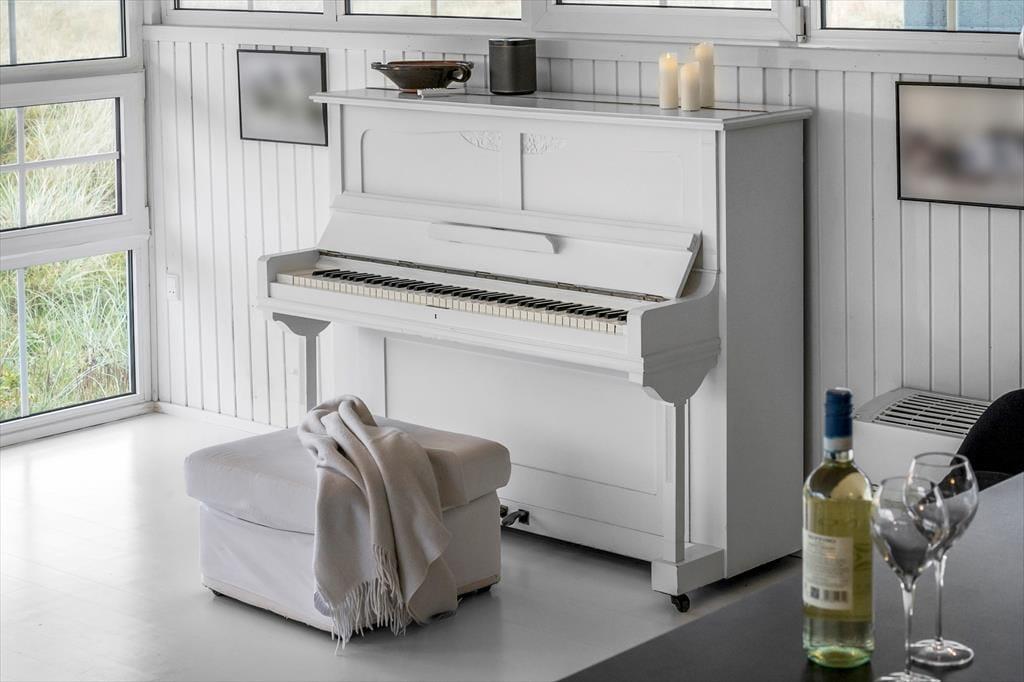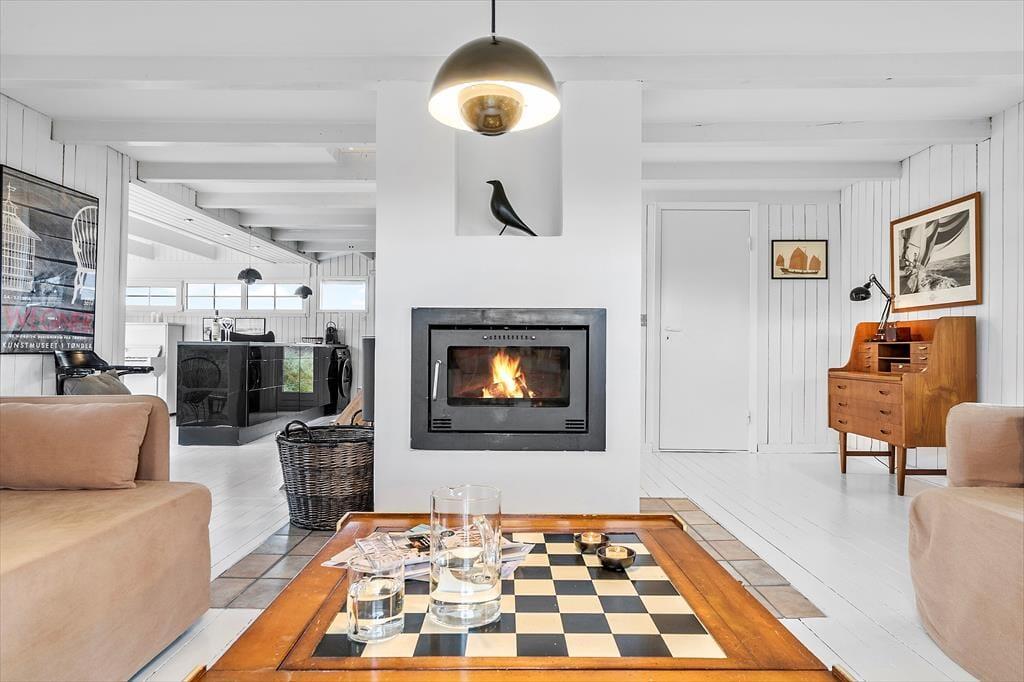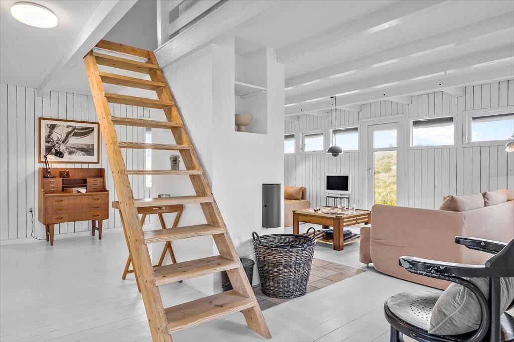 Inden døre i sommerhuset kan du straks føle dig hjemme i de lyse og indbydende omgivelser. Der er 100 m2 at gøre godt med fordelt på to etager, og du kan derfor oplagt være her med din lille familie – hvis ikke det er en romantisk ferie med din bedre halvdel, du ser frem til. I stueplan ligger et flot og veludstyret køkken centralt placeret i den åbne opholdsafdeling, og til den ene side finder du en hyggelig sofaafdeling med indbygningspejs, mens der er spiseplads og sågar et klaver på den anden side. Med sine store vinduespartier minder spiseafdelingen nærmest om en udestue, og du kan roligt glæde dig til at sidde her med fri og uforstyrret udsigt til det smukke klitlandskab. Et badeværelse med lille badekar ligger også i stueplan, mens førstesalen rummer sengepladser til fire personer. Bemærk, at der er åben forbindelse mellem de to soveafsnit, men takket være halvmuren er der skærmet af – og så er der for øvrigt fjordkig fra etagens små vinduer.