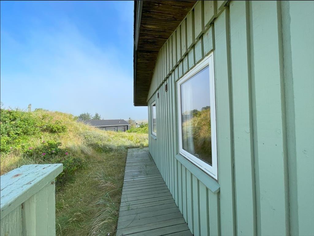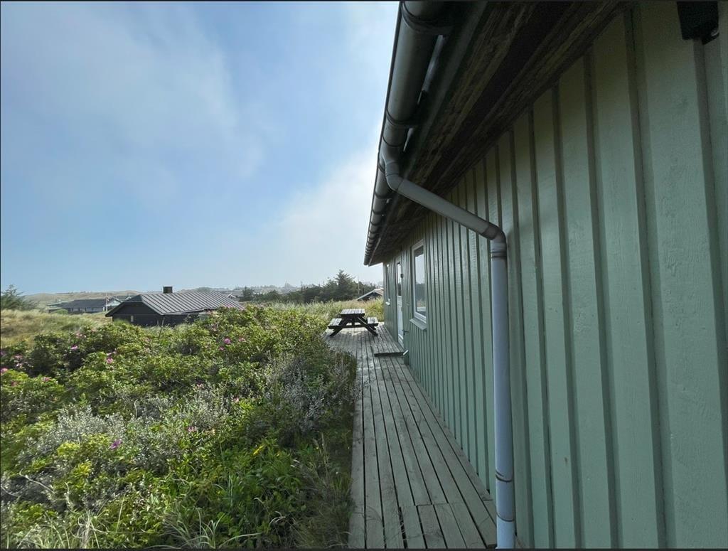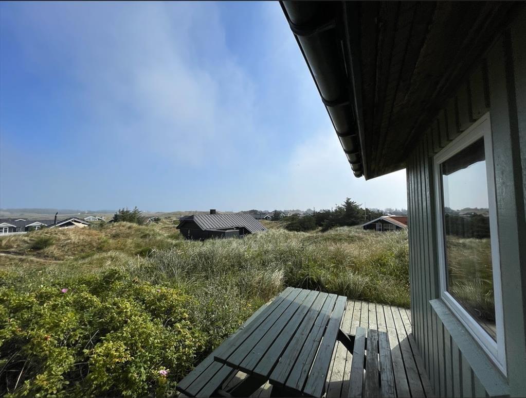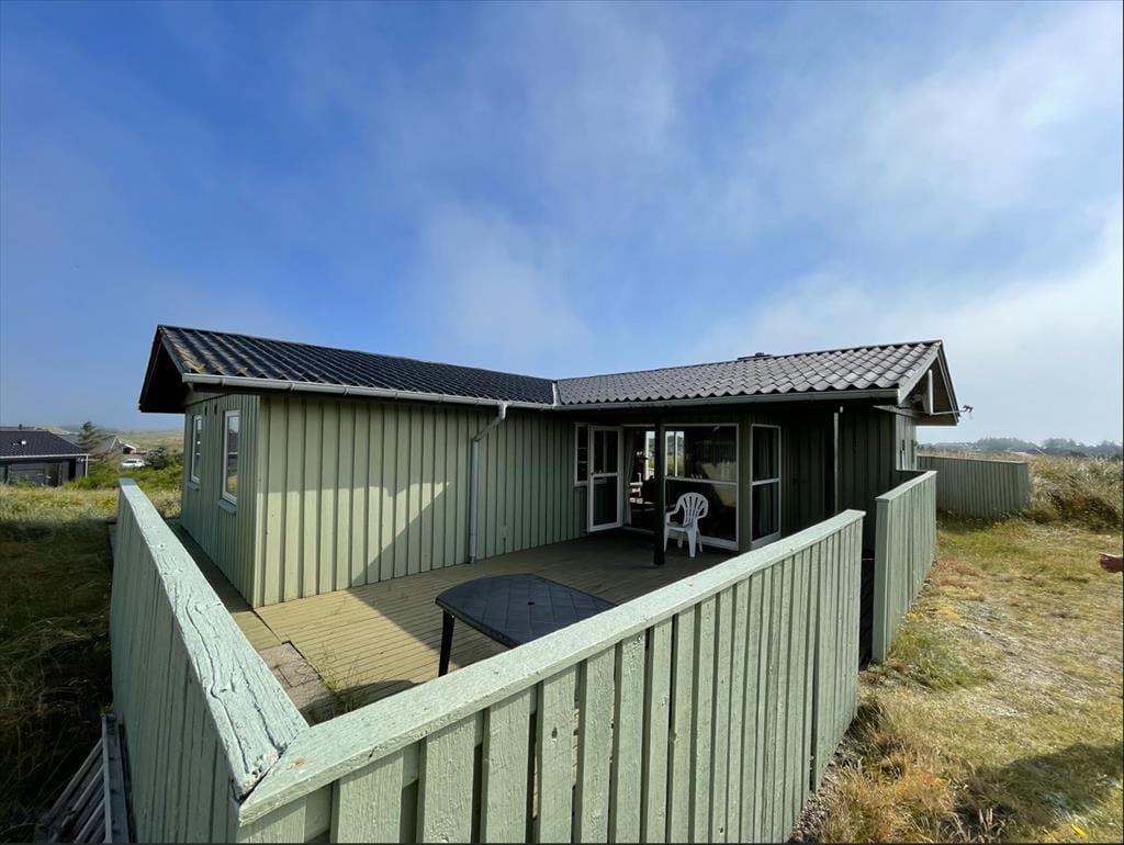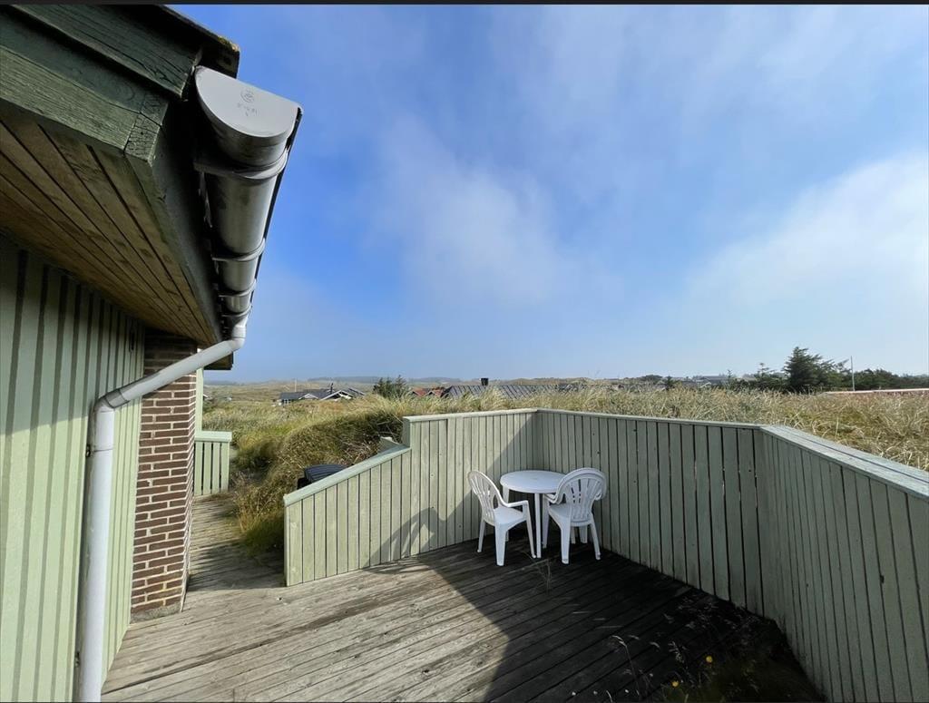 Udendørs fortsætter feriestemningen. Sommerhuset er omgivet af flere terrasser, så I altid kan finde læ – uanset vindretningen. Mod vest kan I nyde aftensolen og udsigten over det bølgende klitlandskab, mens I på østsiden kan drikke morgenkaffen i solopgangen og skue ud over Ringkøbing Fjord. Den høje beliggenhed giver en særlig følelse af frihed, og her kan børnene lege trygt, mens de voksne finder ro i liggestolen. For os er det netop det, der gør Riskrogvej 18 C så unikt – her får man privatliv, udsigt og ægte feriestemning i ét.