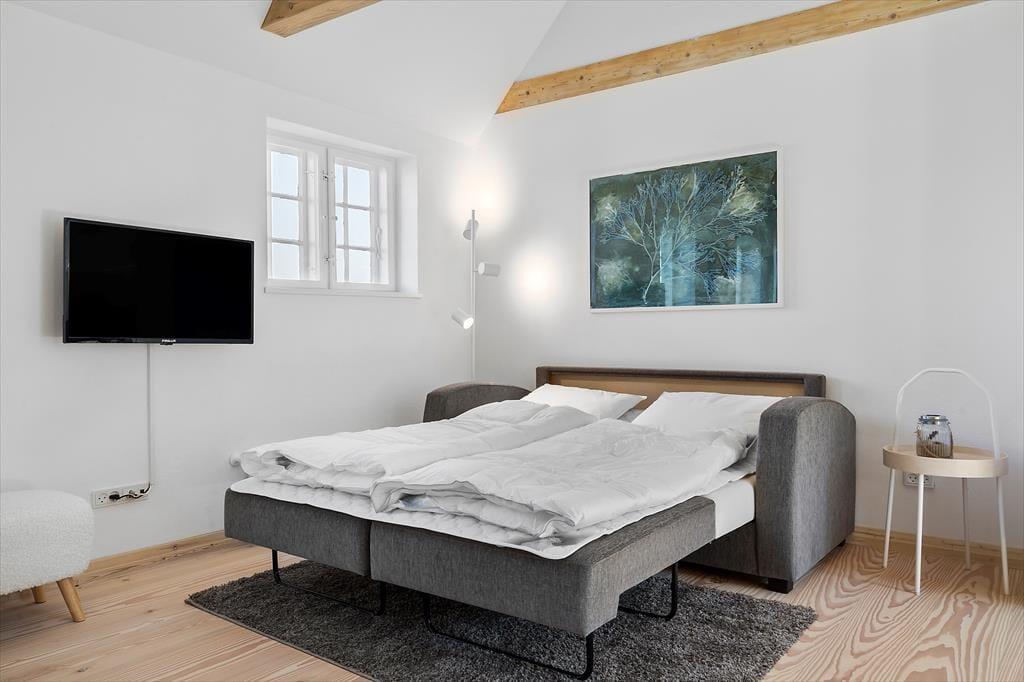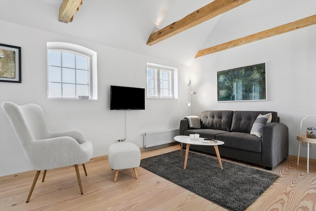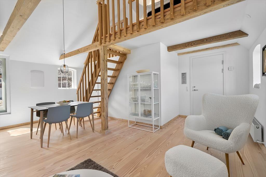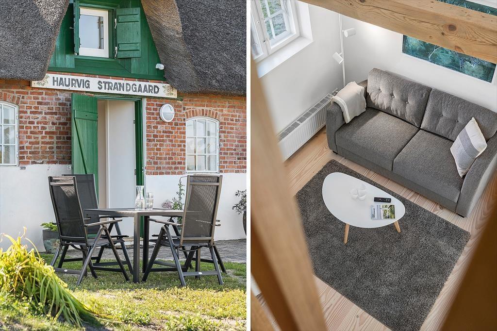 Haurvig Strandgaard, som den stråtækte klitgård hedder, har ligget her helt tilbage siden 1850. Gennem årene er gården blevet udvidet til at være firelænget, og i 2023 har en arkitekt omdannet den østvendte længe til tre moderne ferielejligheder. Netop denne lejlighed måler 30 m2 og har plads til 2-4 voksne og familiens hund er også velkommen. To af sengepladserne finder I på hemsen, og der er også to sengepladser i form af en dobbelt sovesofa i stuen. Det er et dejligt opholdsrum med stilfuldt møblement og en skøn atmosfære, og et åbent køkken er på velfungerende vis integreret i rummet, så madlavningen nemt kan indgå i feriehyggen. Et flot badeværelse hører med til planløsningen, mens entréen deles med nabolejligheden. Så begge er oplagte at booke, hvis I rejser 2 familier sammen.