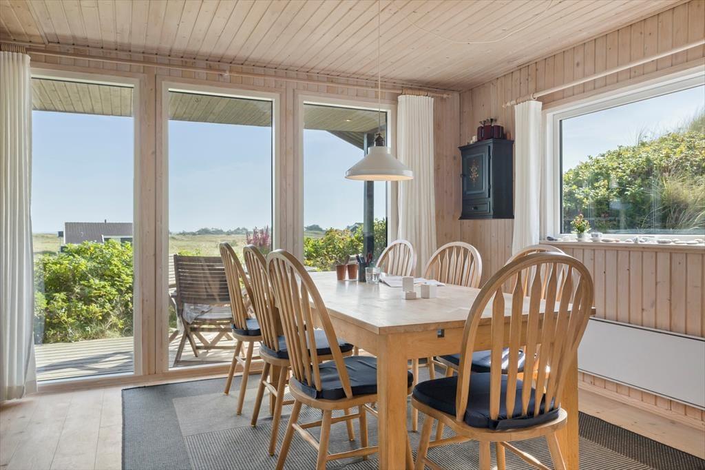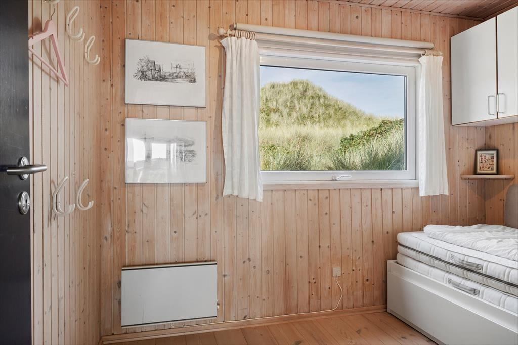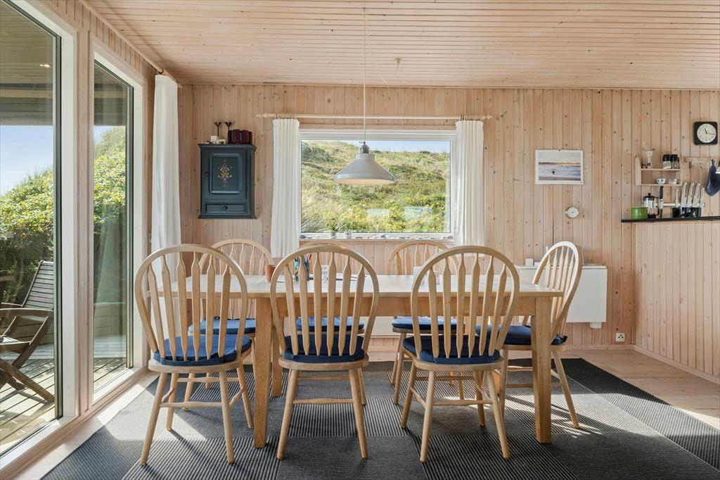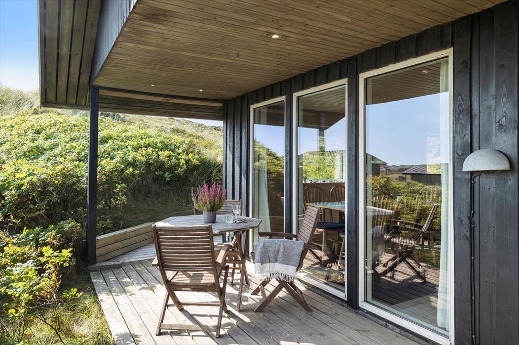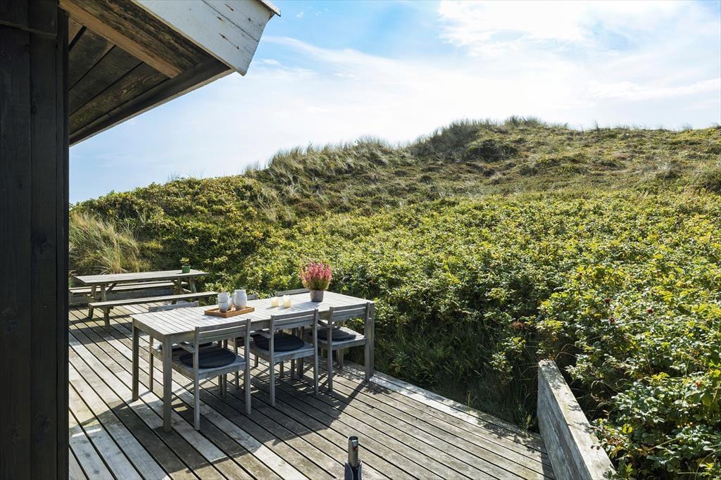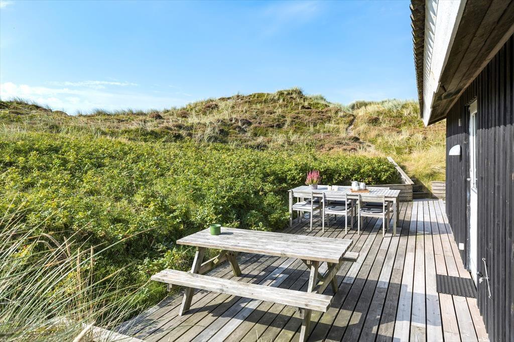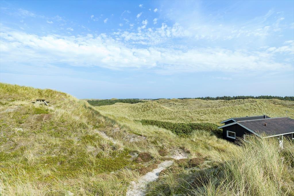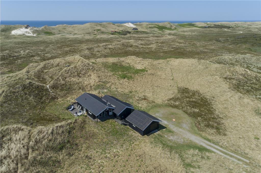 På den 2362 m2 store naturgrund bor I flot og fredeligt for enden af en lukket vej. Rundt om sommerhuset kan I følge med solen, hvis I flytter jer fra terrasse til terrasse – og lige fra morgen til aften kan I finde en dejlig opholdsplads i læ af klitterne eller med udsigt til det åbne landskab. Fra huset går en lille sti op til en klittop, hvor I kan sætte jer på udsigtsbænken og lade jer betage af panoramavuet. Står I tidligt op, kan I hilse solen godmorgen her fra udkigsposten, og sidst på dagen kan I vinke godnat, når solen sænker sig bag klitterne mod vest.