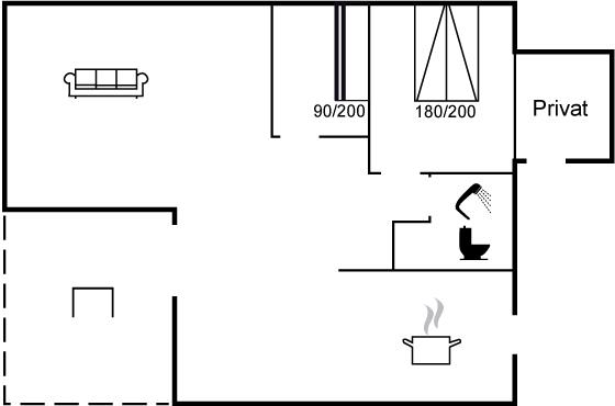 Køkkenet er udstyret med 1 køleskab. Der er 1 gasblus, varmluftovn samt opvaskemaskine.
