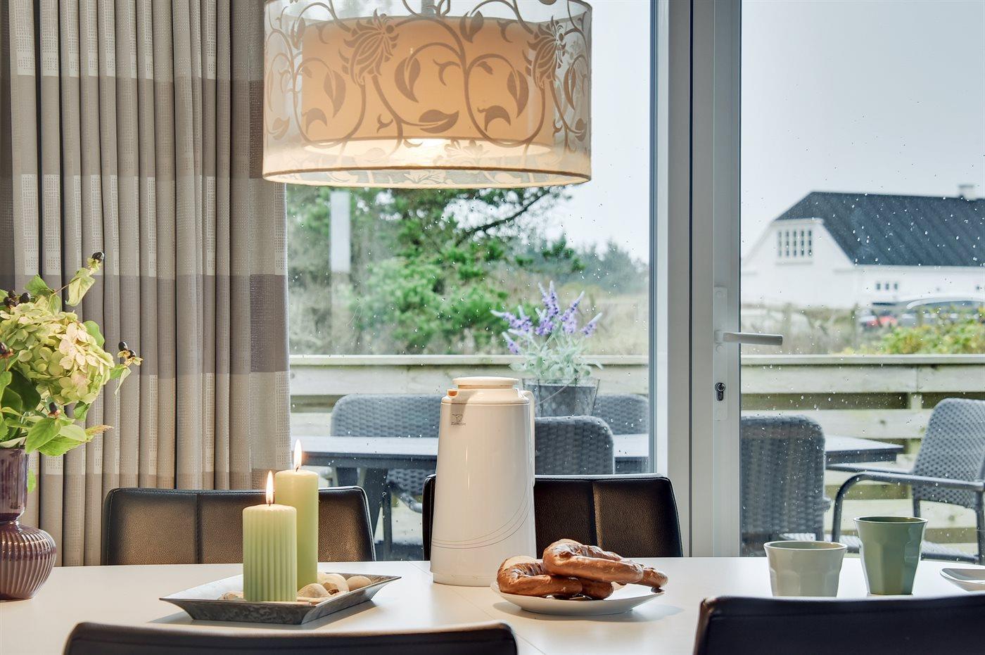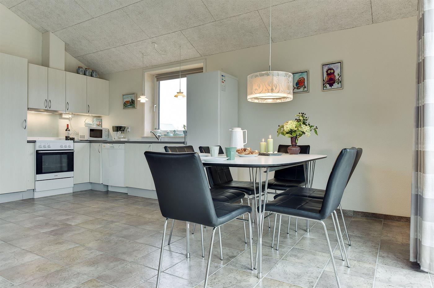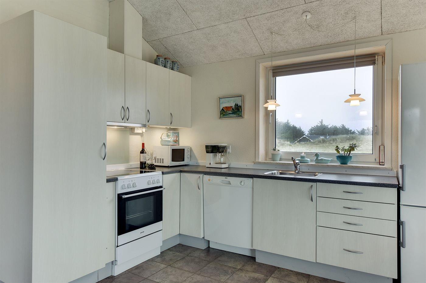 Køkkenet er udstyret med 1 køleskab. Der er 4 keramiske kogeplader, varmluftovn, mikrobølgeovn samt opvaskemaskine.