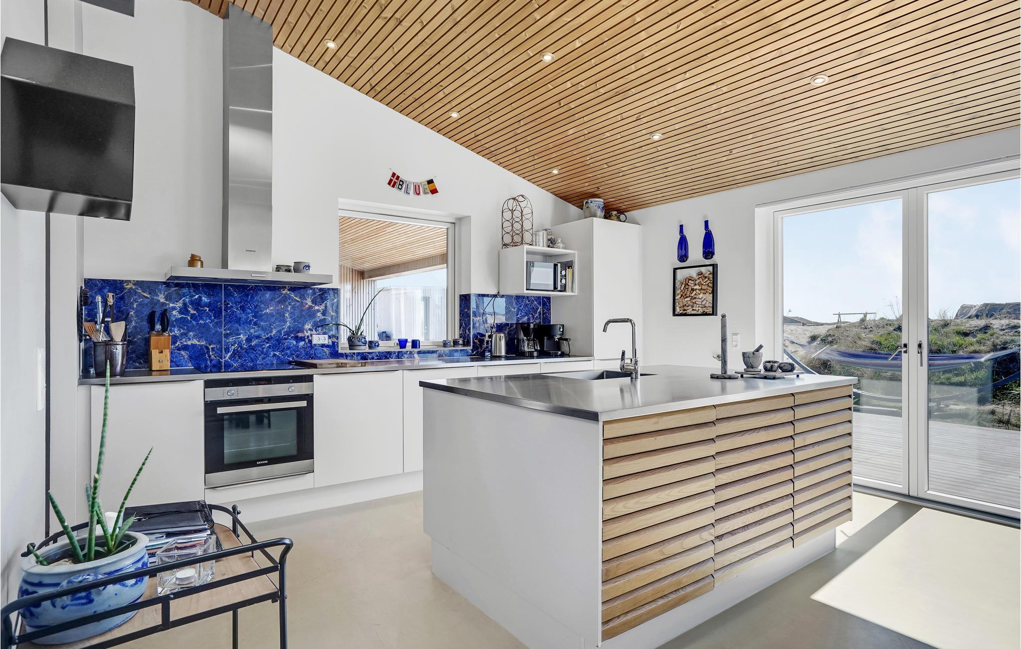Velkommen til dette lækre feriehus med plads til en stor familie og en hund. Huset er meget rummeligt, lyst og gennemgående smagfuldt indrettet i den maritime farvekombination af hvid, havblå og naturfarver. Takket være en åben planløsning kan I bevæge jer frit mellem det store, veludstyrede køkken, spisepladsen og det hyggelige opholdsområde med brændeovn, så I aldrig behøver at undvære hinandens gode selskab.
