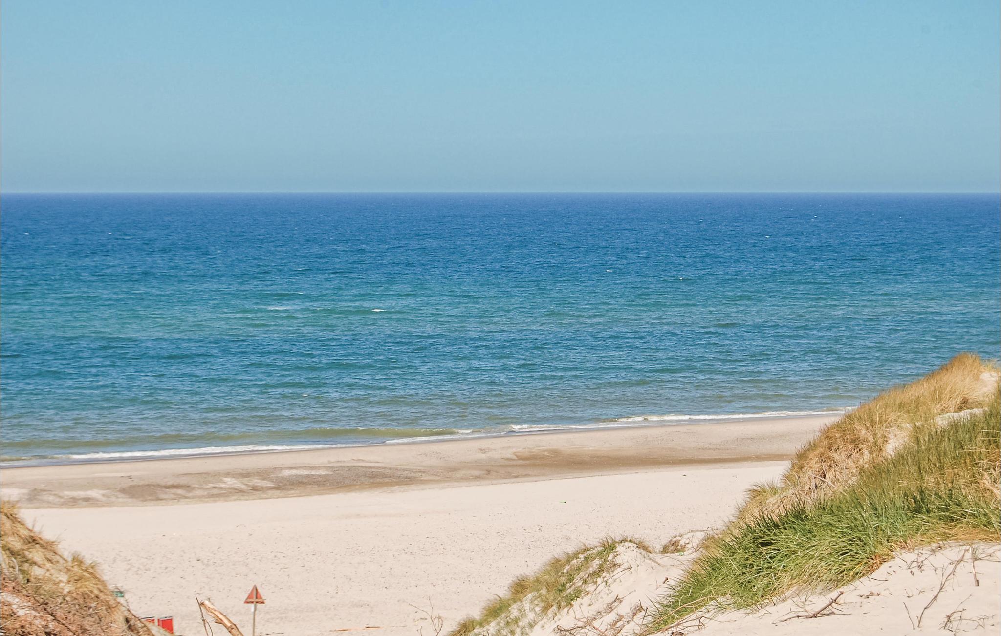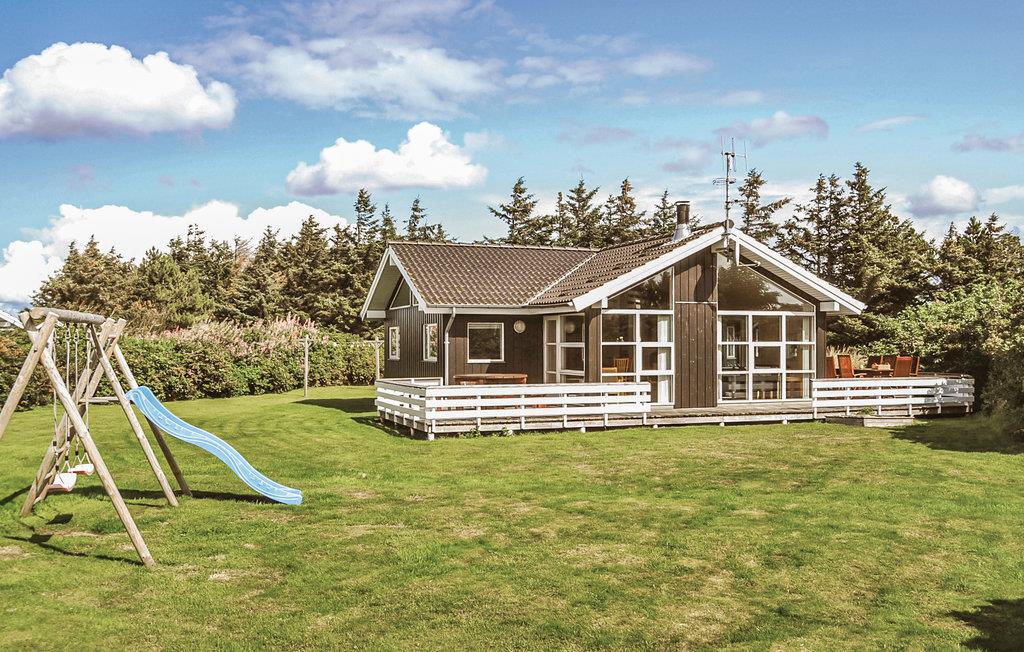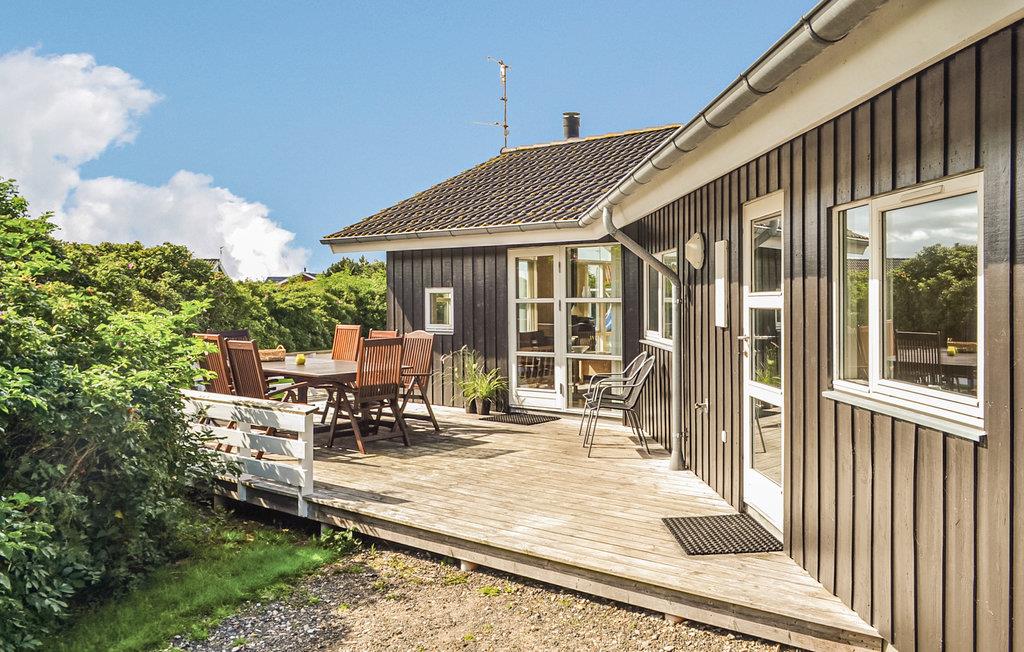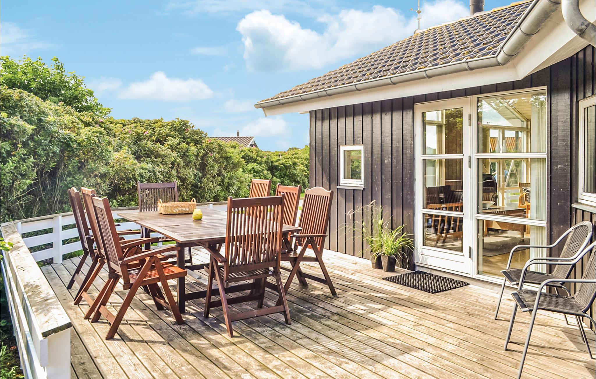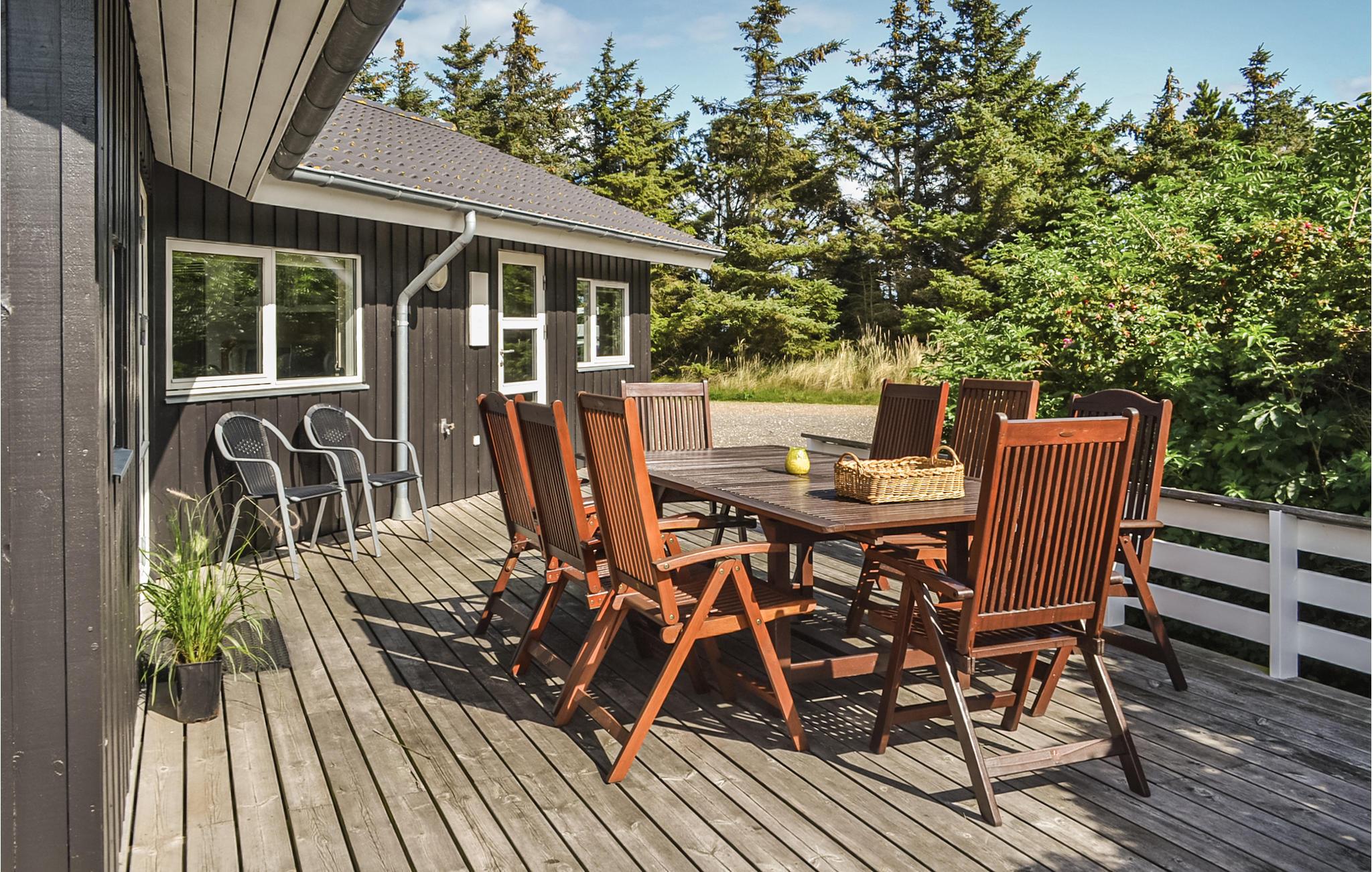 Spændende og anderledes indrettet feriehus. En alternativ arkitektur med en masse skæve vinkler, som man normalt ikke oplever i et feriehus. De store vinduer gør stuen ekstra lys og venlig. Der er træ- og klinkegulve overalt. Til børnene er der en god, lille hems, som både kan bruges som sove- og legeplads. De store, gode terrasser er et skønt opholdssted, når solen skinner. Tæt ved huset finder I såvel hav og fjord som store, øde klitområder. Der er ikke langt til ridecenter med hesteudlejning.