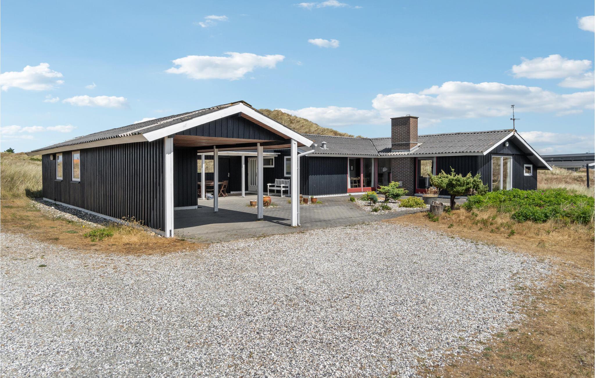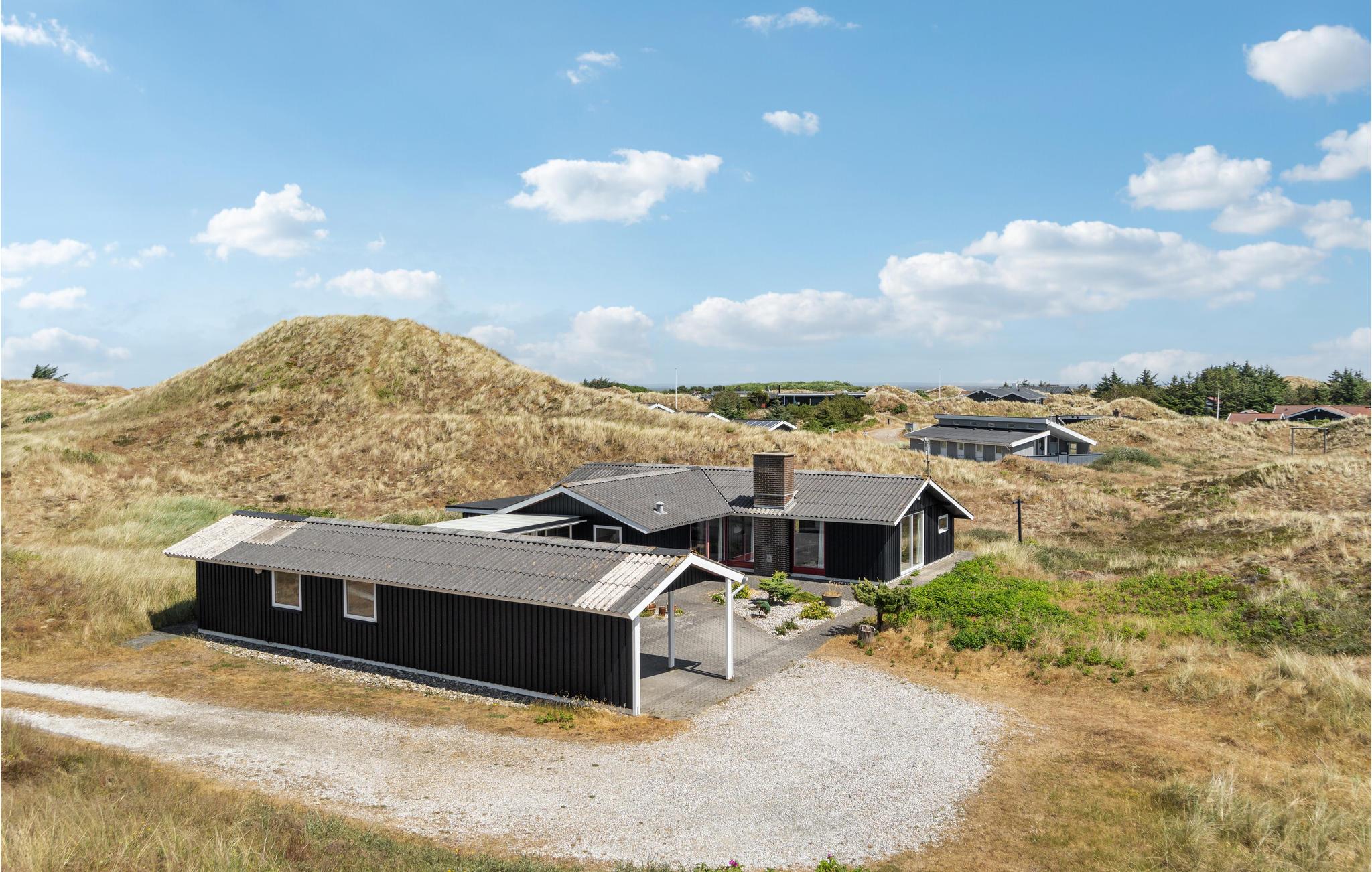 Hyggeligt feriehus på stor klitgrund nær Vesterhavet og Ringkøbing Fjord med brændeovn og overdækket terrasse.