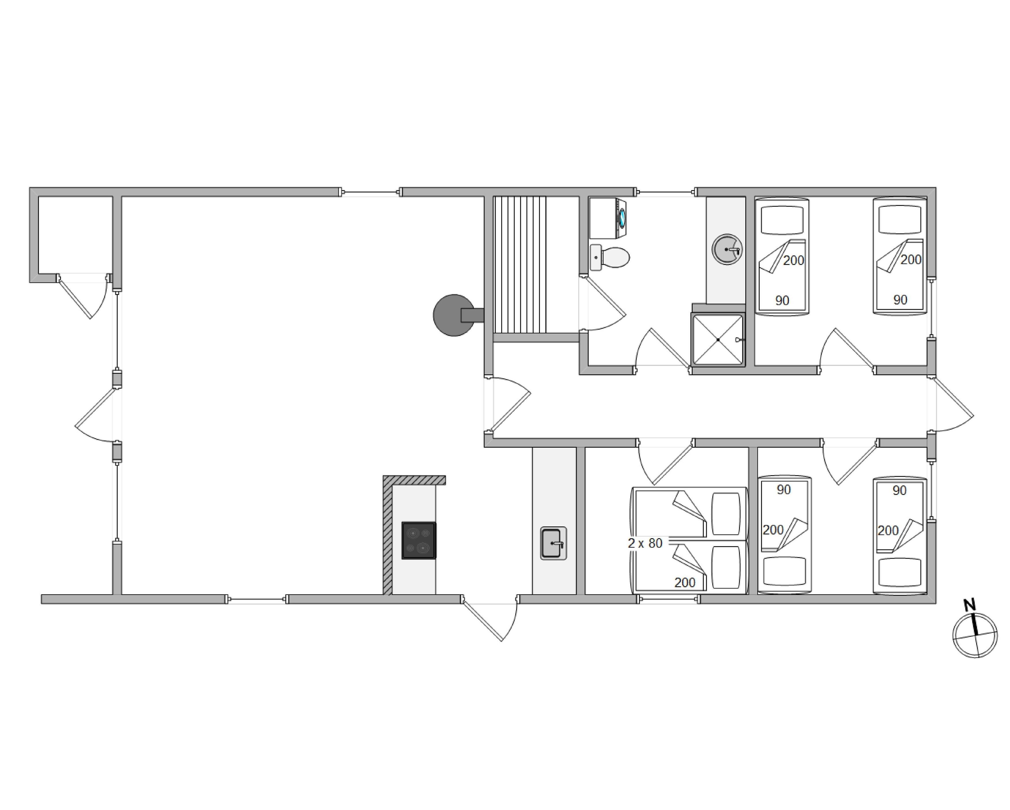 Sommerhuset byder på 3 soverum, som er indrettet med 1 dobbeltseng og 4 enkelte senge. Dette giver plads til 6 personer, så både familie og venner kan nyde samvær i de indbydende omgivelser.
