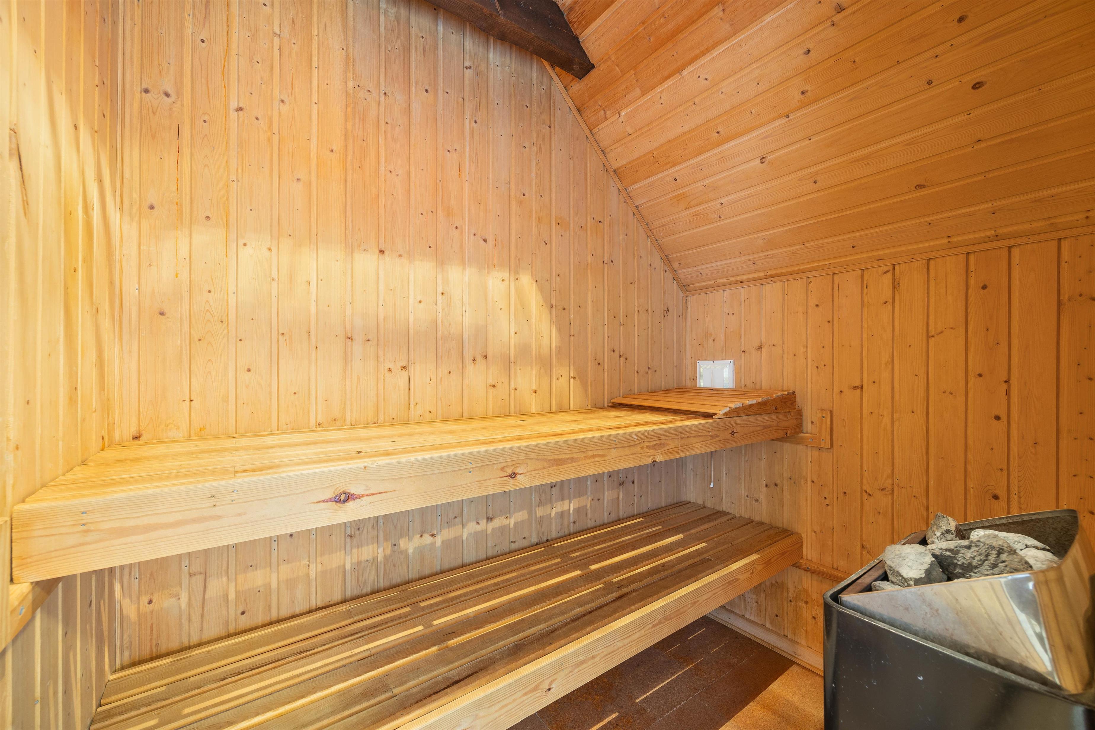 I stuen er der en hyggelig atmosfære med en brændeovn, der spreder varme og en hjemlig følelse på kølige aftener. Ligeså sikrer gulvvarmen på badeværelset en komfortabel oplevelse fra morgenstunden. Efter en lang dag med eventyr og udforskning er saunaen det perfekte sted til afslapning.