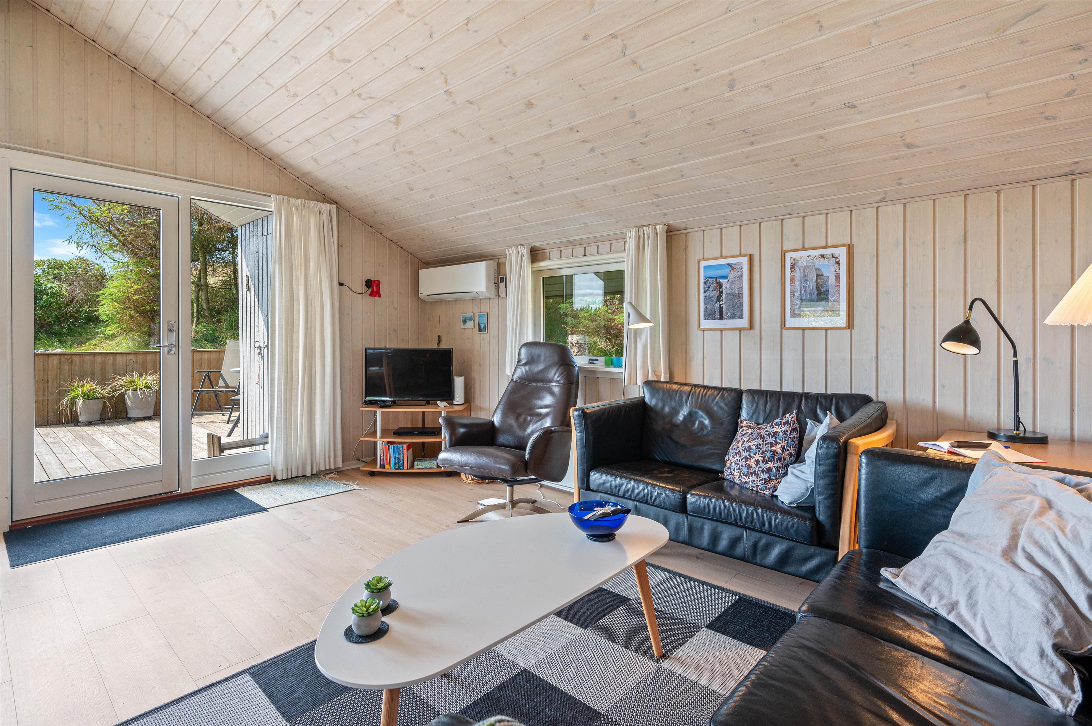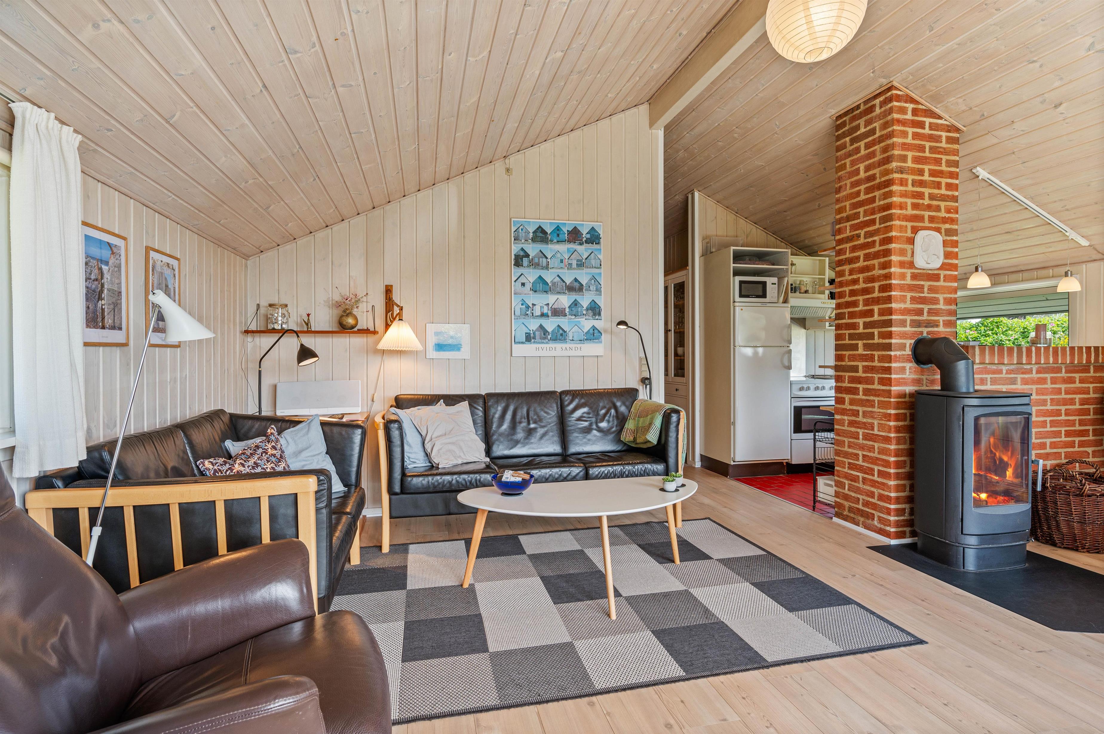 Indretningen i feriehuset er typisk for et dansk sommerhus. Det har en personlig og charmerende indretning, som er lys og imødekommende. Kontrasten mellem de varme murstensvægge ved brændeovnen og de lyse træpaneler på vægge og lofter skaber en god og hjemlig atmosfære i det store opholdsrum.