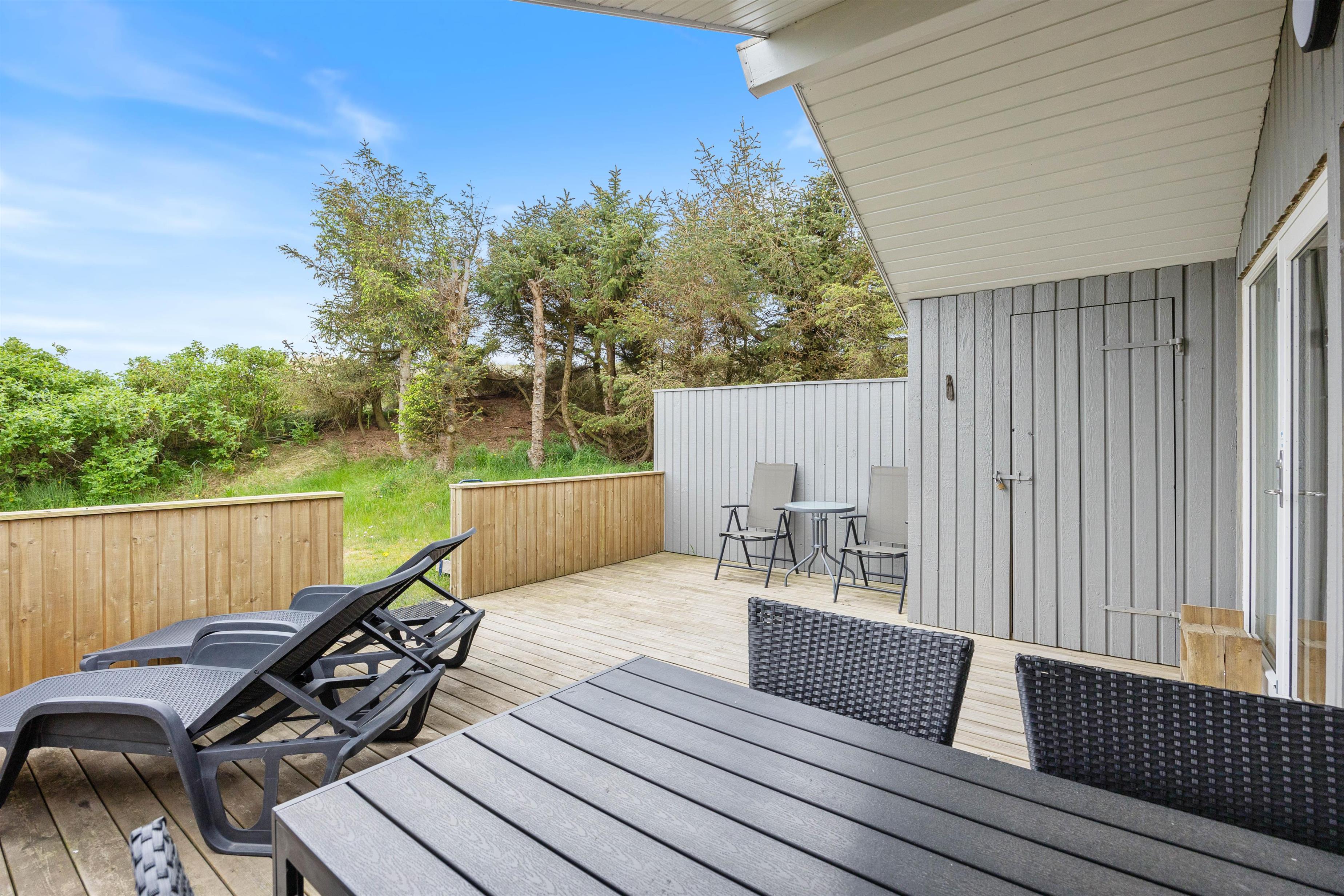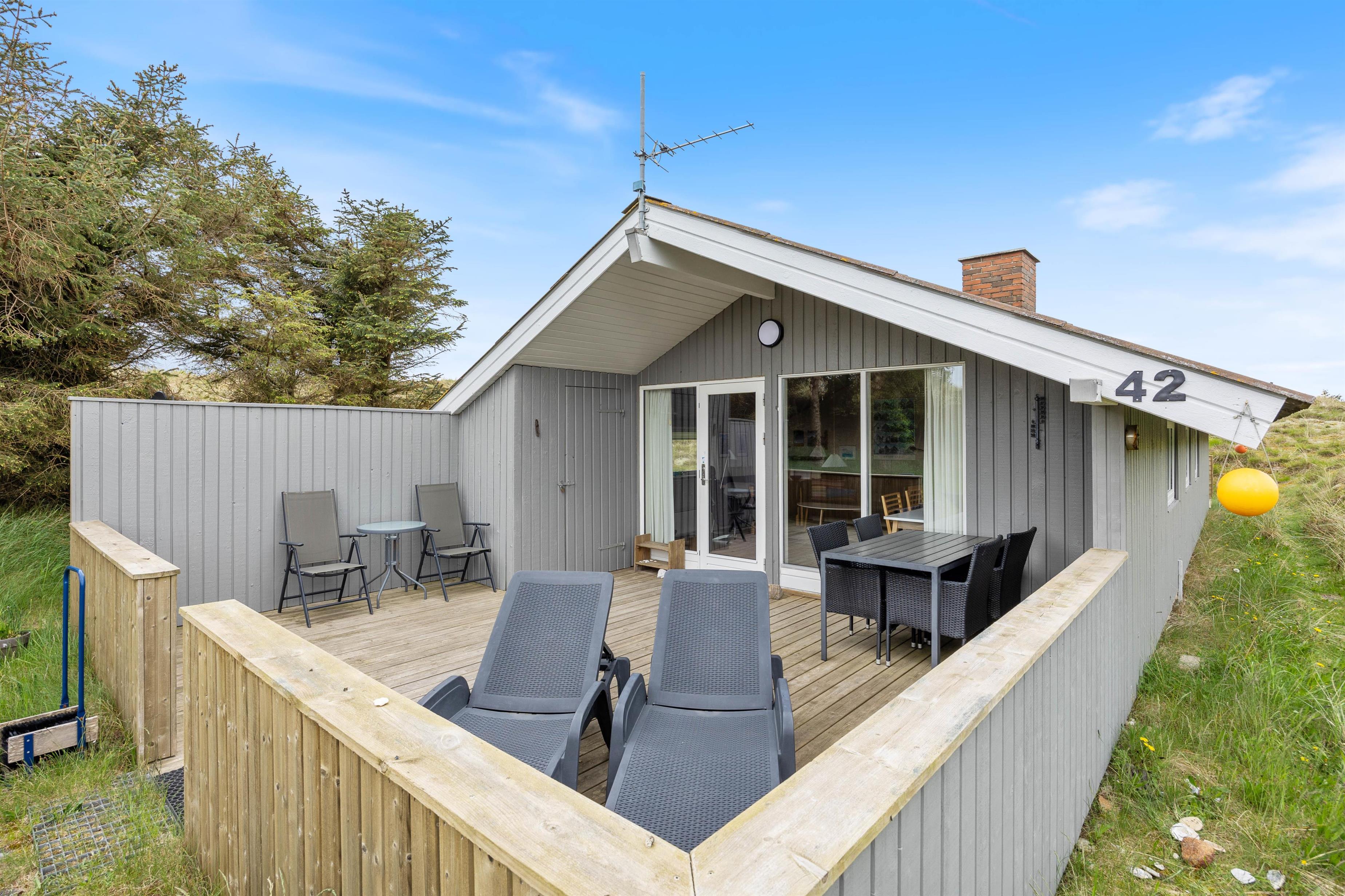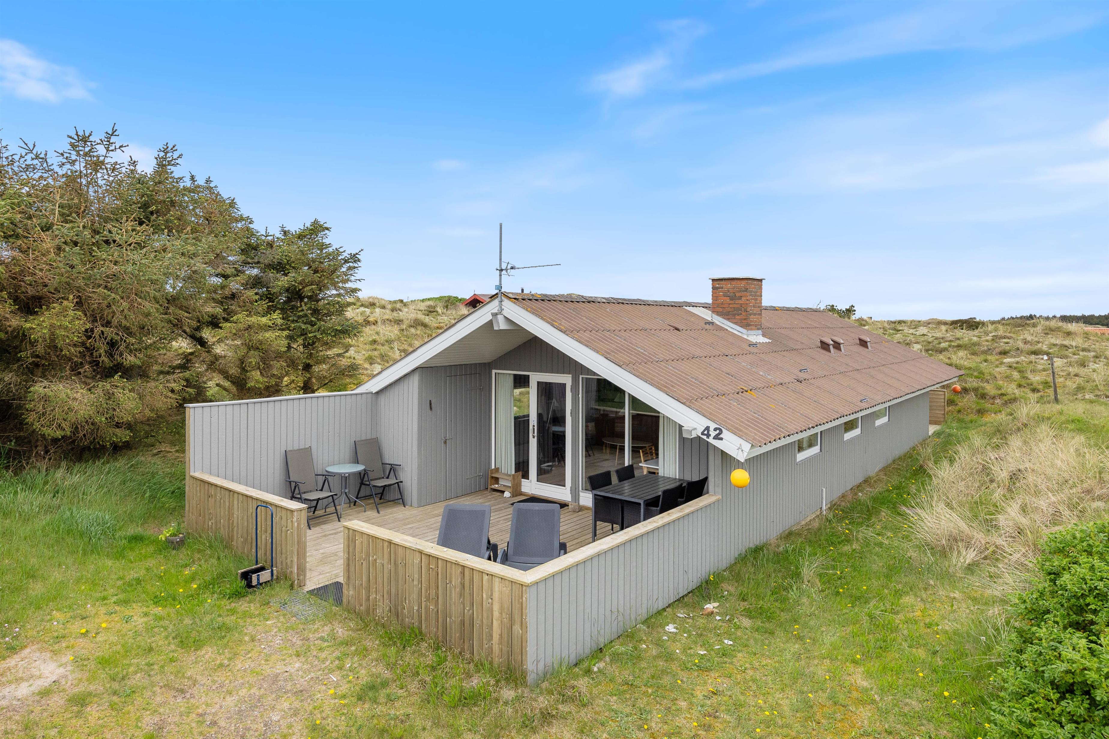 Ferie ved Vesterhavet er lig med klitter, sand og vand. Her er der højt til loftet, ren, frisk luft og masser af oplevelser i naturen. Til dette sommerhus hører hele tre gode terrasser. Her kan I sidde i havemøblerne med en god bog, nyde morgenkaffen eller surfe på det gratis trådløse internet, mens I nyder naturen på den flotte naturgrund.