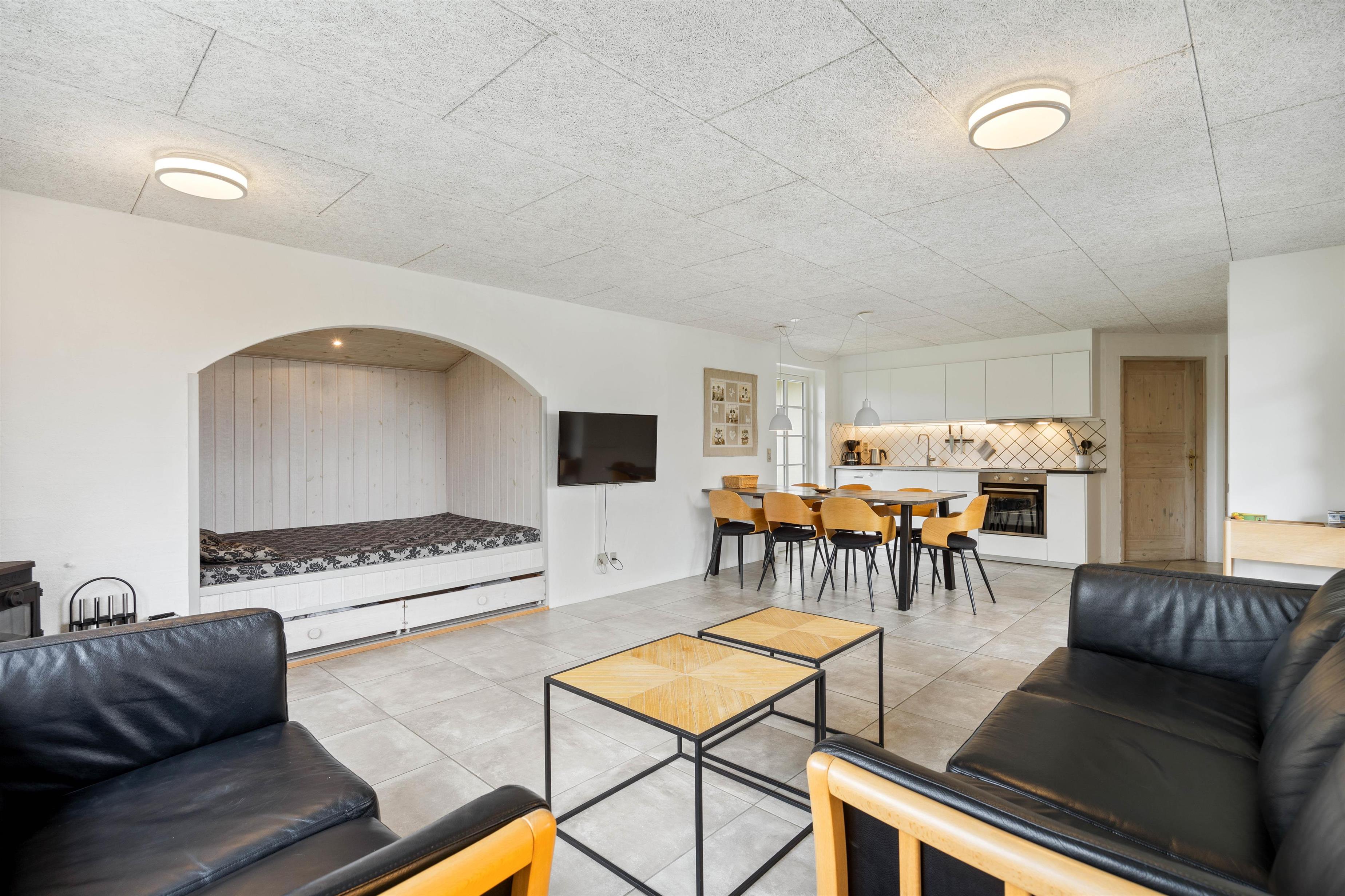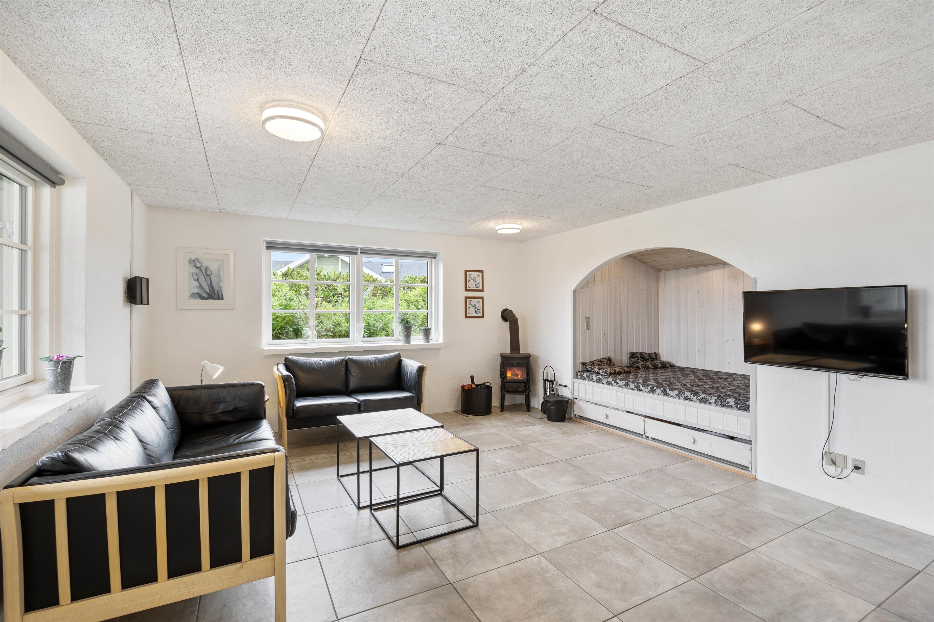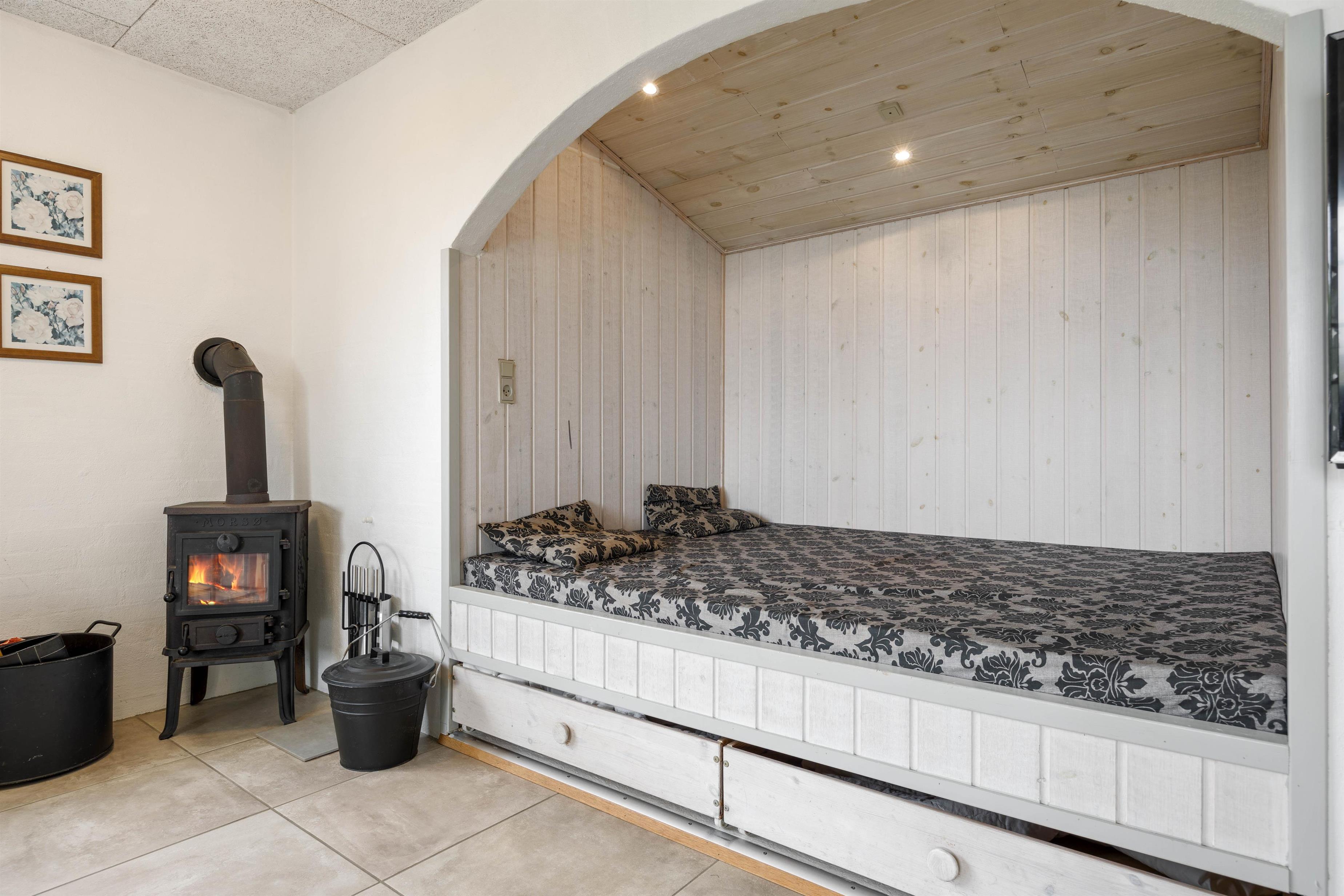 Indretningen i sommerhuset er lys og indbydende. I stuen er en hyggelig alkove, som er perfekt til afslapning på langs. Børnene vil også elske at bruge alkoven som en lille “hyggeoase” i stuen, hvor de kan lege.