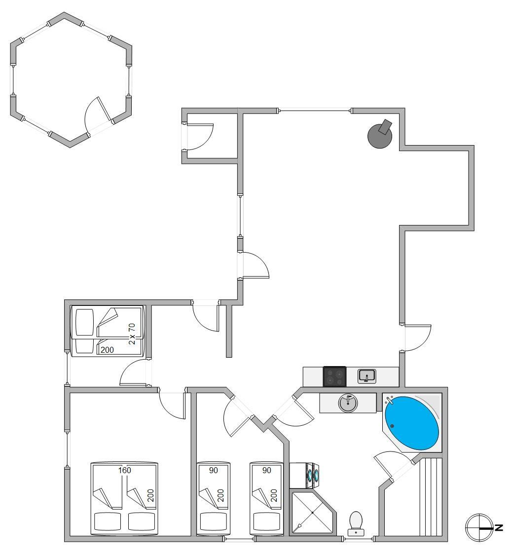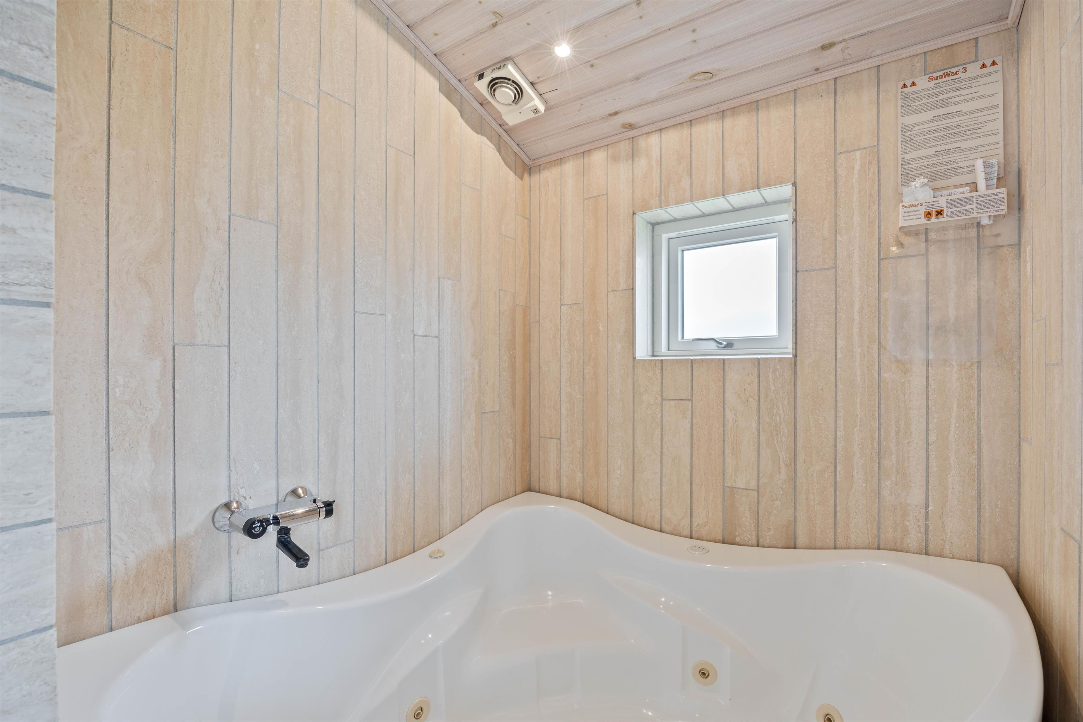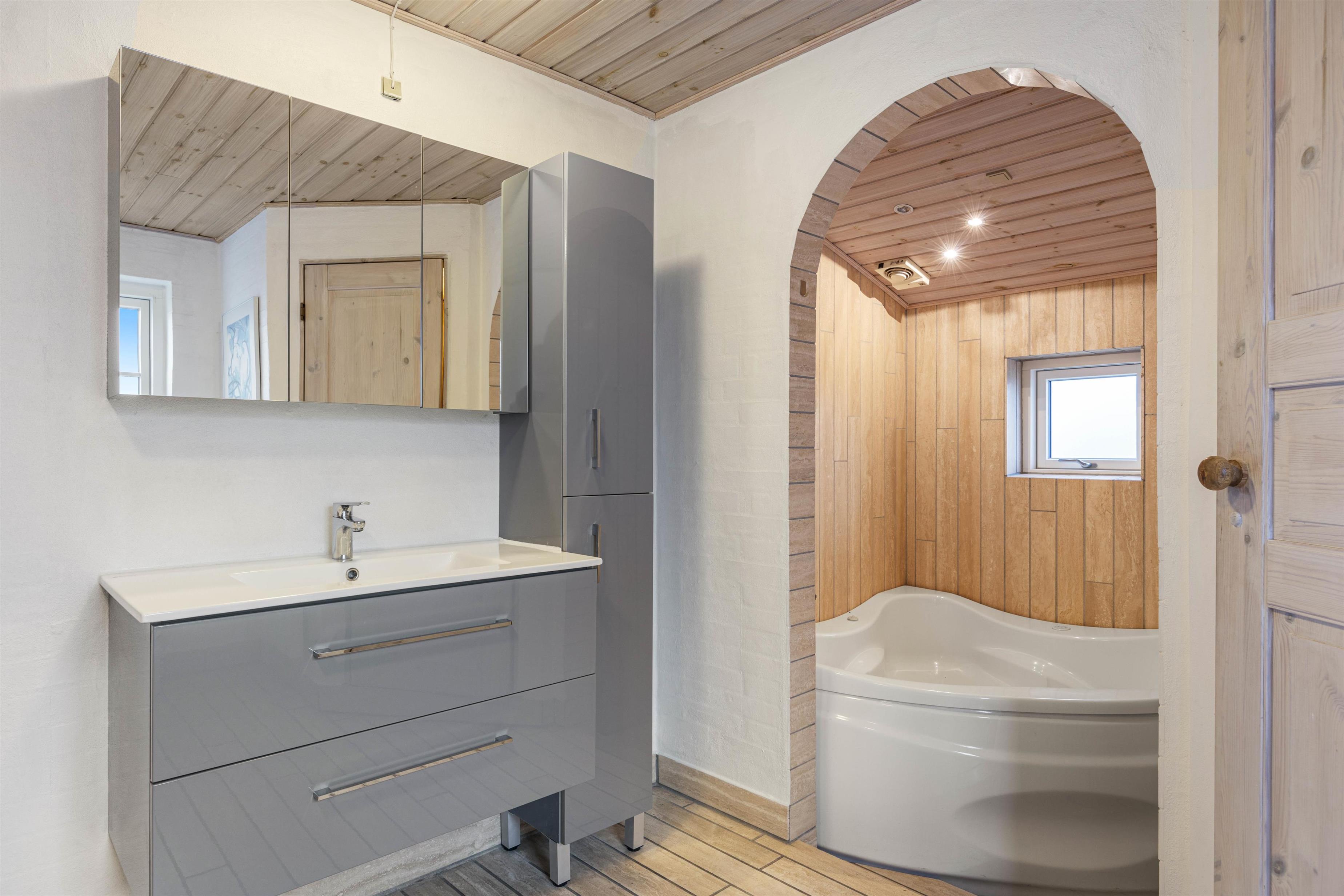 Når dagen går på hæld, er det fantastisk at kunne starte spabadet og saunaen og mærke, hvordan varmen breder sig i kroppen. Det er velvære til både krop og sjæl særligt efter en lang og måske aktiv dag ude i det fri. Bemærk venligst, at der i badeværelset er 2 trin ned til spabadet.