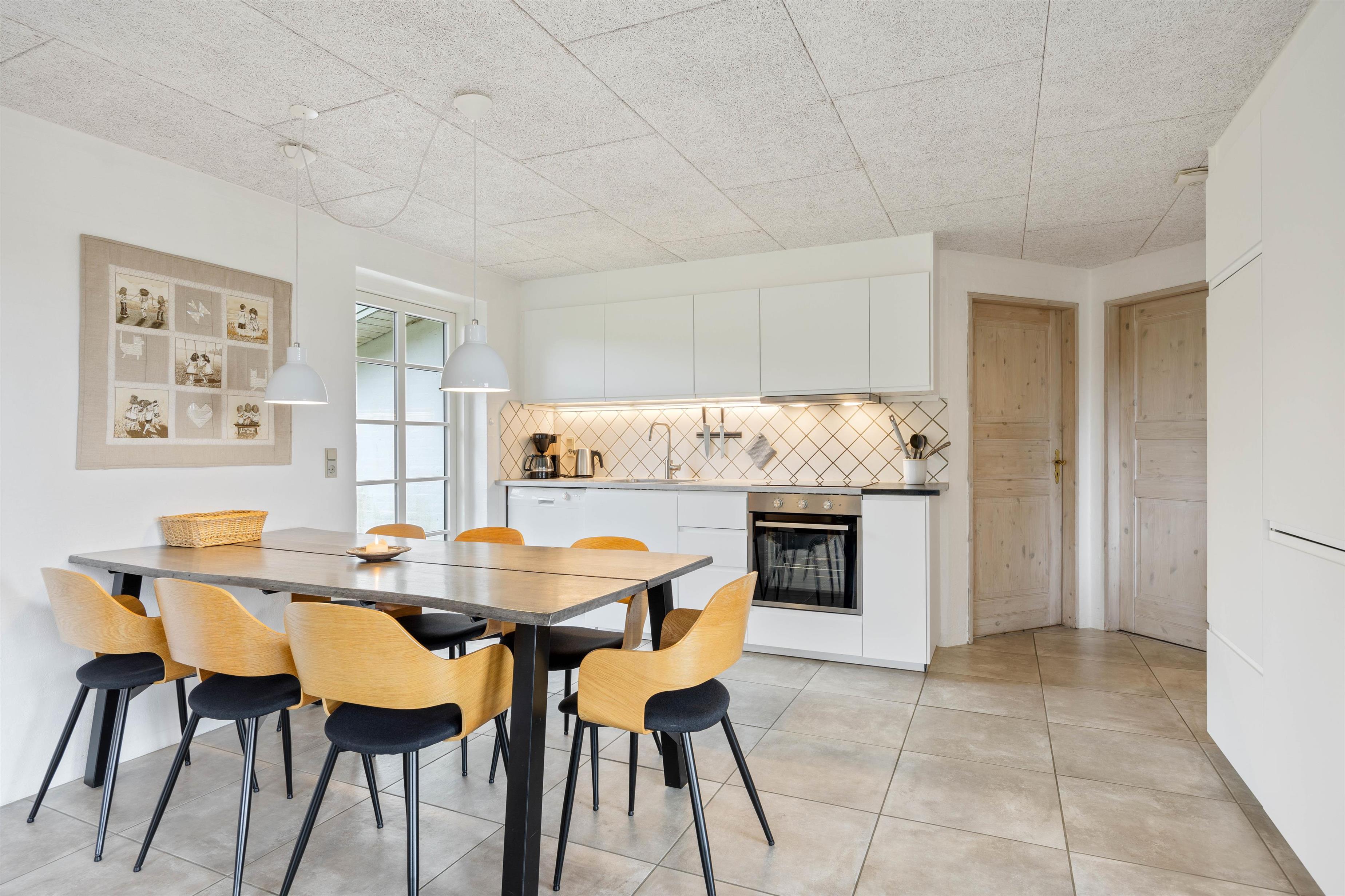 Sommerhuset er indrettet i en hyggelig og personlig stil, som giver varme og nærvær til sommerhuset. Her er der plads til, at familien kan samles og nyde hinandens selskab. Sommerhusets køkken ligger i åben forbindelse med stue og alrum. Det er her sommerhusets hjerte er, og her I samles foran brændeovnen, når I er indenfor.