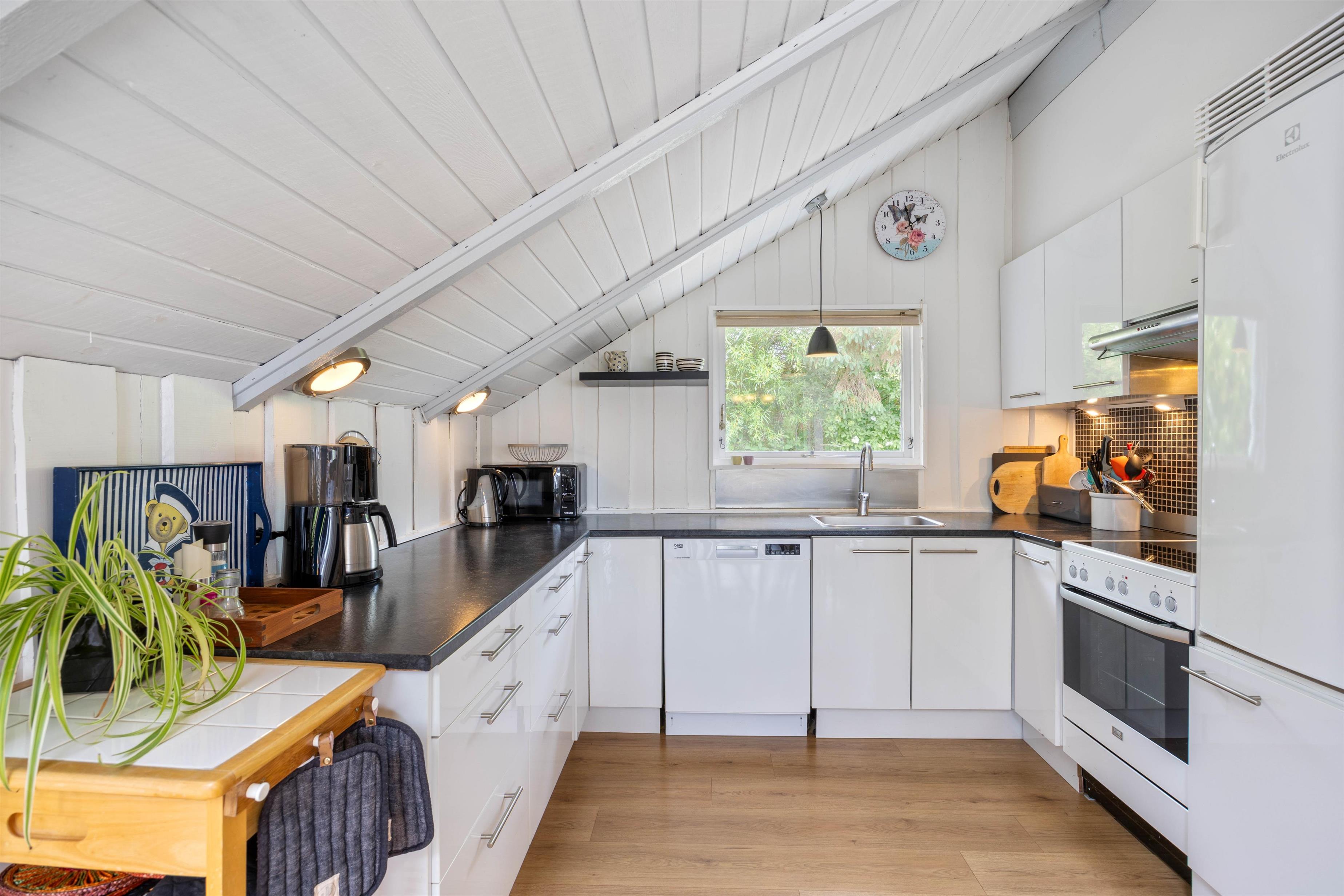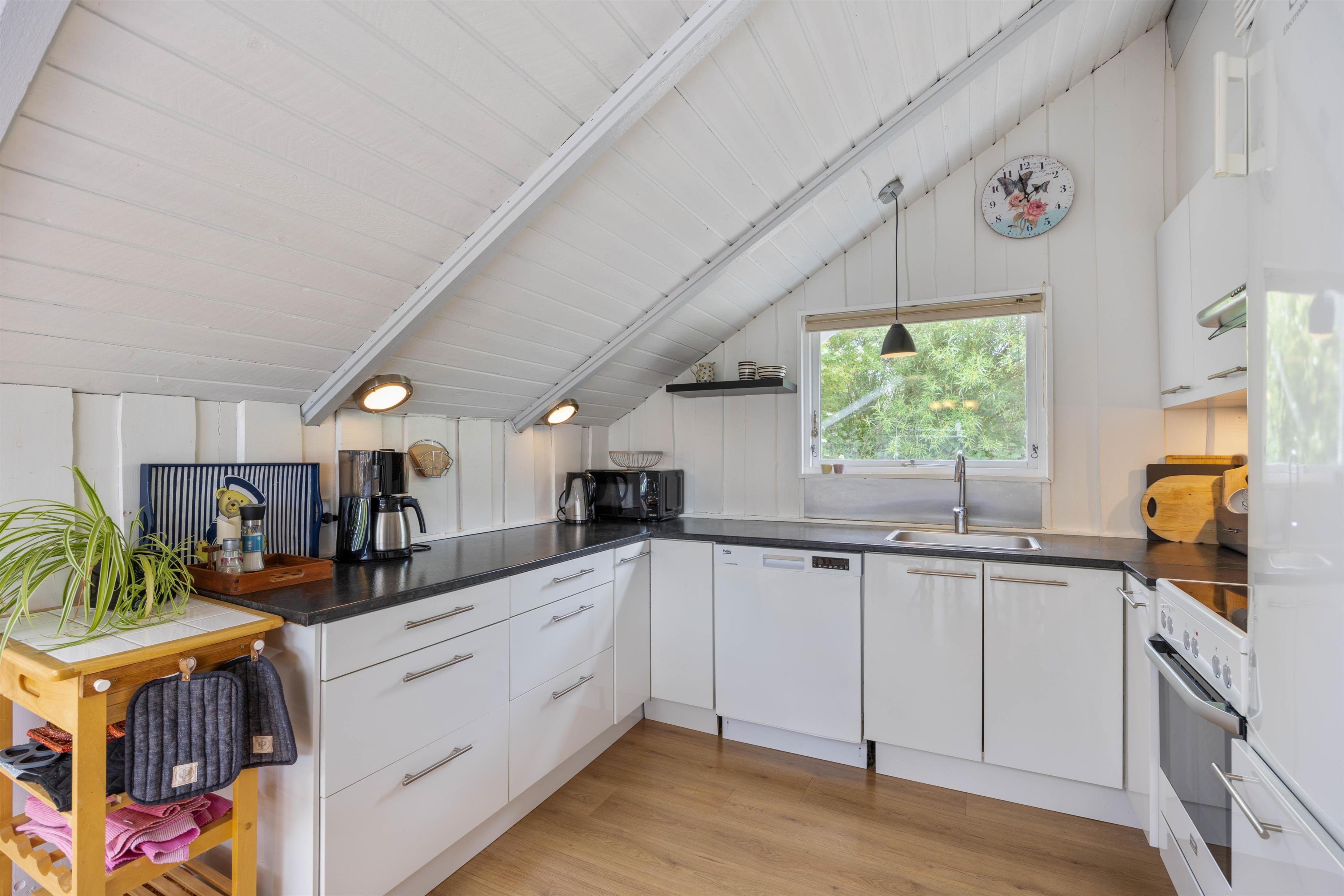 Med et husareal på 90 m2 er der god plads til afslapning og samvær. Den åbne stue i forbindelse med køkkenet har et fint lysindfald gennem de brede vinduespartier. Køkkenet er veludstyret med alt, hvad I behøver til tilberedning af måltiderne, herunder opvaskemaskine og en separat fryser på 100 liter. I badeværelset med gulvvarme er en vaskemaskine til rådighed, så I kan opfriske garderoben i løbet af ferien.