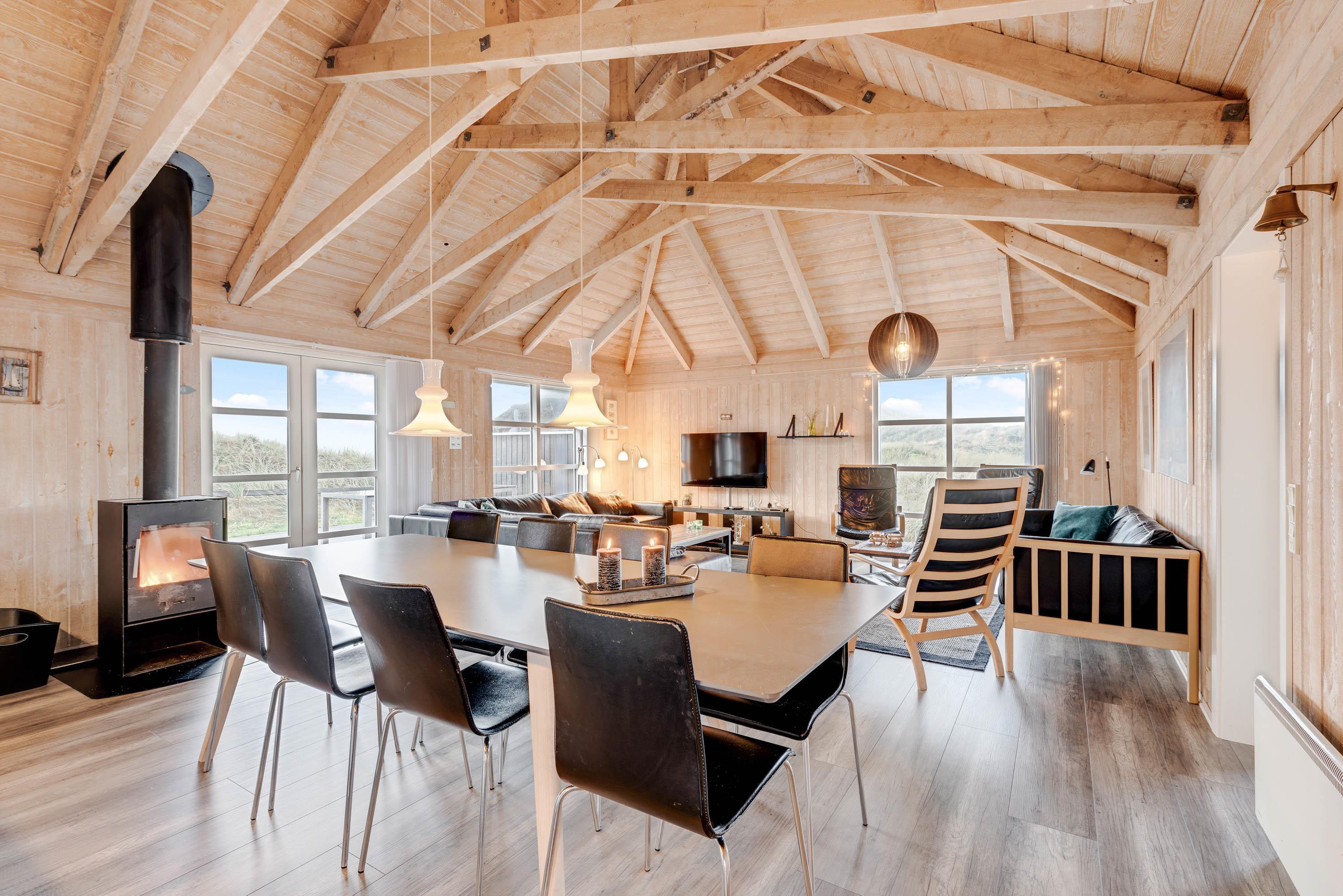 Opholdsrummet emmer af klassisk sommerhusstil med træfacader, synlige bjælker og åbent op i kip. Midt i rummet står brændeovnen, som spreder hygge og varme til hele rummet, mens de store vinduespartier bringer både lyset og naturen ”helt ind i stuen”. Sofagrupperne indbyder til hyggeligt samvær for alle, både med TV og diverse familiespil.