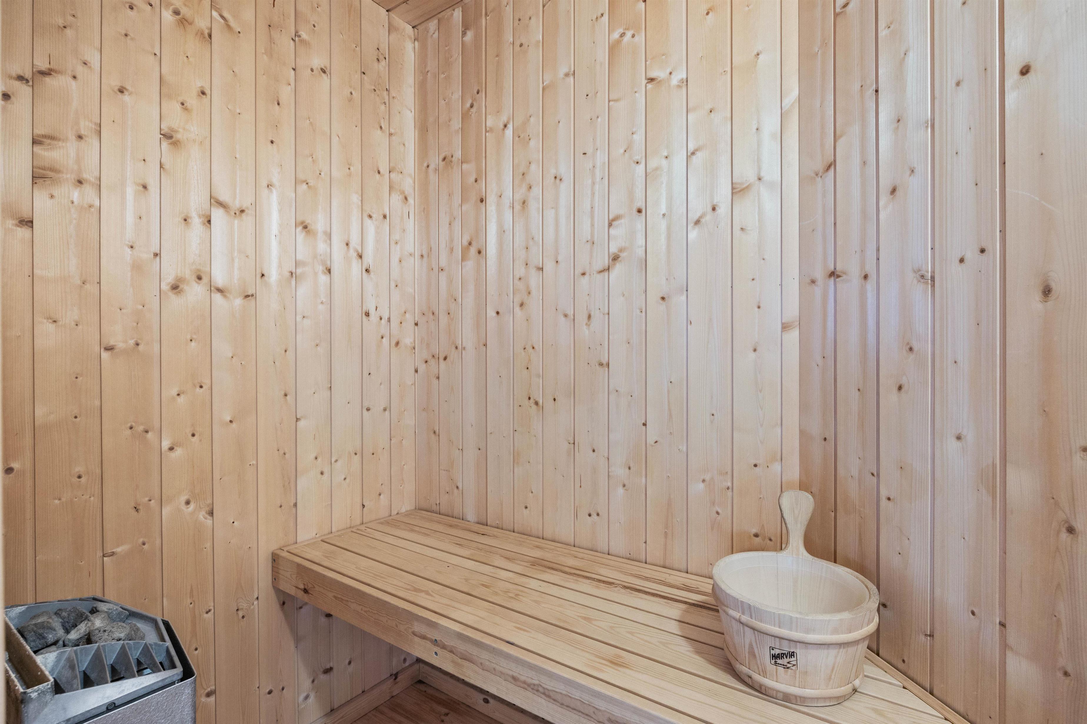 Efter en begivenhedsrig dag kan I trække jer tilbage og nyde en afslappende aften i sommerhusets wellness-område. Sommerhusets badeværelse har nemlig både sauna og spa, hvor der er lagt op til afslapning og velvære.