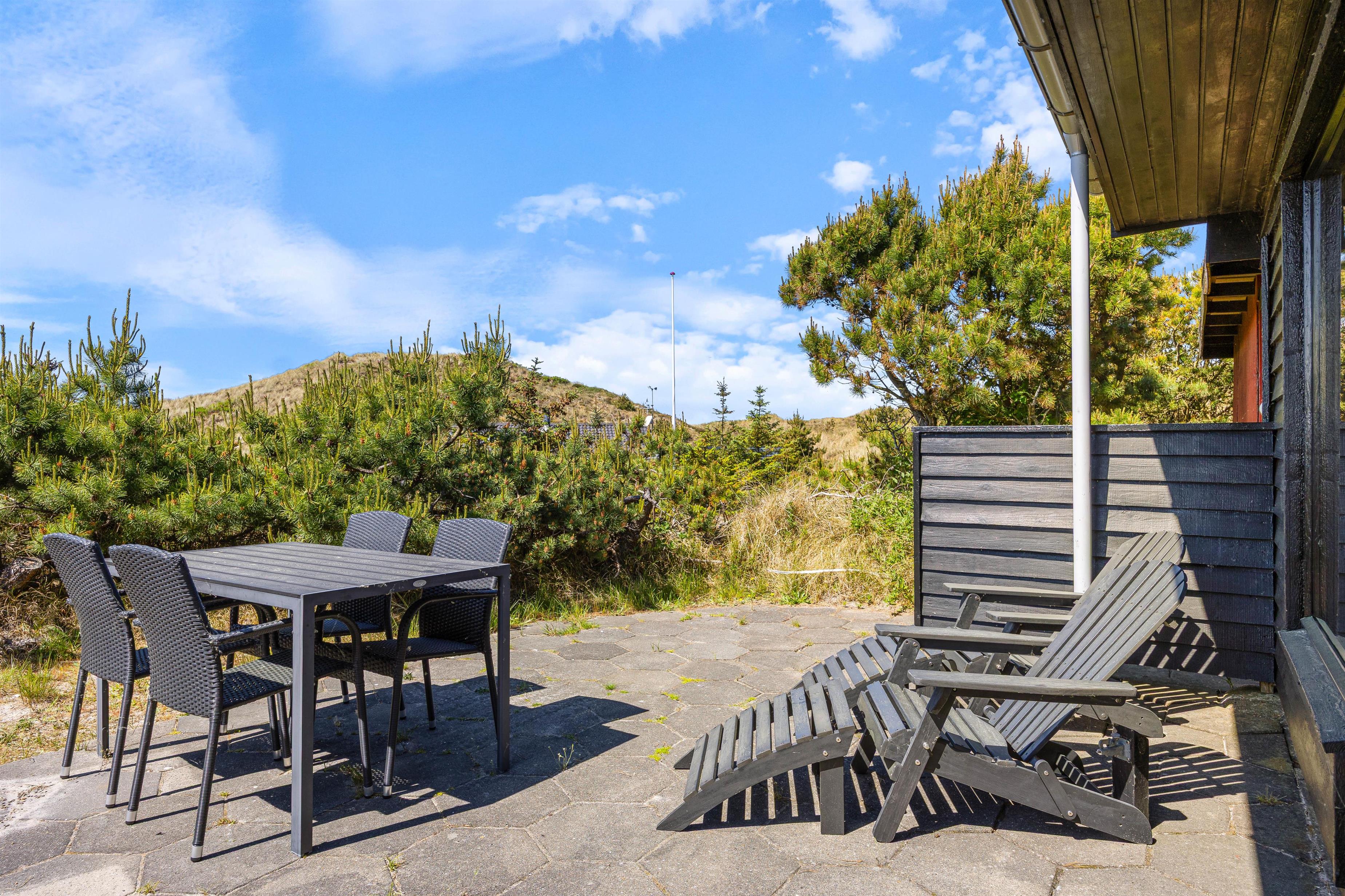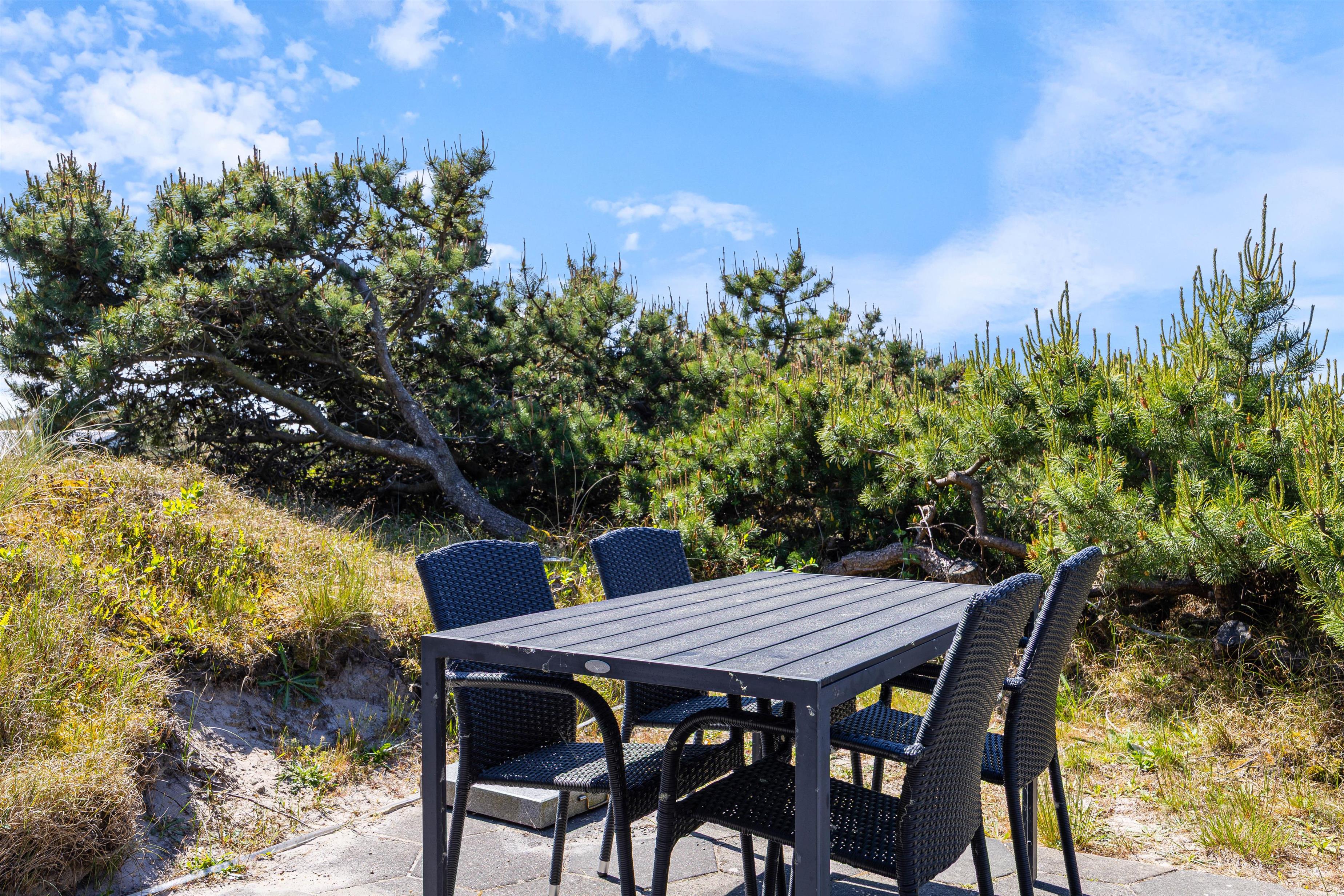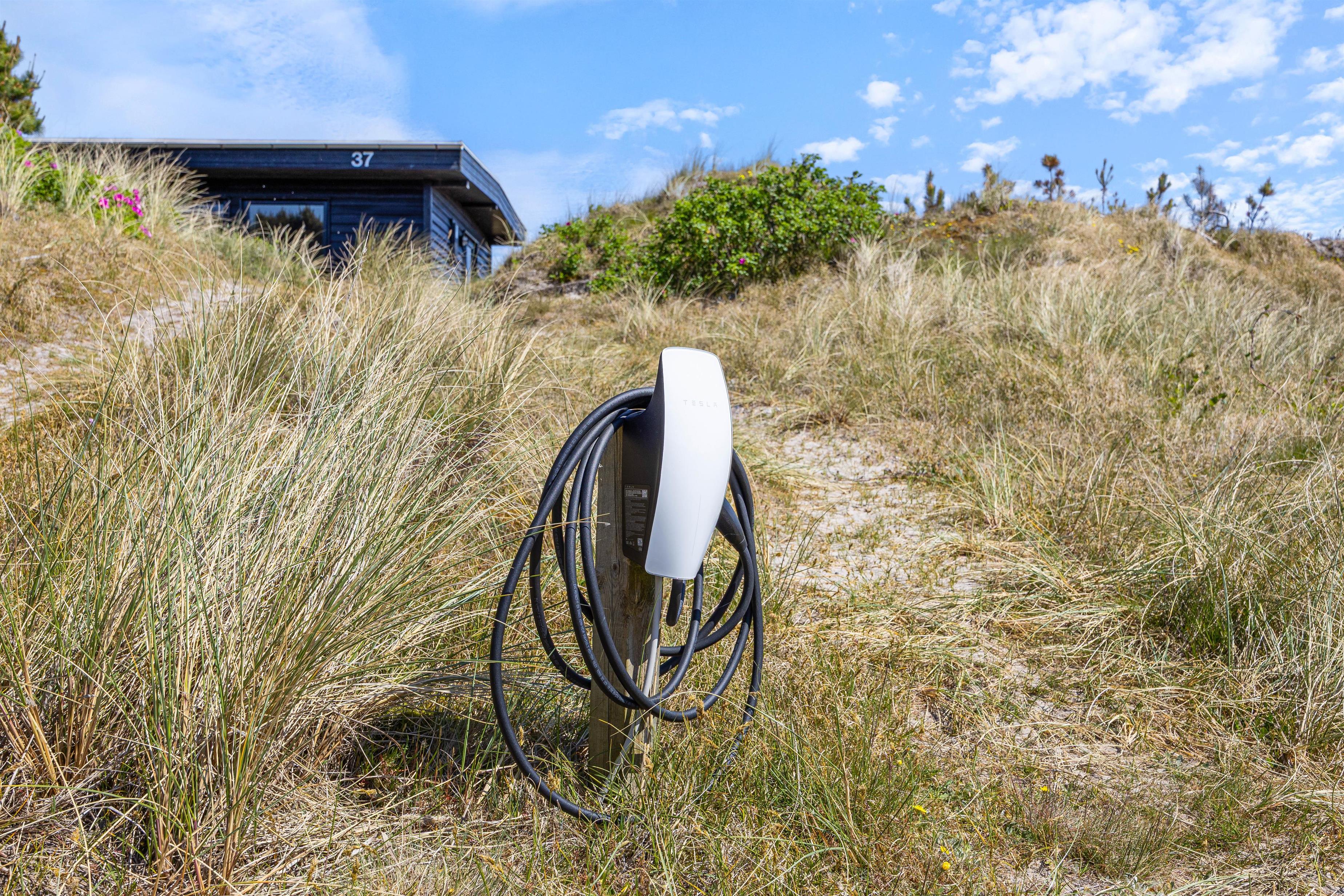 Efter en lang gåtur på stranden kan du nyde den friske luft på den delvist afskærmede terrasse ved ferieboligen. Et ekstra bord-bænkesæt er placeret i en lavning på grunden, ligesom der er gyngestativ til børnene. Der er komfortable havemøbler til rådighed på terrassen, og din elbil kan oplades ved feriehusets lademulighed. Lademuligheden for el bilen er en ladestander, medbring eget kabel (type 2 stik).