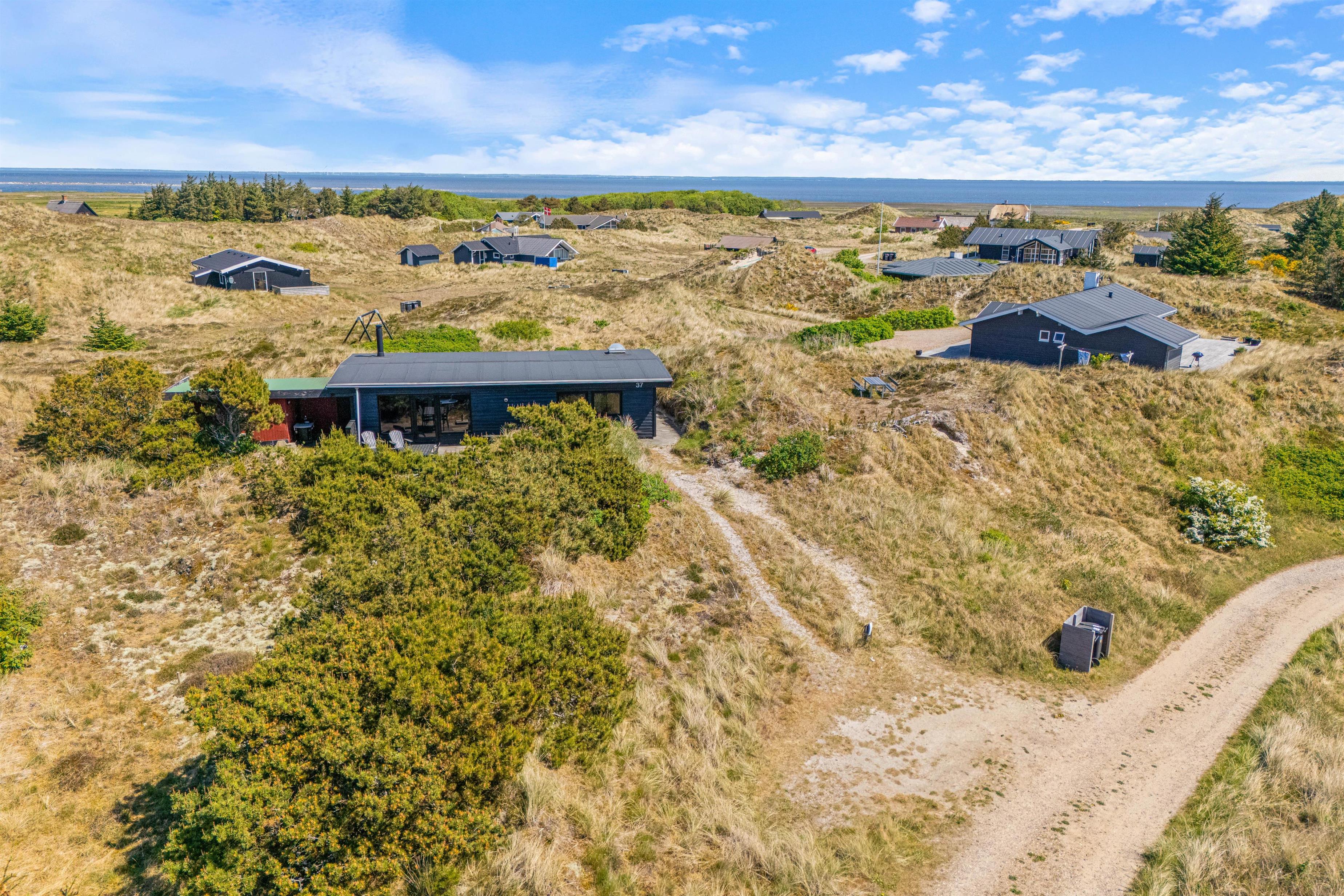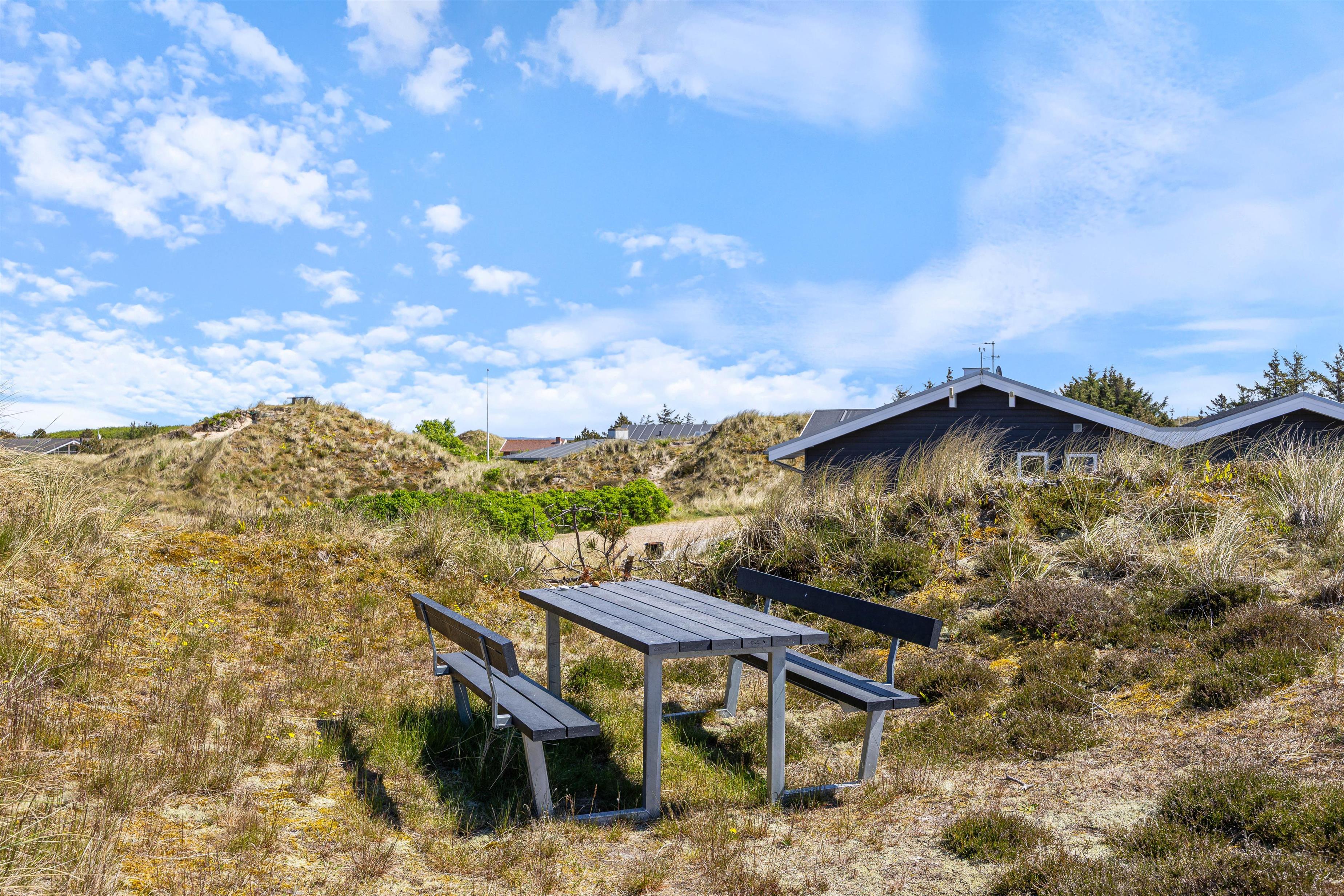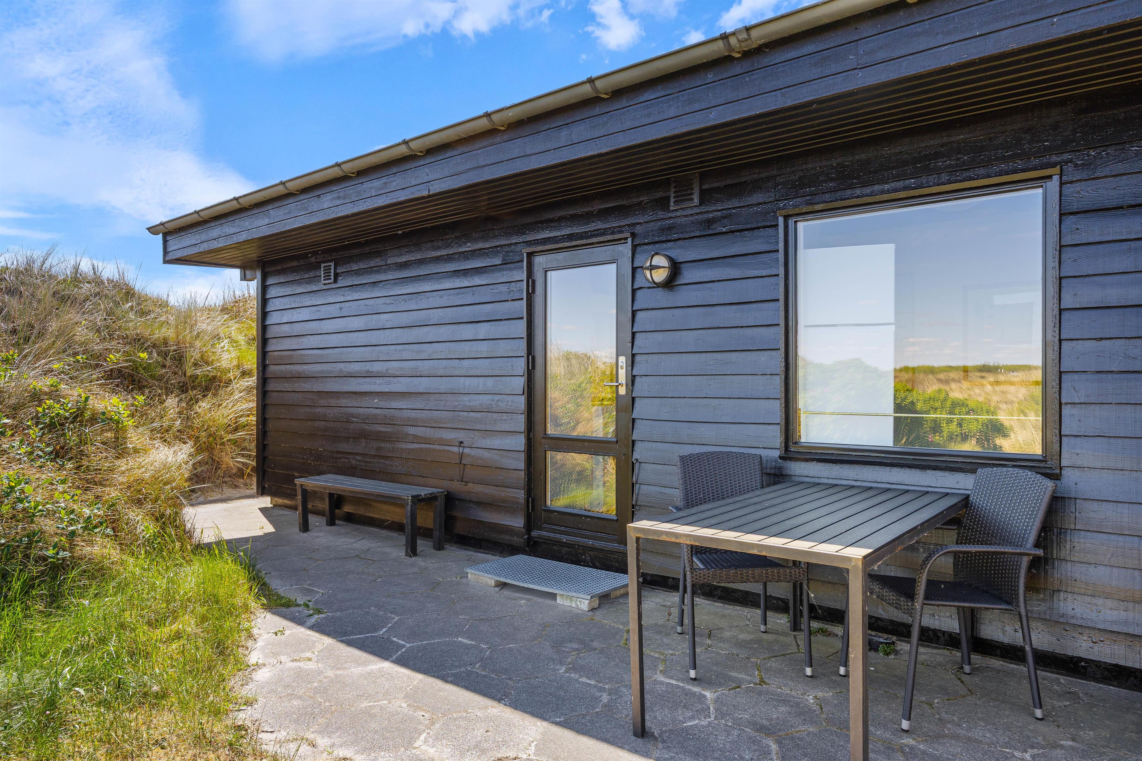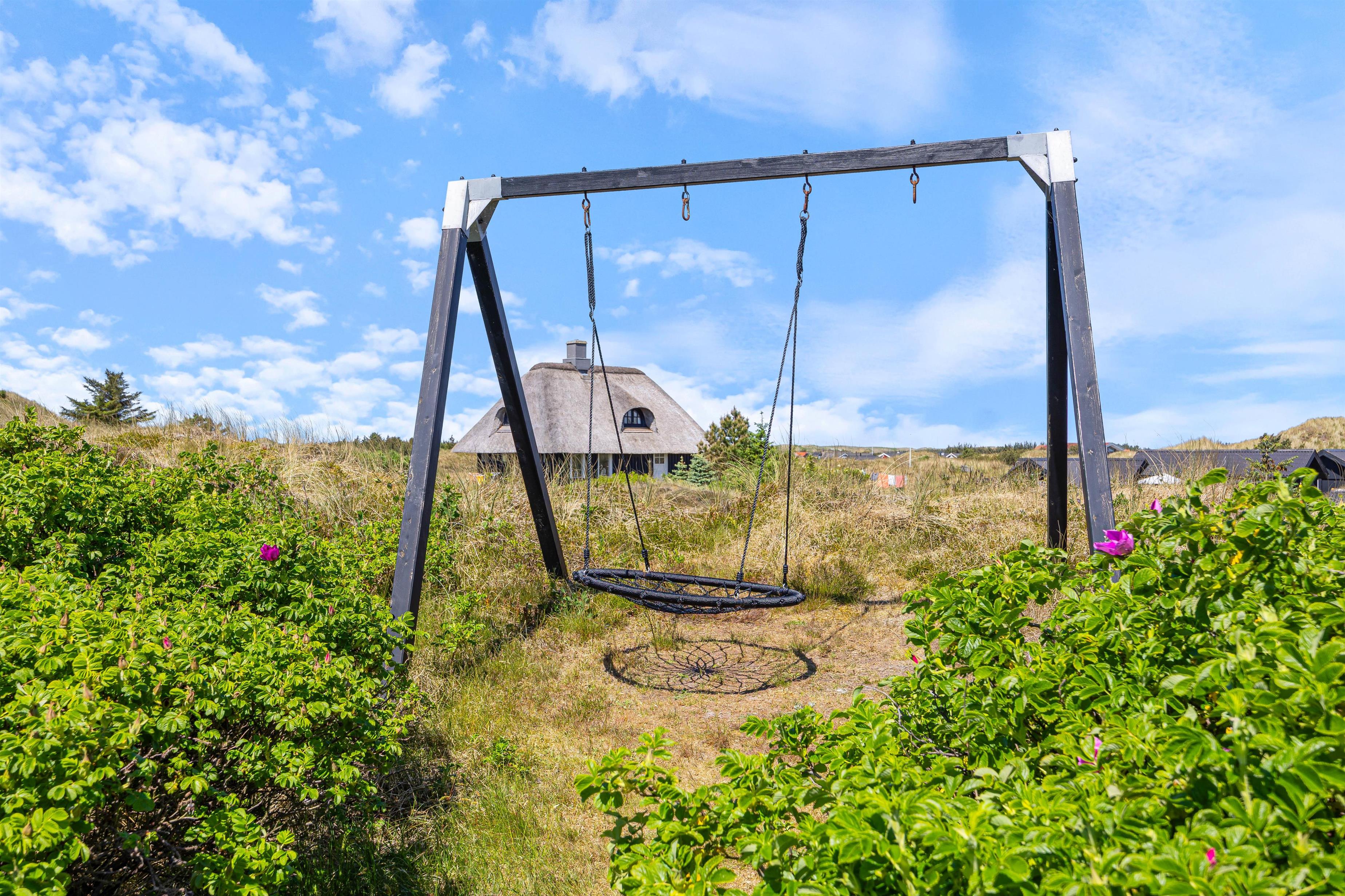 Efter en lang gåtur på stranden kan du nyde den friske luft på den delvist afskærmede terrasse ved ferieboligen. Et ekstra bord-bænkesæt er placeret i en lavning på grunden, ligesom der er gyngestativ til børnene. Der er komfortable havemøbler til rådighed på terrassen, og din elbil kan oplades ved feriehusets lademulighed. Lademuligheden for el bilen er en ladestander, medbring eget kabel (type 2 stik).