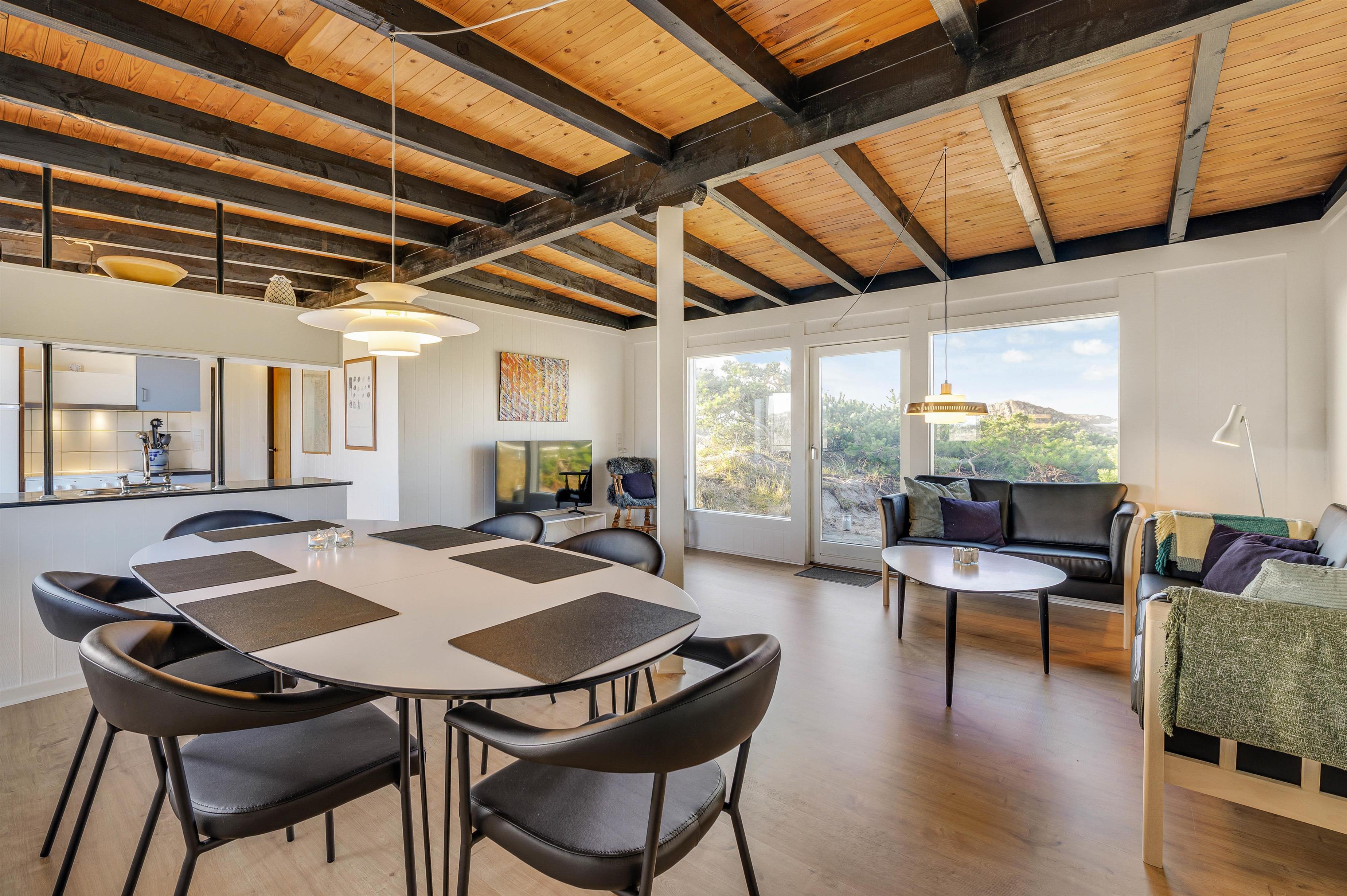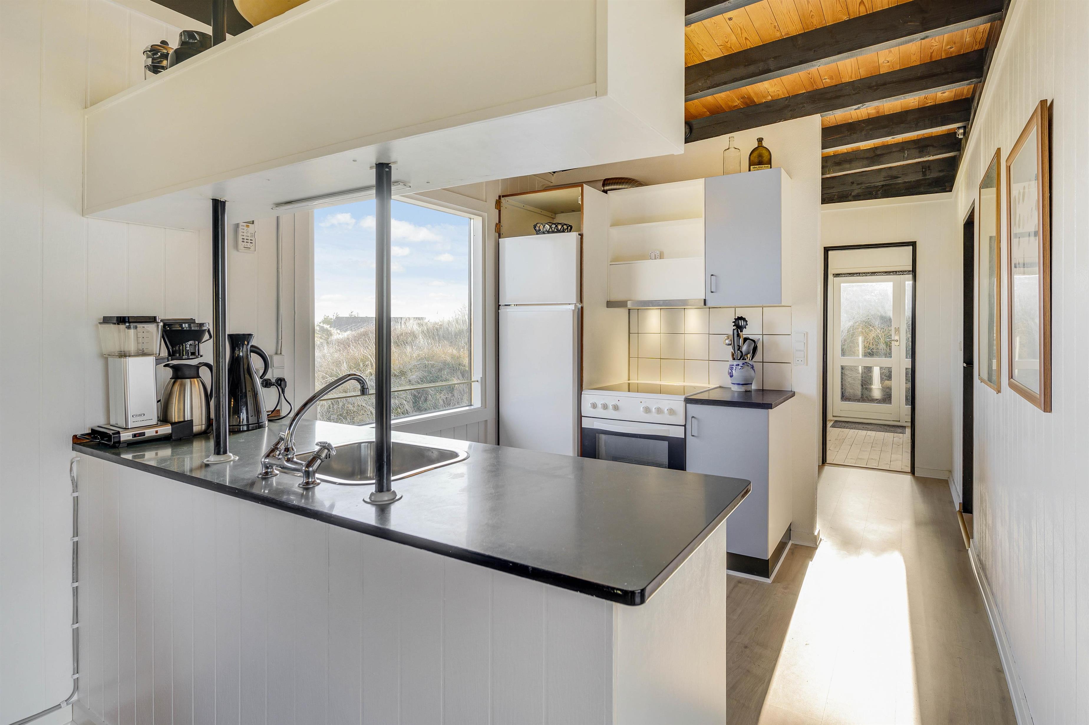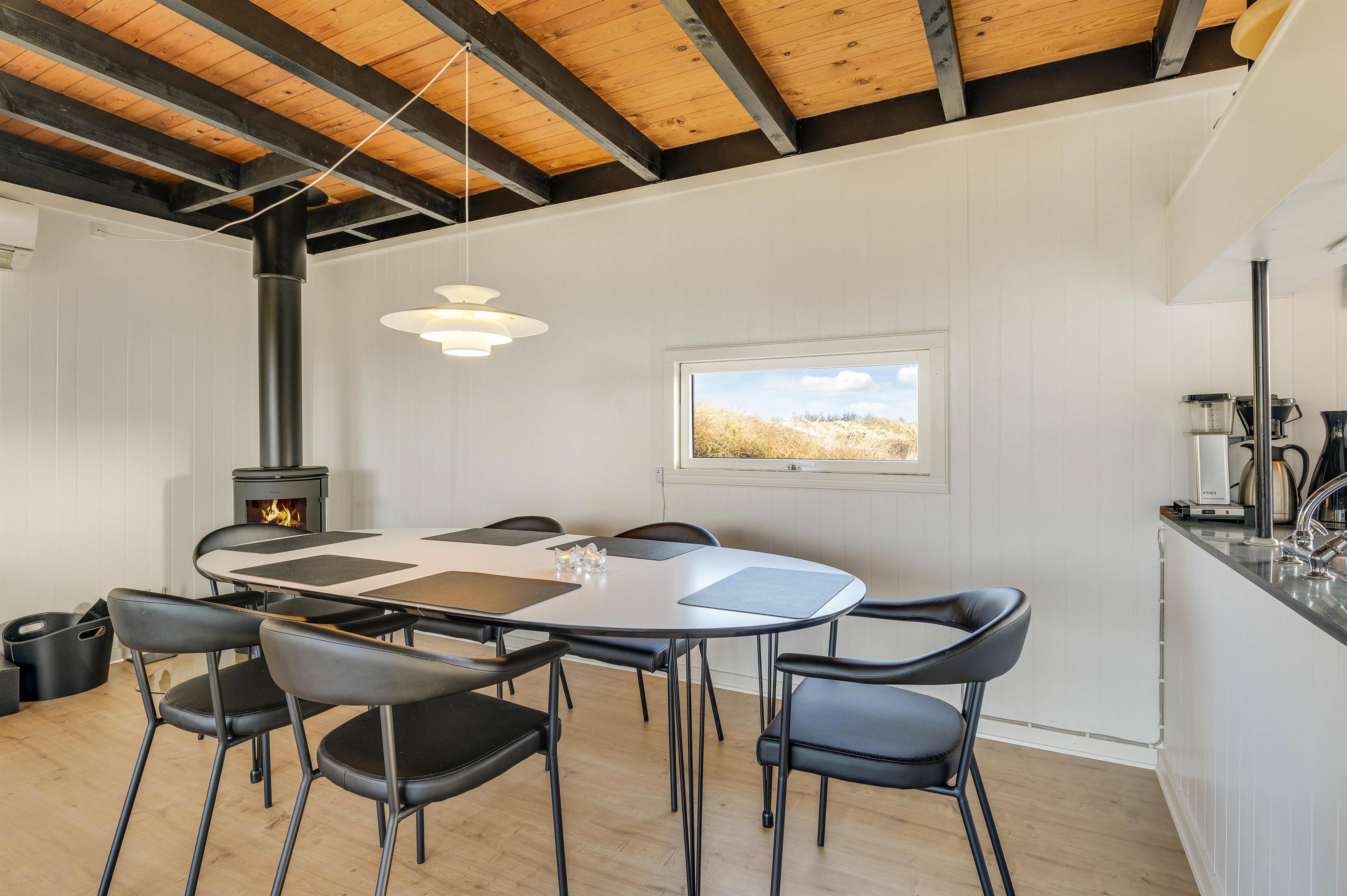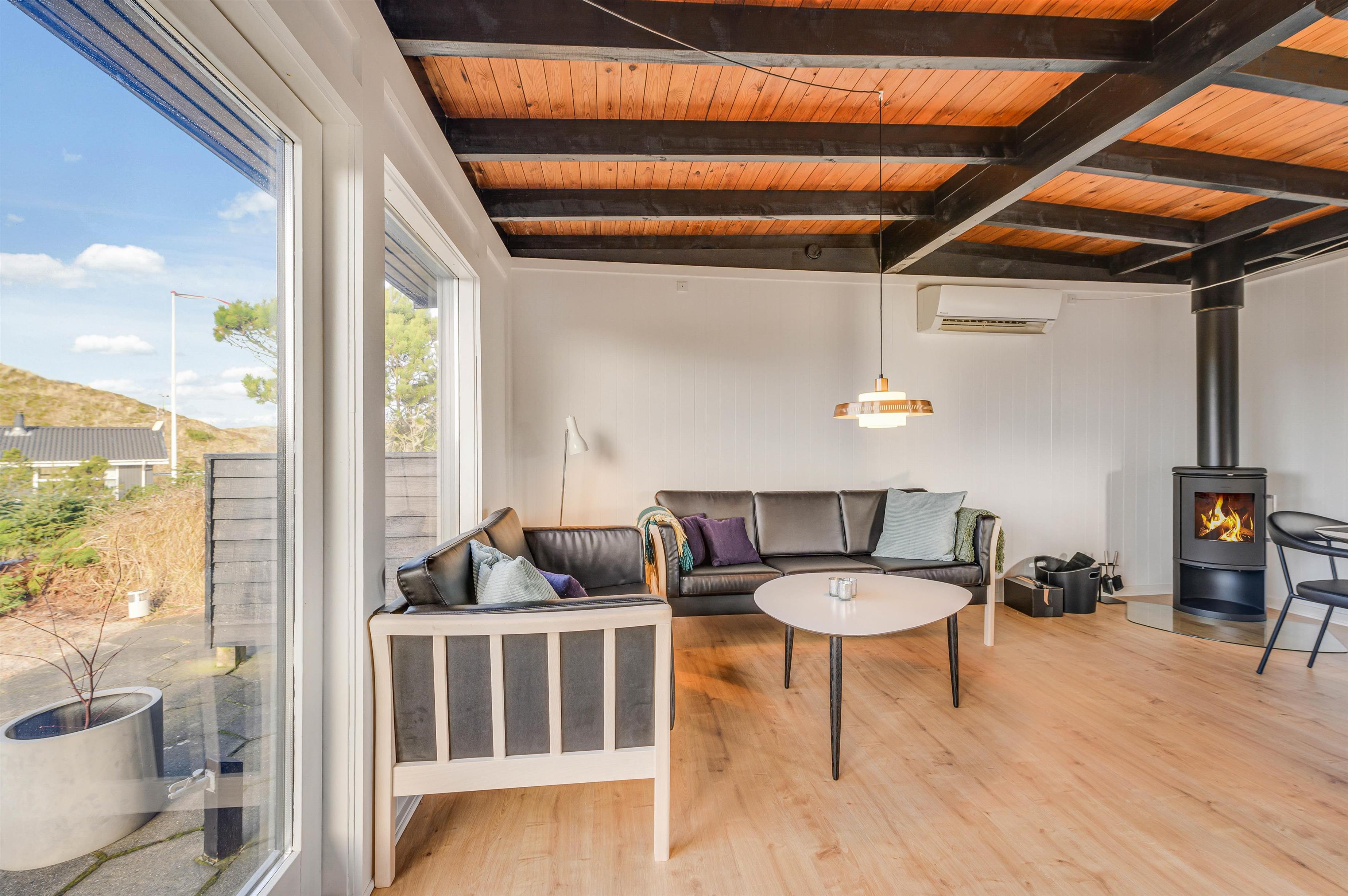 Stuen med åbent køkken udgør hjertet af ferieboligen, og her sørger den varme pejs også for en hyggelig atmosfære. Desuden kan en energibesparende varmepumpe bruges ved behov til at opnå en behagelig temperatur.