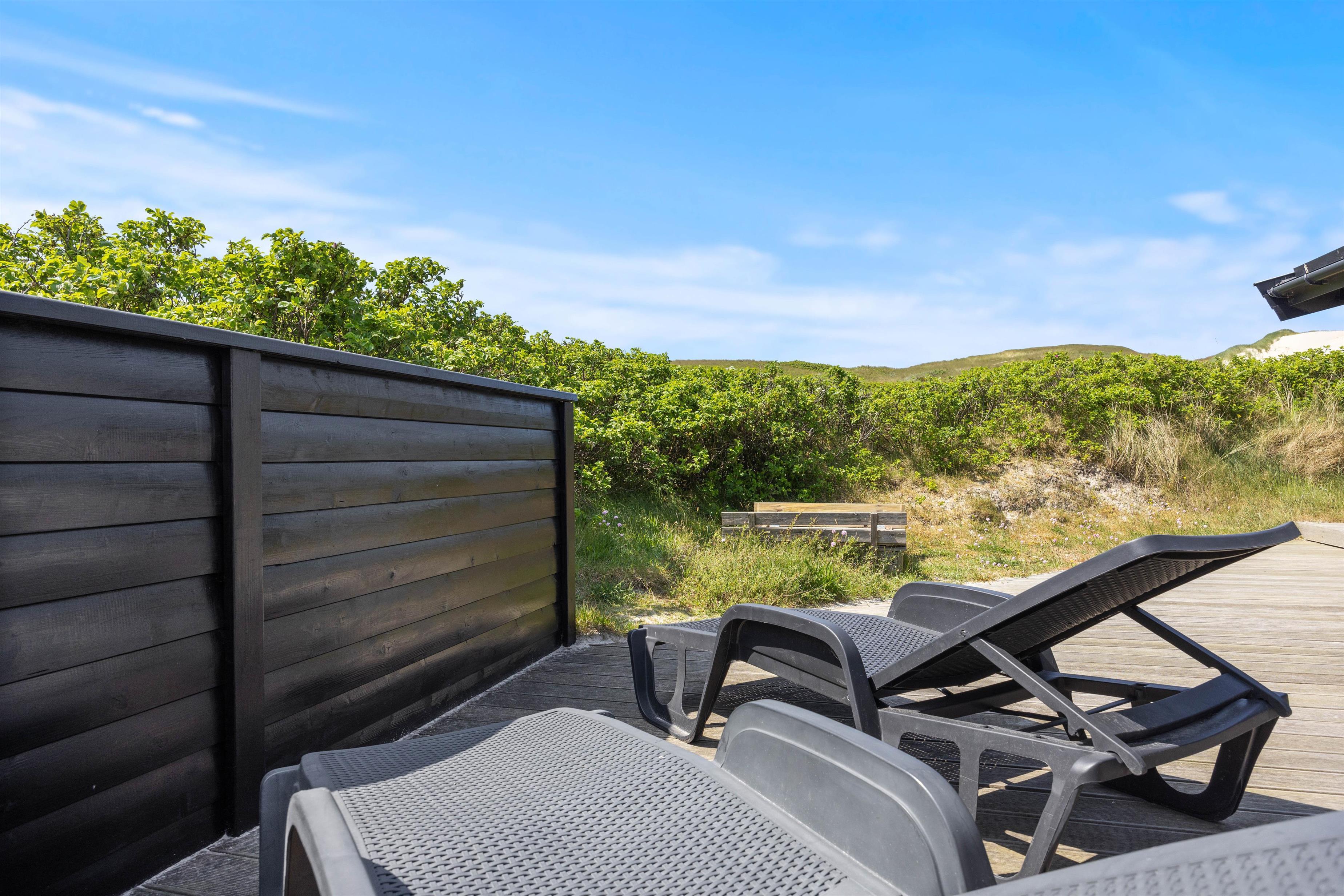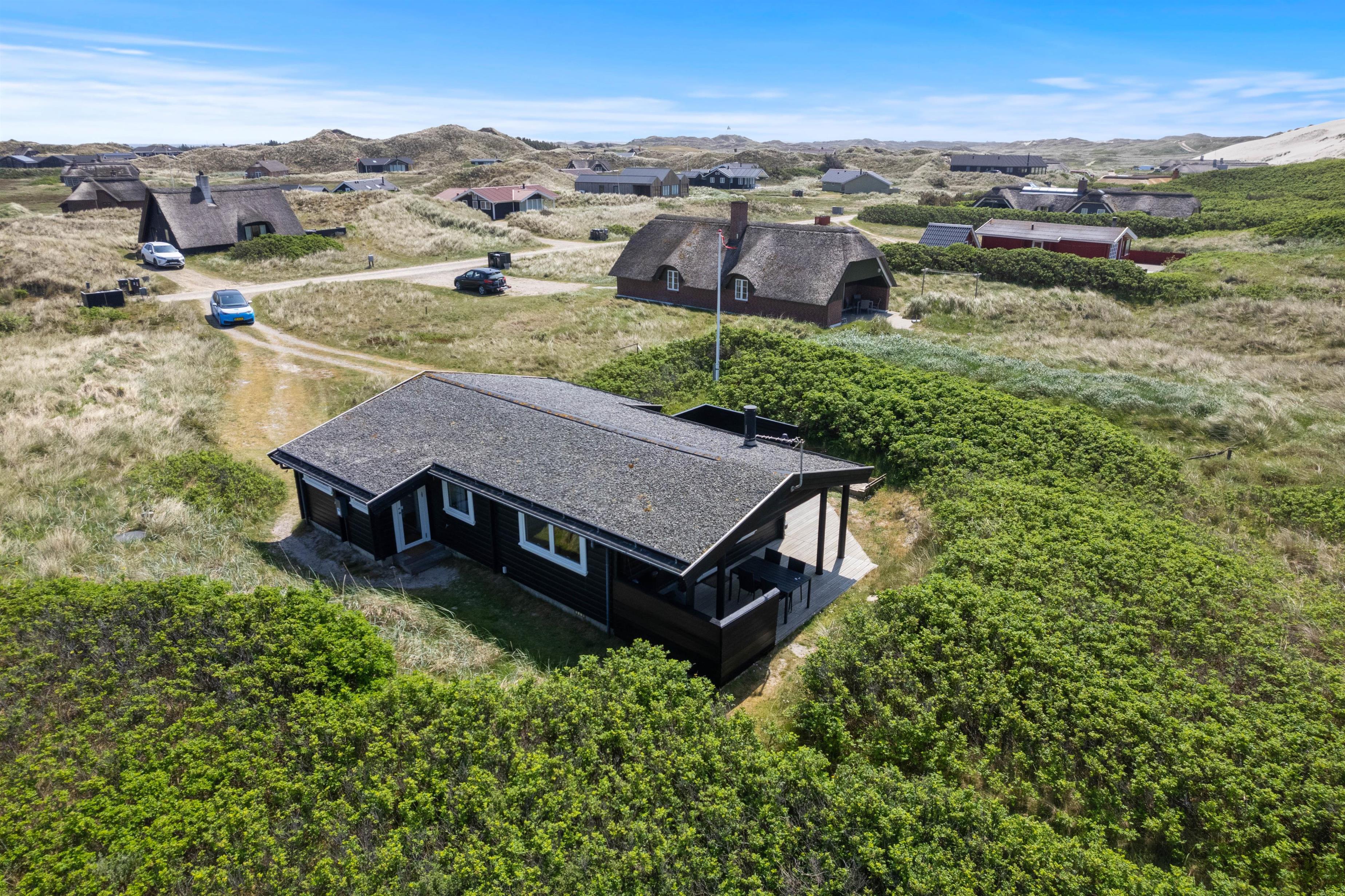 Det hyggelige træsommerhus står skarpt med sine sortmalede brædder i kontrast til det lyse landskab i første klitrække, og her er der ingen undskyldninger for ikke at besøge den hvide sandstrand op til flere gange dagligt.