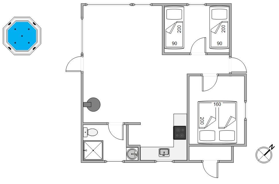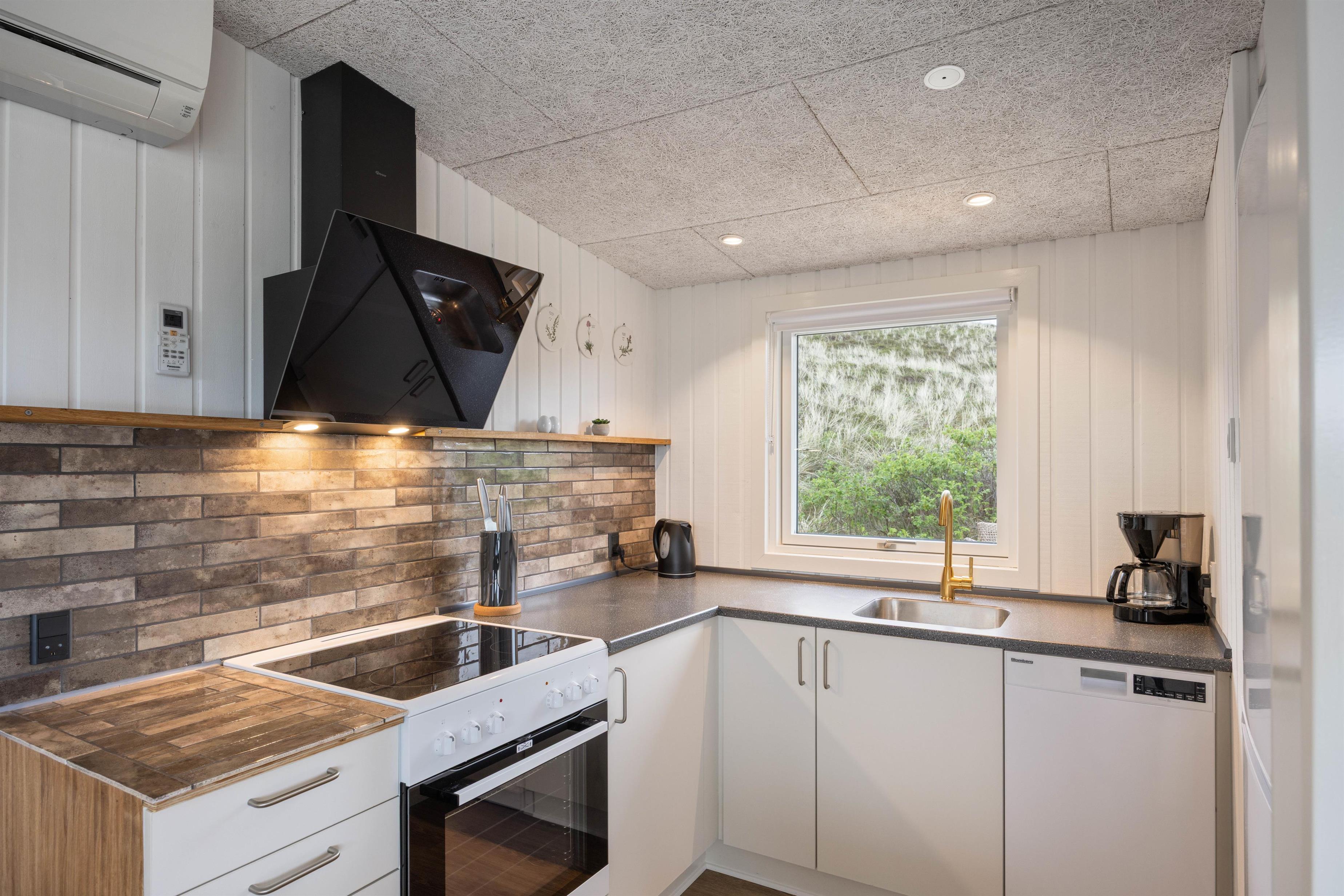 Det åbne køkken er udstyret med alt, hvad I behøver for at forkæle hinanden med lækre måltider. I stuen kan I nyde samværet omkring et måltid, med et brætspil eller bare slappe af og nyde den knitrende ild i brændeovnen. Den energibesparende luft-til-luft varmepumpe skaber en varm og indbydende feriestemning, uanset årstiden.