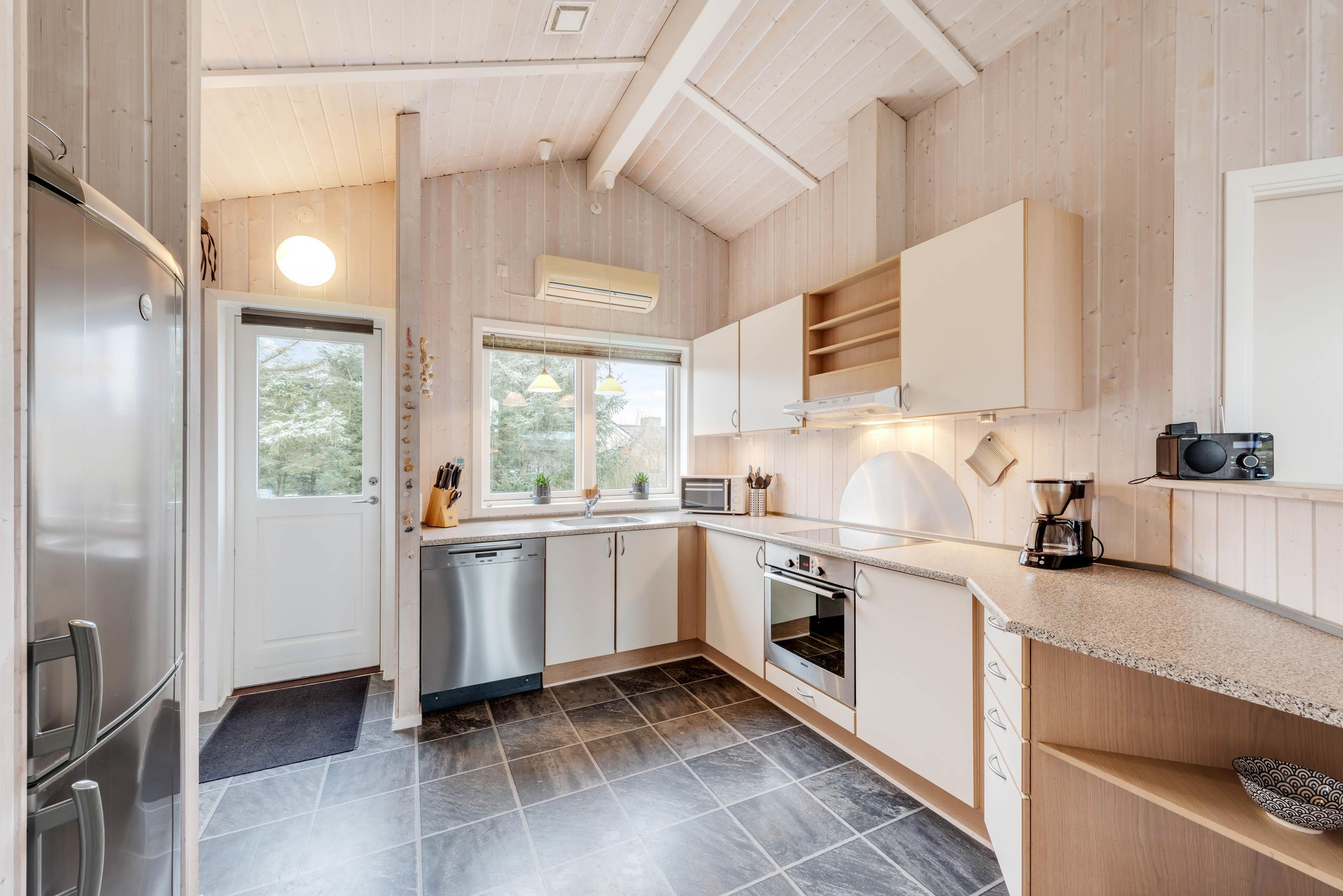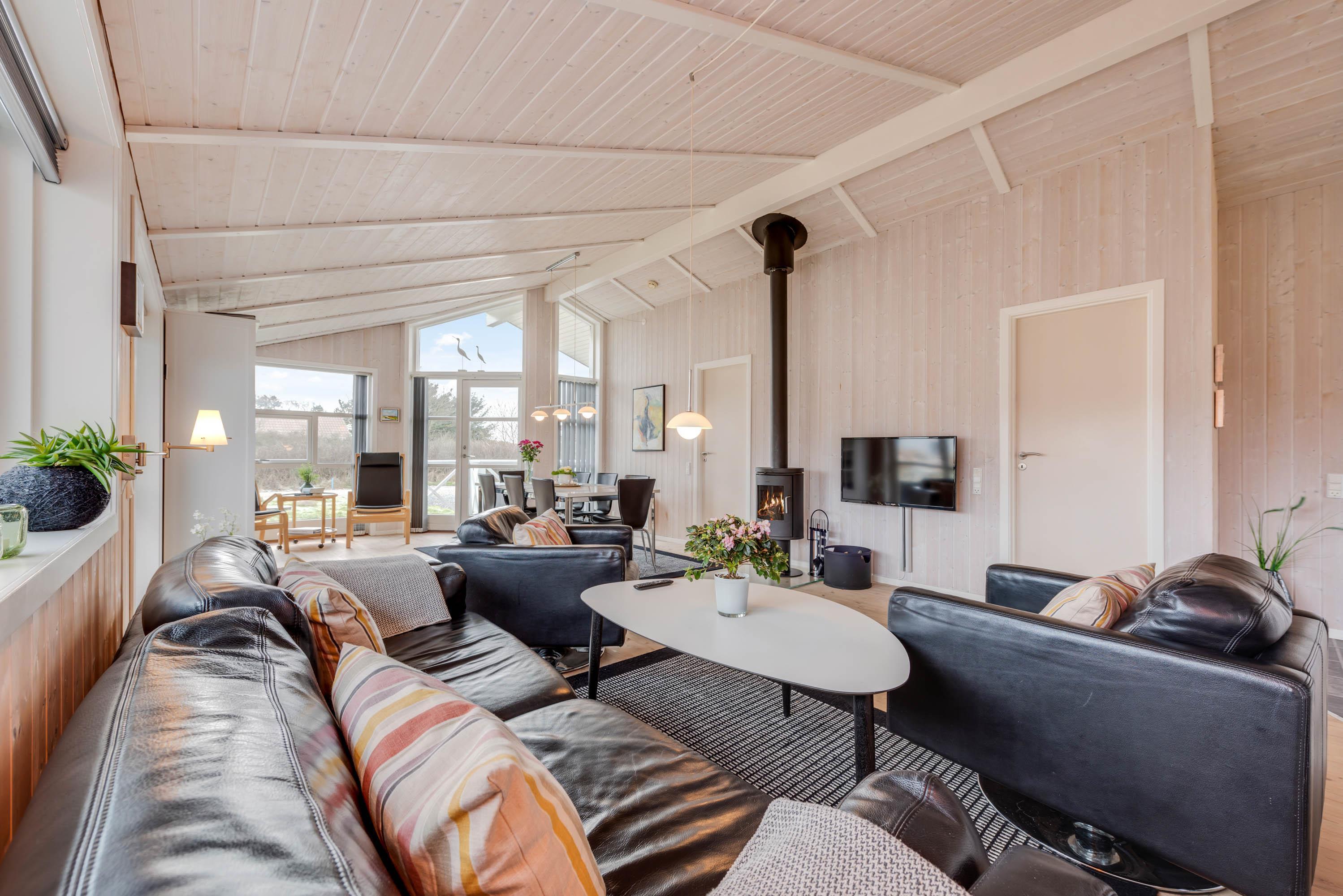 Den gode indretning gør det nemt og bekvemt at holde ferie med hele familien. I hjertet af sommerhuset har I et skønt rummeligt opholdsrum med loft til kip og et delvist åbent køkken, spiseafdeling og stue. Fra de store vinduespartier kommer et rigtigt flot lysindfald. Rummet indbyder ganske enkelt til samvær og kvalitetstid med familien – tænd op i brændeovnen og hyg jer med brætspil eller hygge i sofaen med en god film.