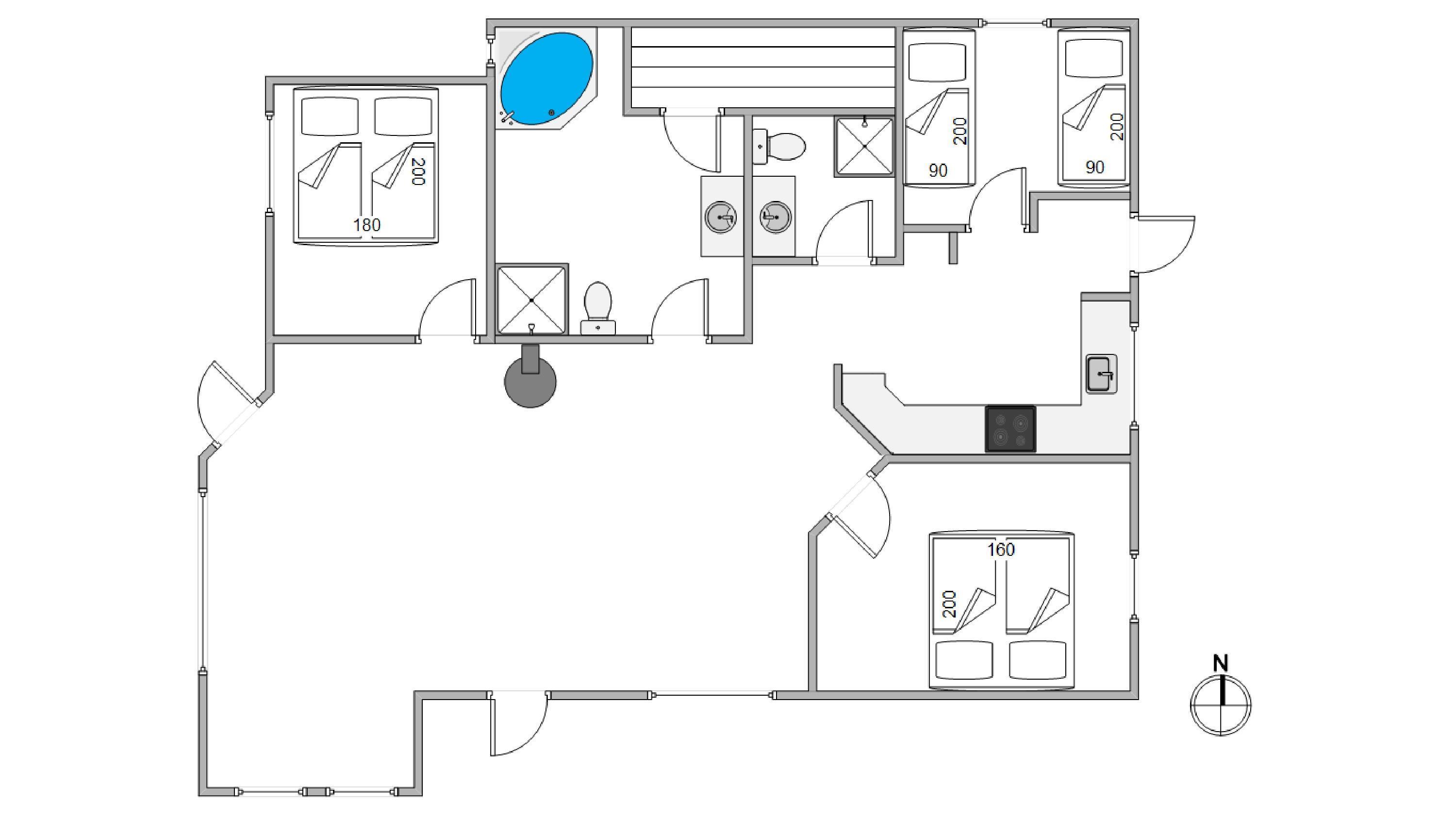 Kr Madsens Vej 9 har plads til 6 personer. Sommerhuset har 2 værelser med dobbeltseng og en med 2 enkeltsenge. På badeværelset er der både spabad og sauna, der indbyder til ren selvforkælelse og afslapning. Badeværelset er holdt i lys og flot stil med ovenlysvindue.