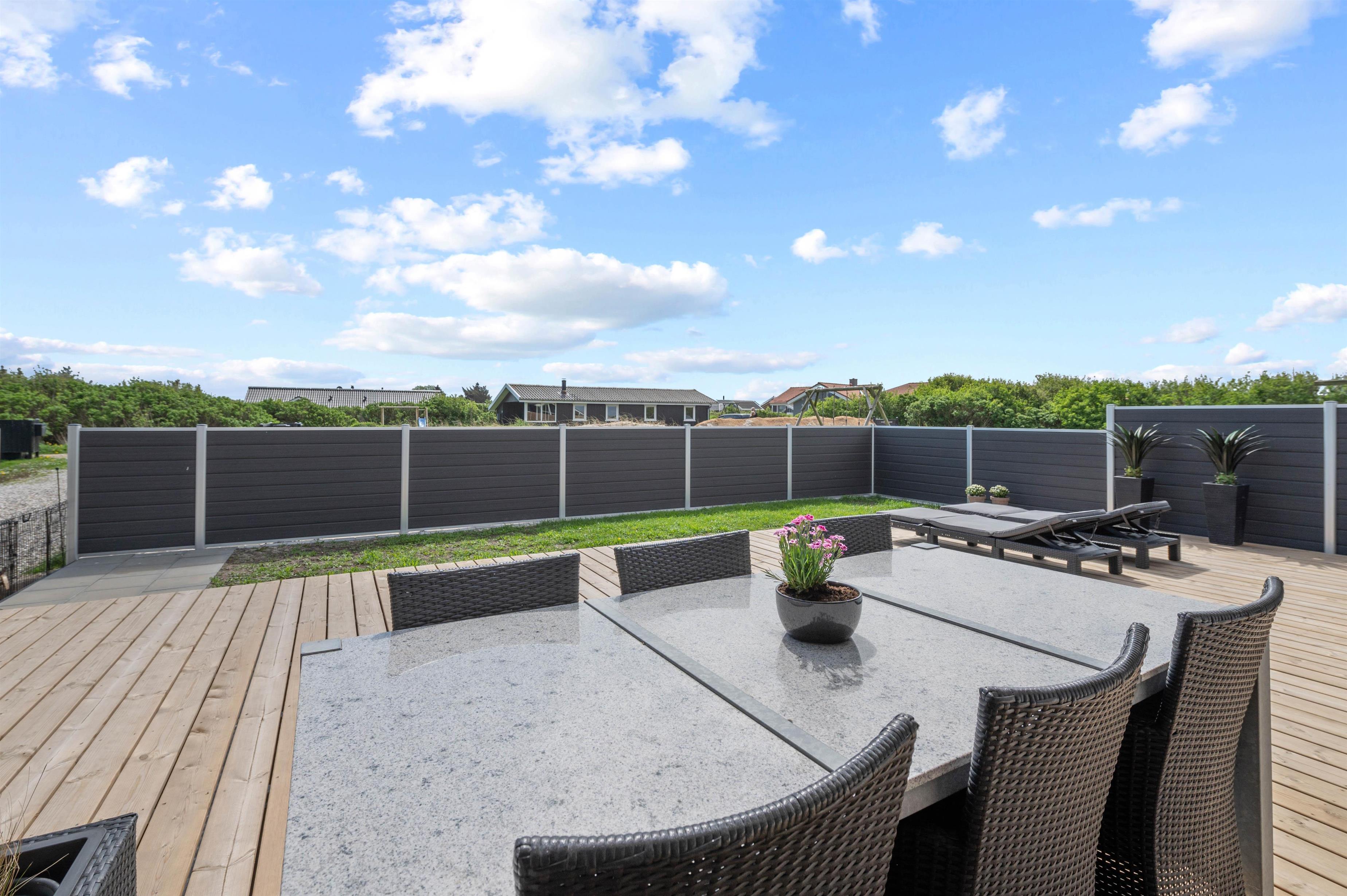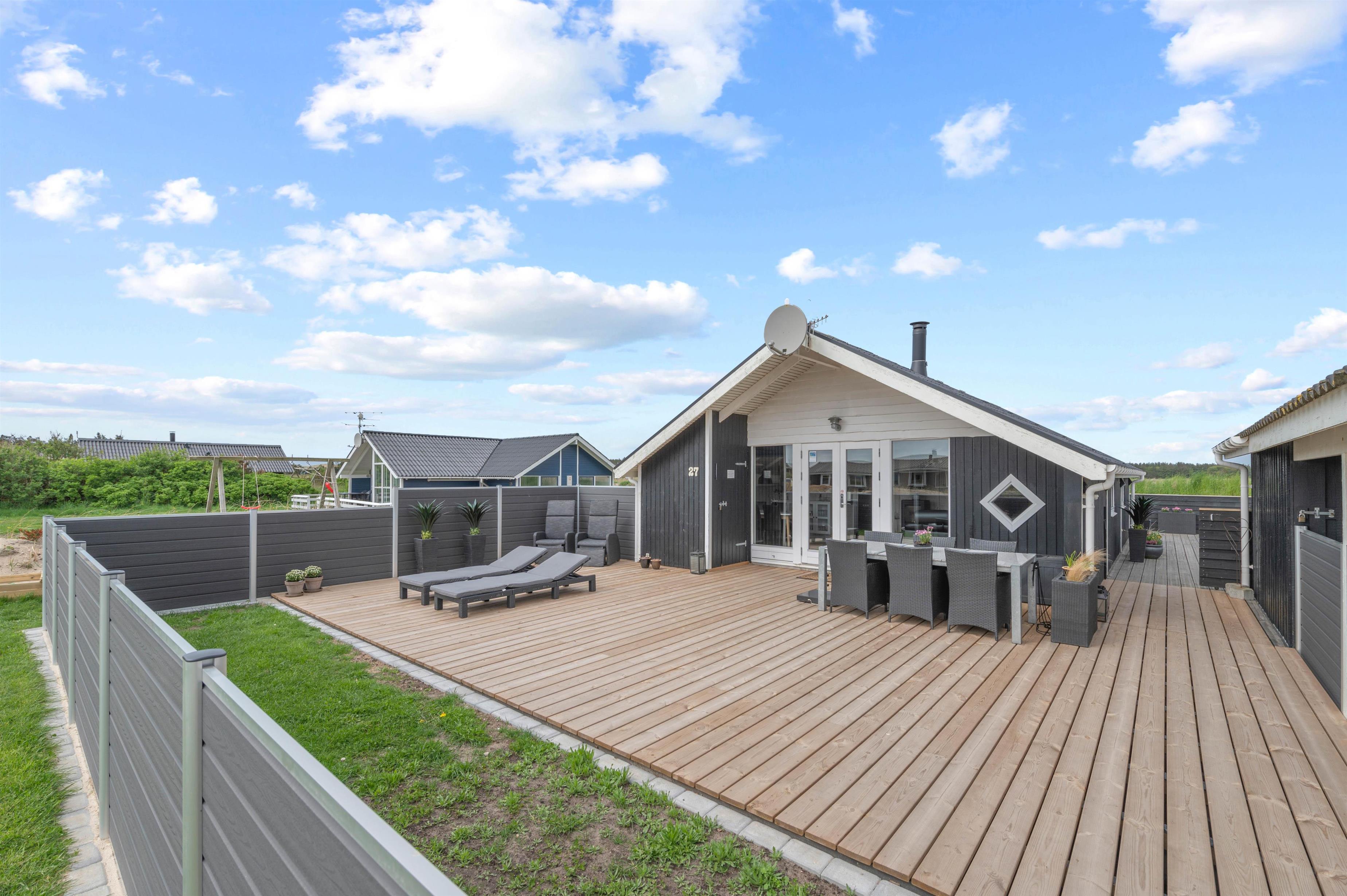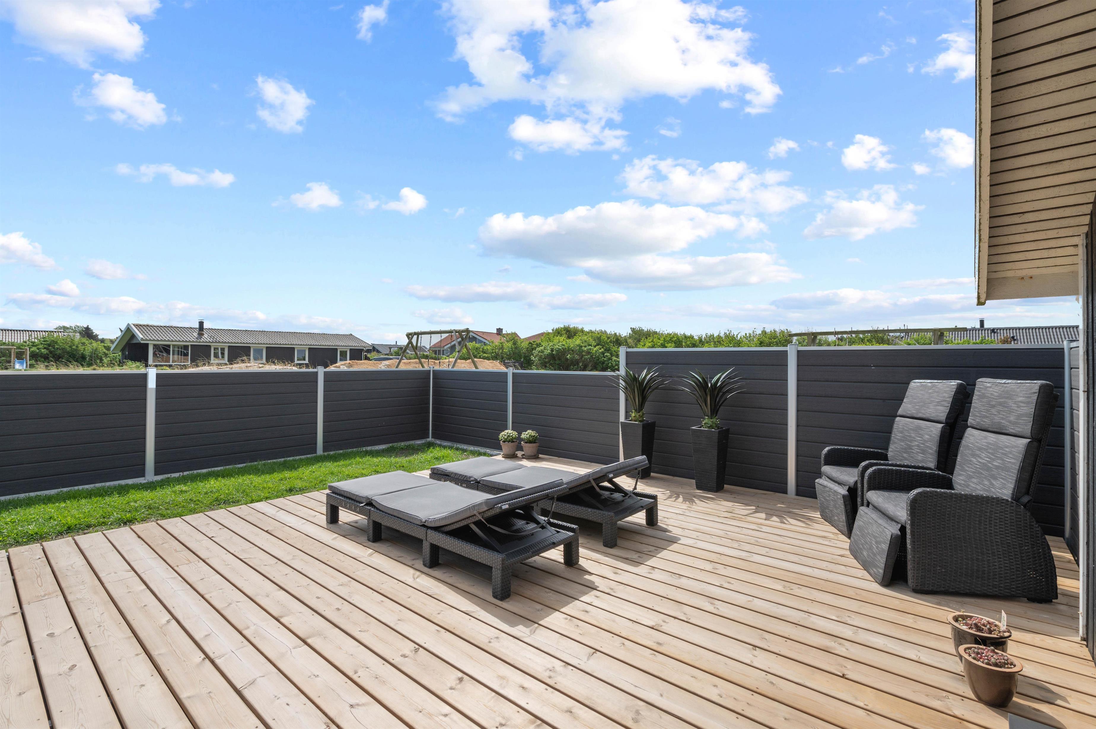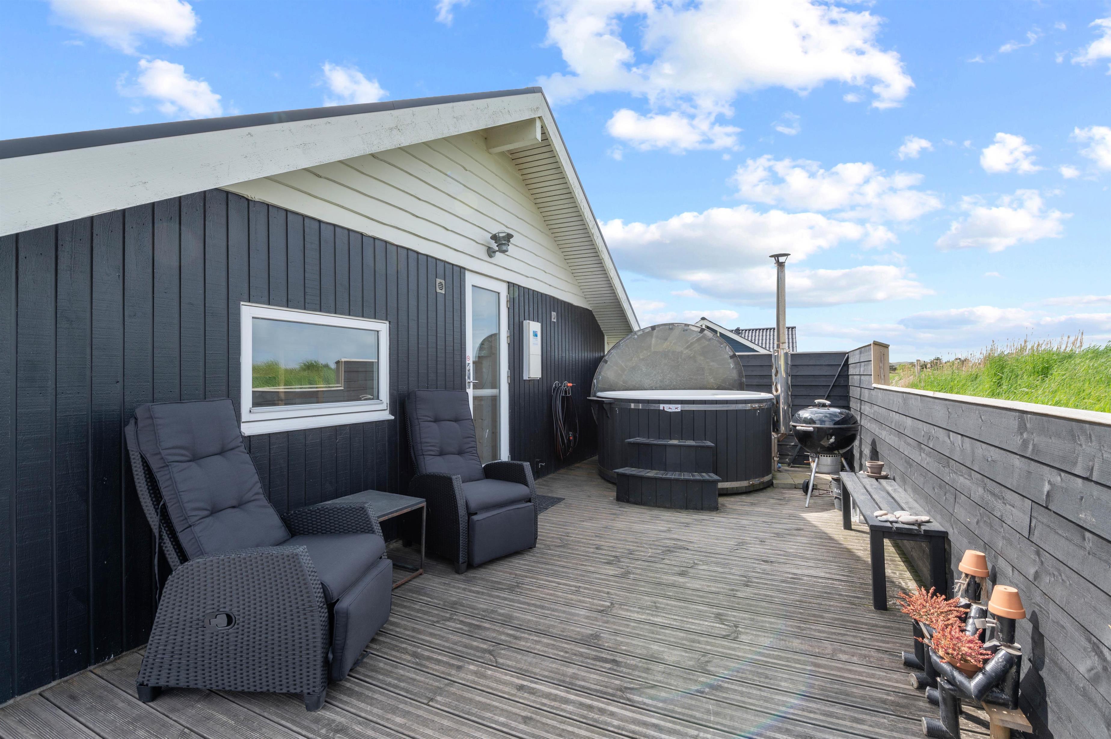 Træterrassen byder også på masser af plads til solbadning på liggestolene, der kan flyttes efter solen rundt langs huset. Ved havebordet kan I nyde en dejlig grillmiddag i aftensolen og slutte dagen af med endnu en tur i vildmarksbadet, imens opvaskemaskinen klarer opvasken.