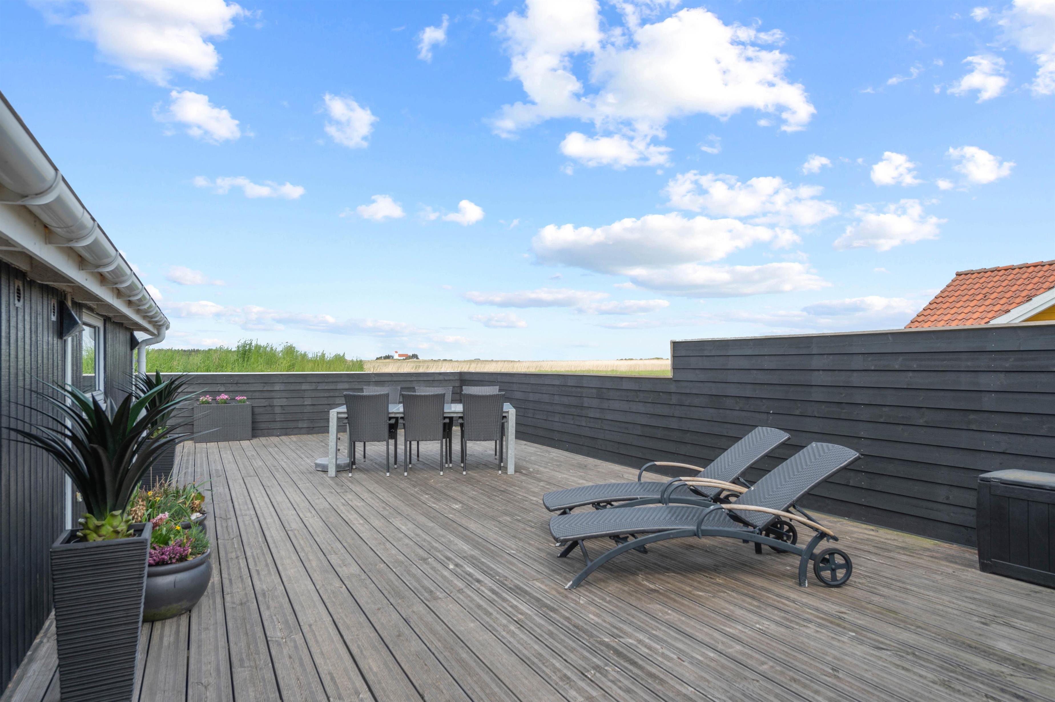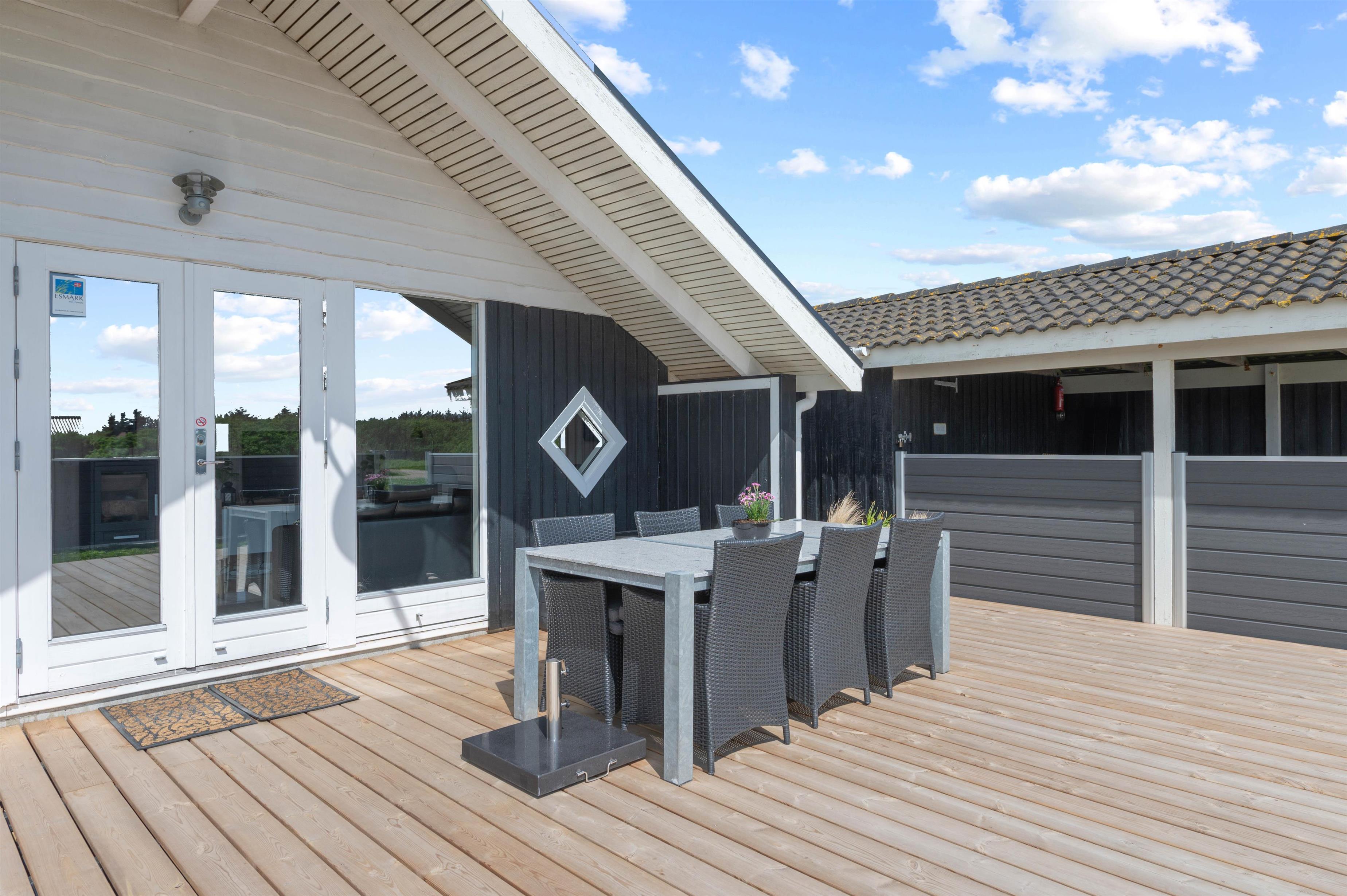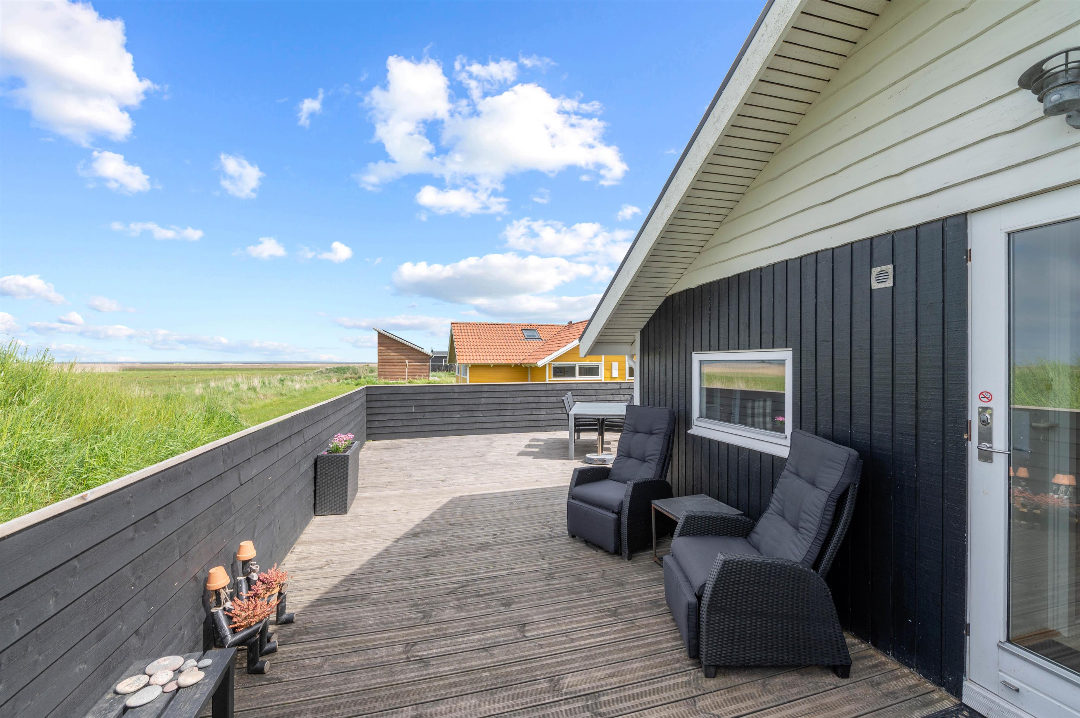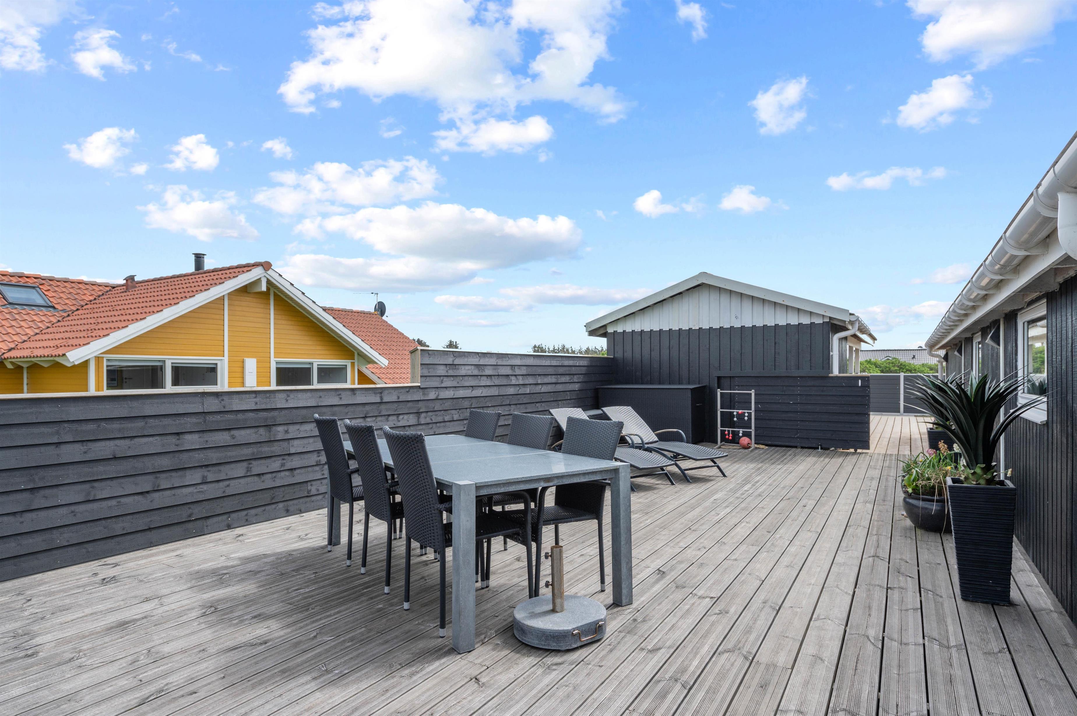 Træterrassen byder også på masser af plads til solbadning på liggestolene, der kan flyttes efter solen rundt langs huset. Ved havebordet kan I nyde en dejlig grillmiddag i aftensolen og slutte dagen af med endnu en tur i vildmarksbadet, imens opvaskemaskinen klarer opvasken.