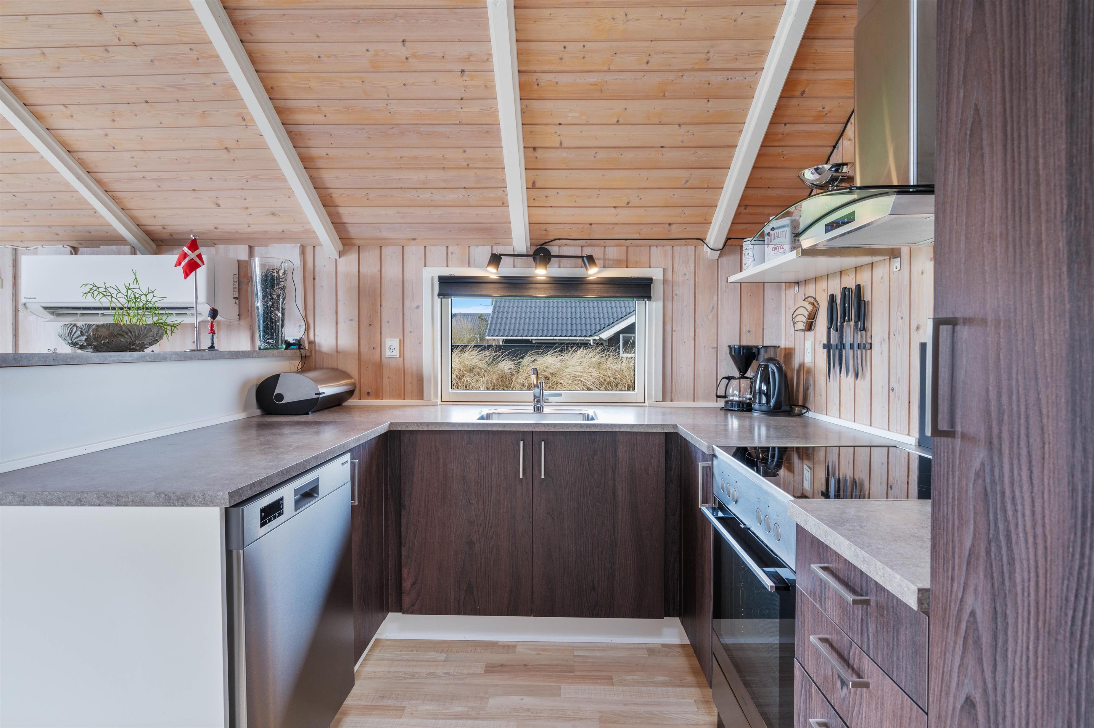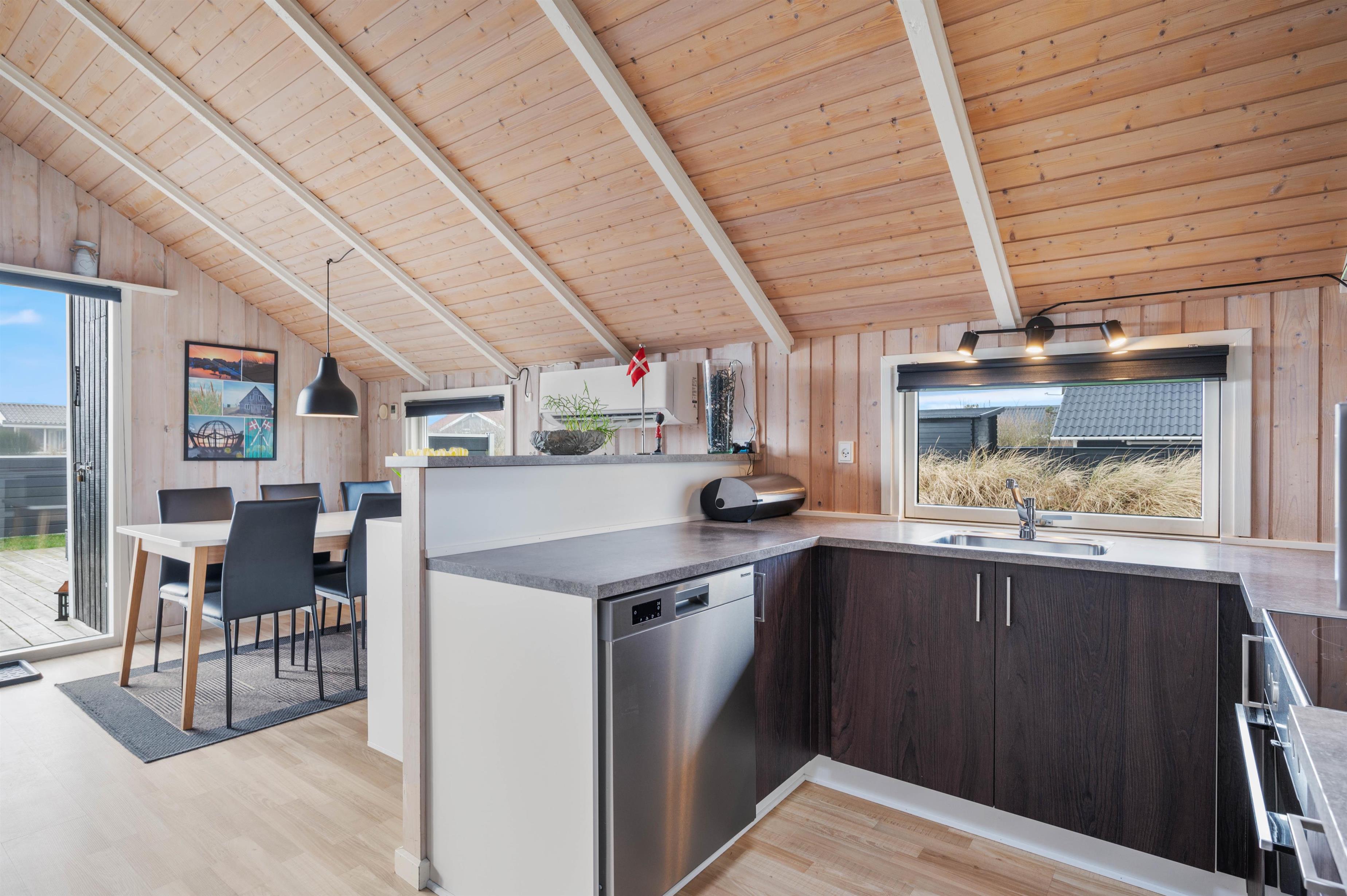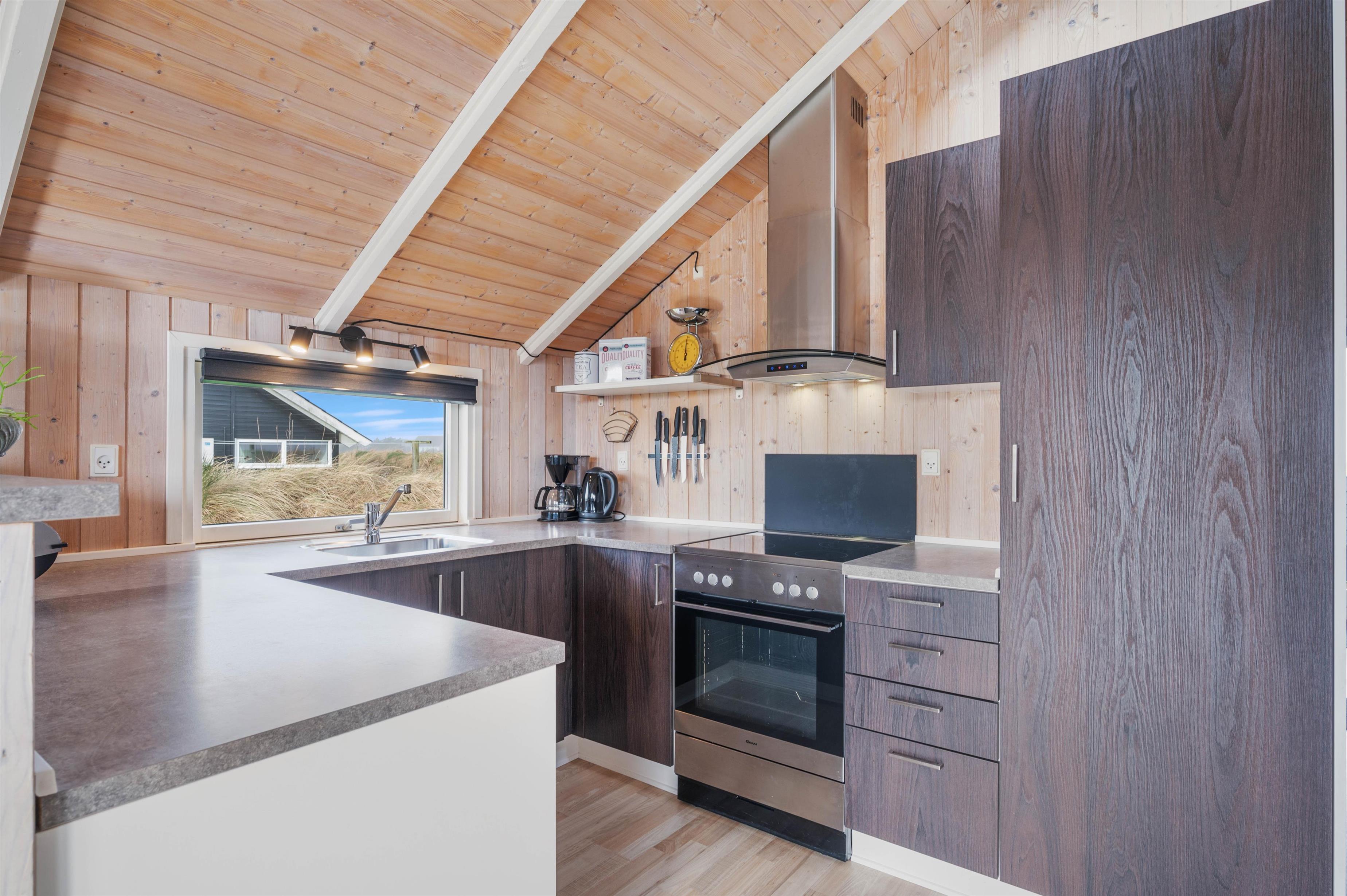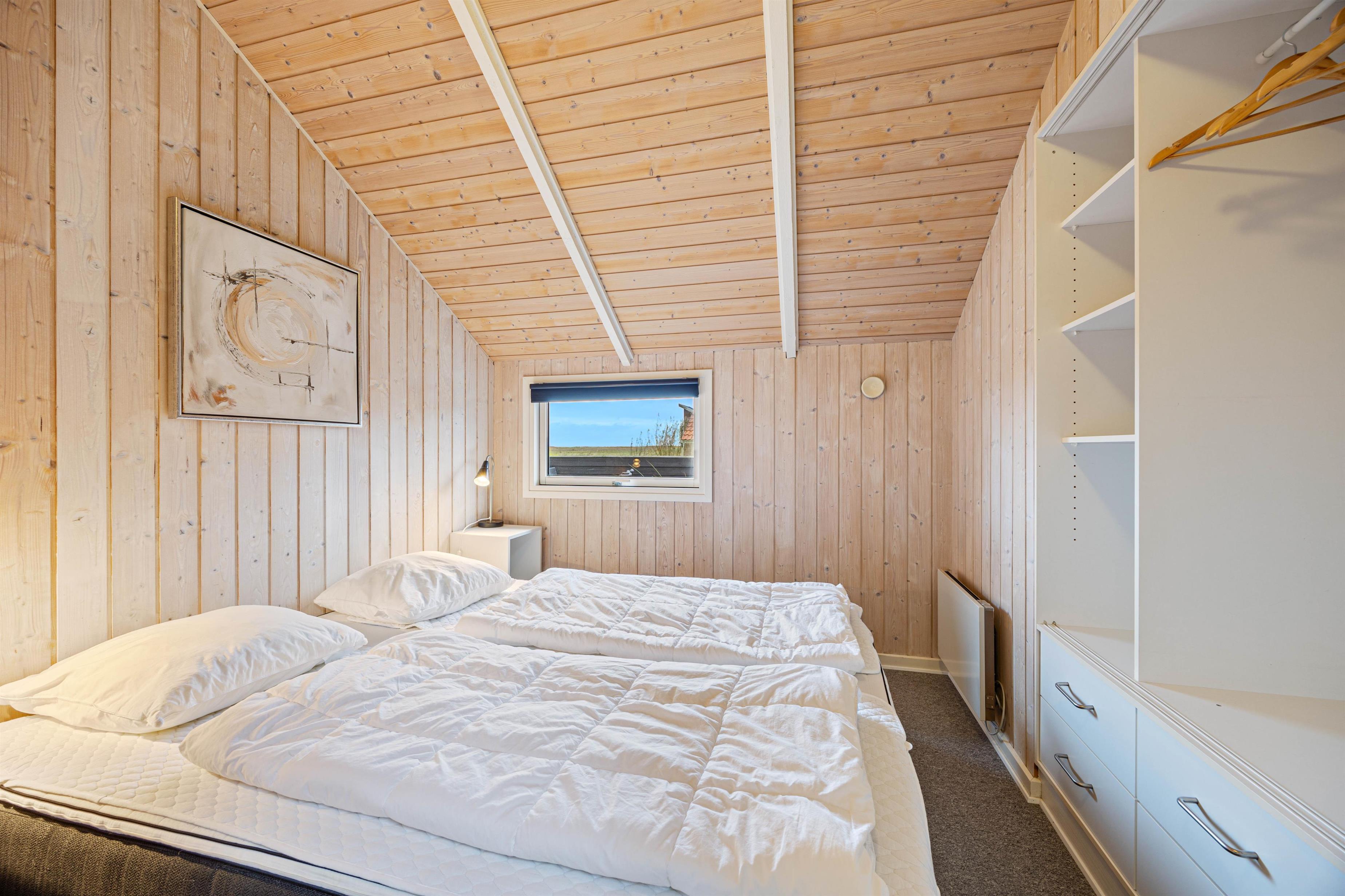 Det åbne og stilfulde køkken giver plads til, at store og små feriegæster kan lave mad sammen med udsigt til opholdsrummet. På de hyggelige værelser sørger de skrå vægge for den klassiske sommerhusstemning med et moderne strejf.