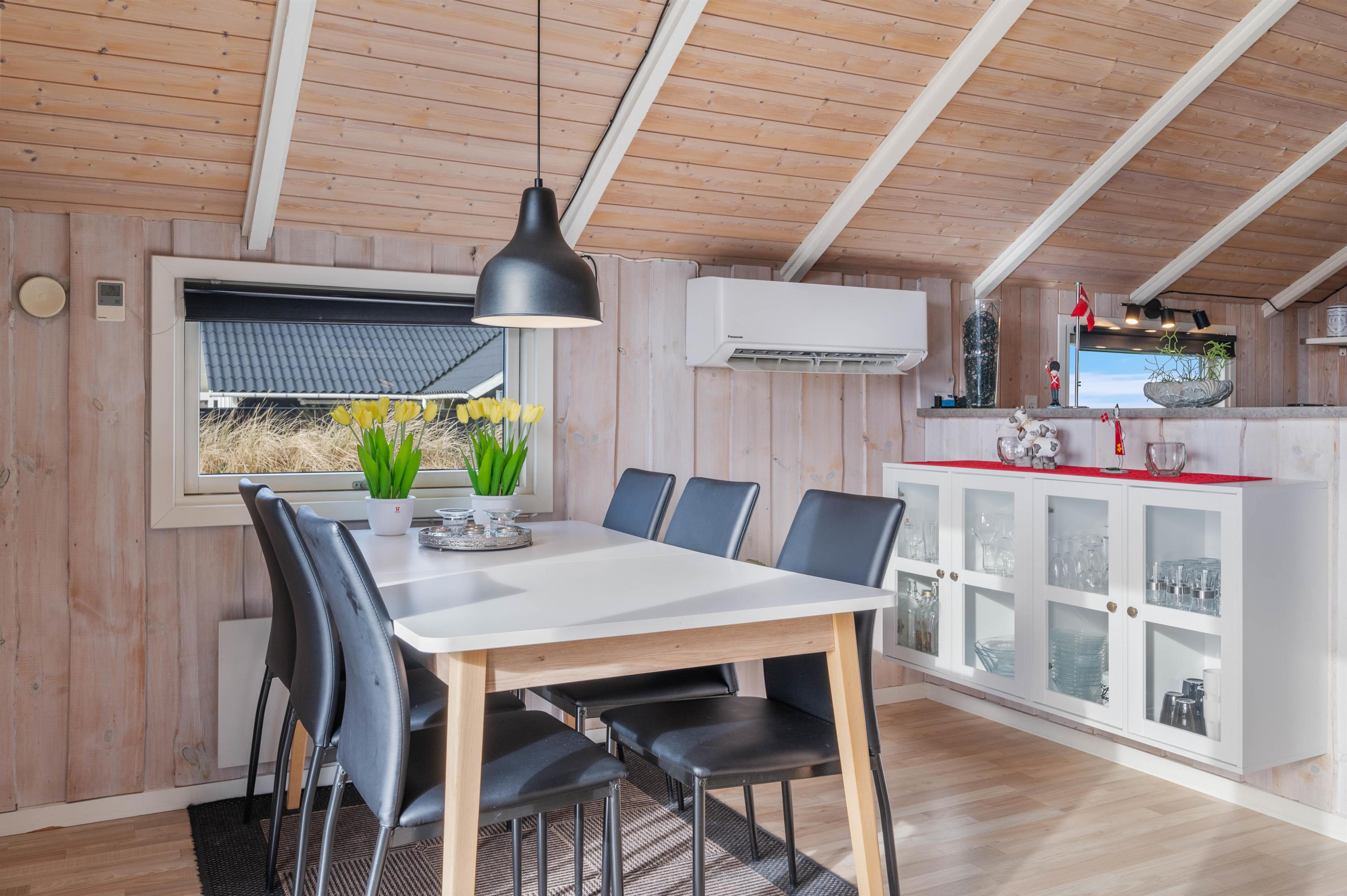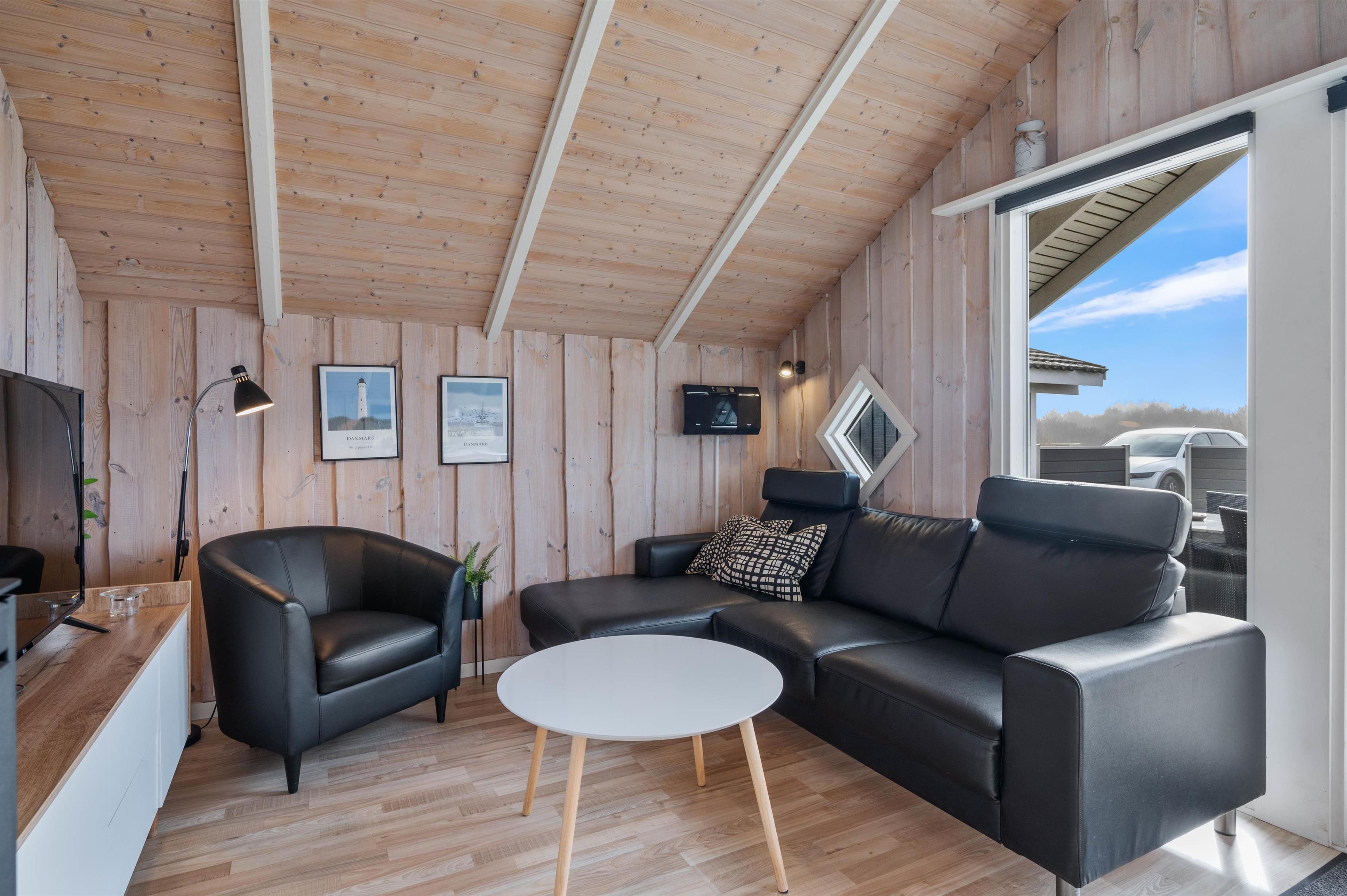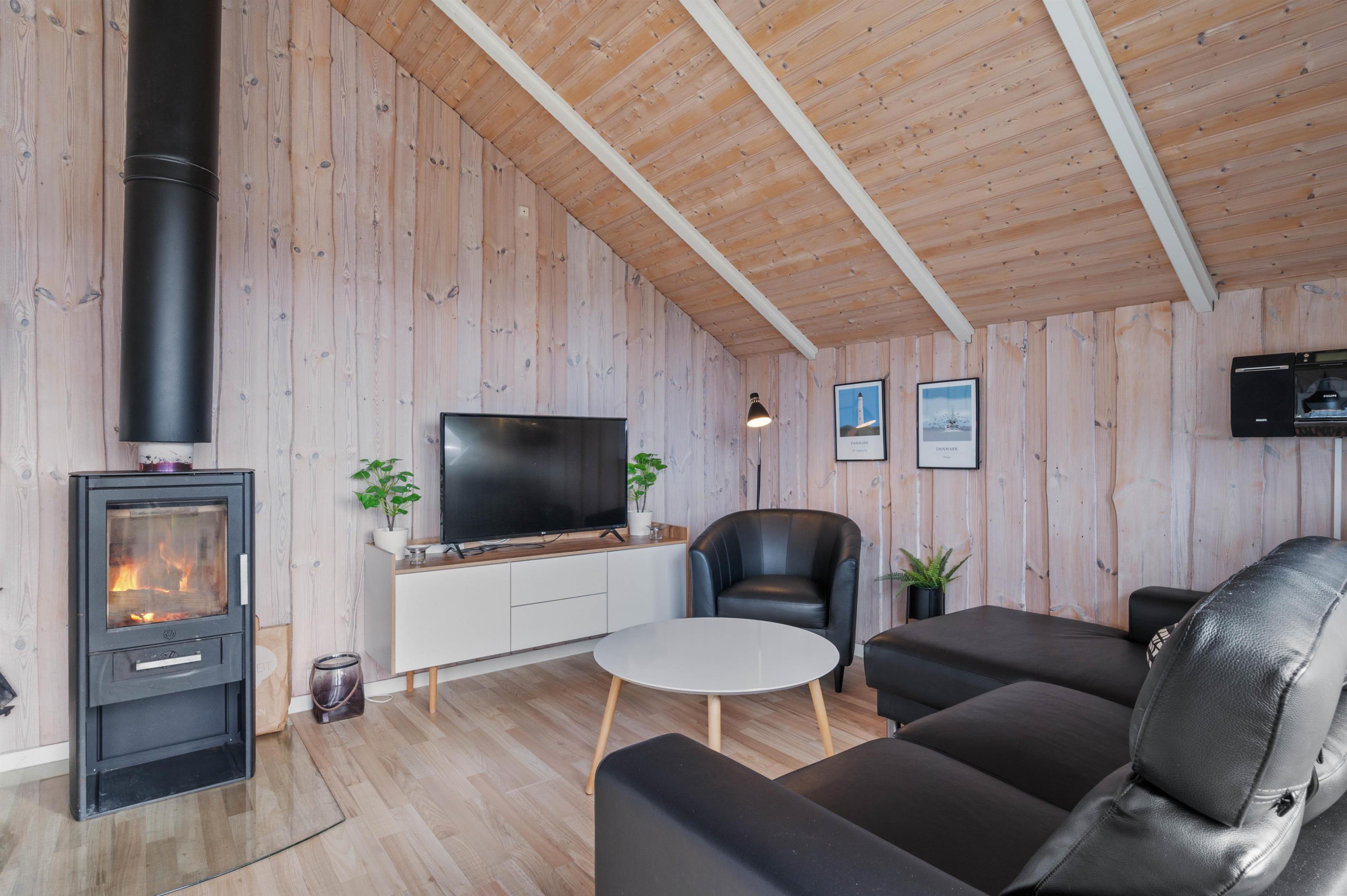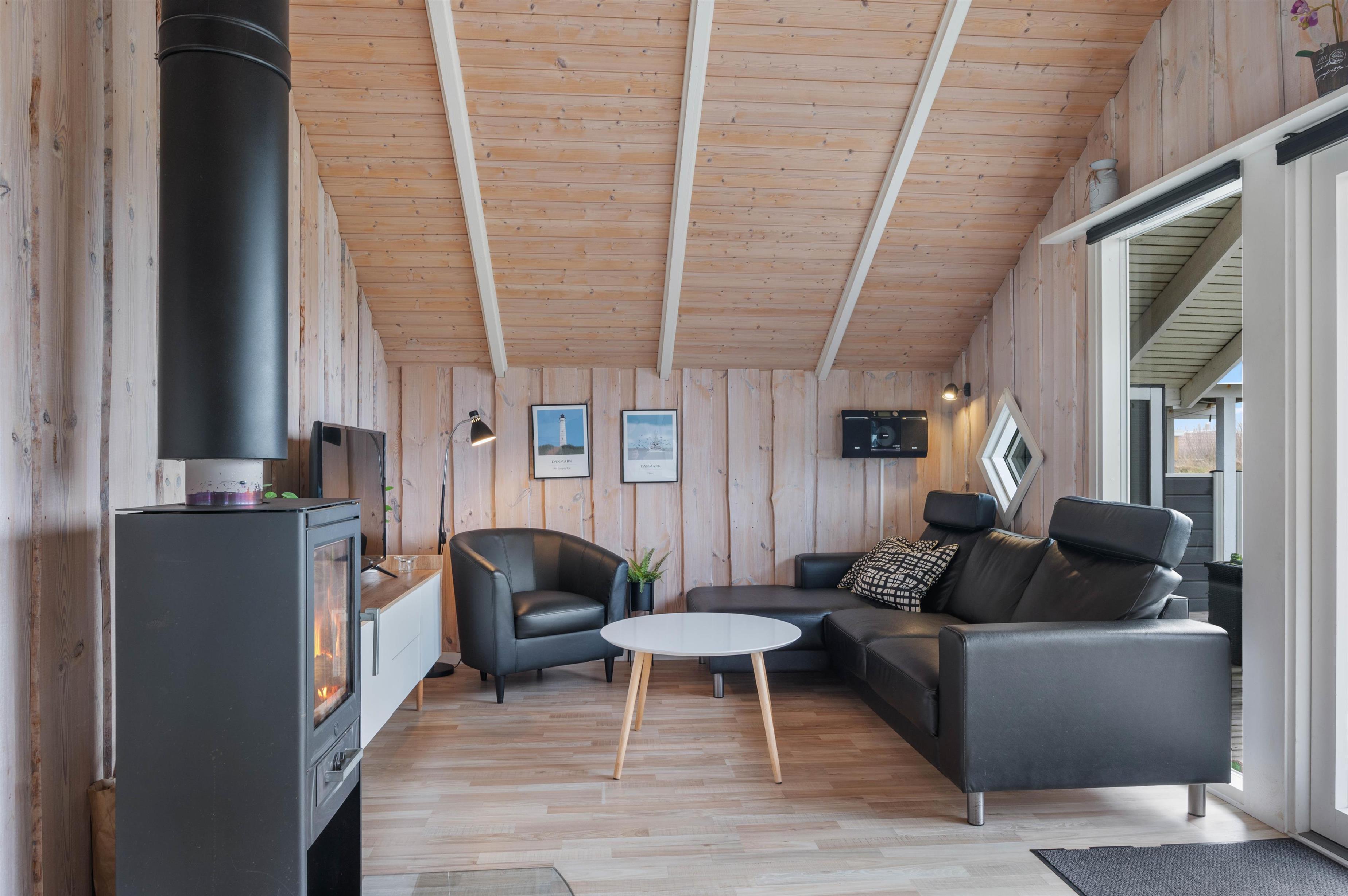 Den lyse og imødekommende indretning er til stedet både i det store køkken/alrum og på værelserne. Trævæggene i hvidmalet og lyst træ åbner huset op og spejler lyset fra det store vinduesparti i stuen ud til terrassen. I det hyggelige sofahjørne kan I læne jer tilbage foran fjernsynet eller nyde et glas vin i brændeovnens skær.