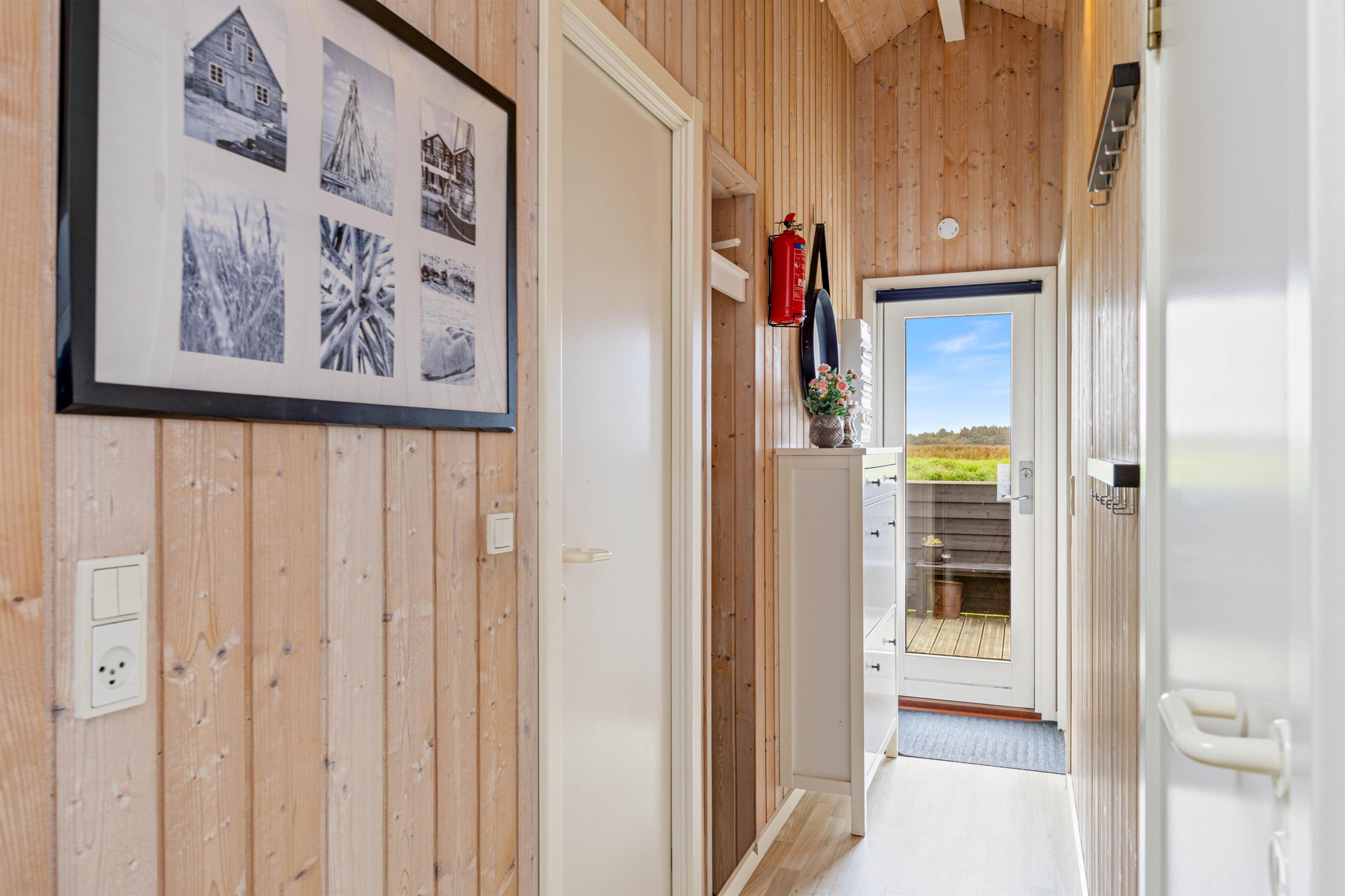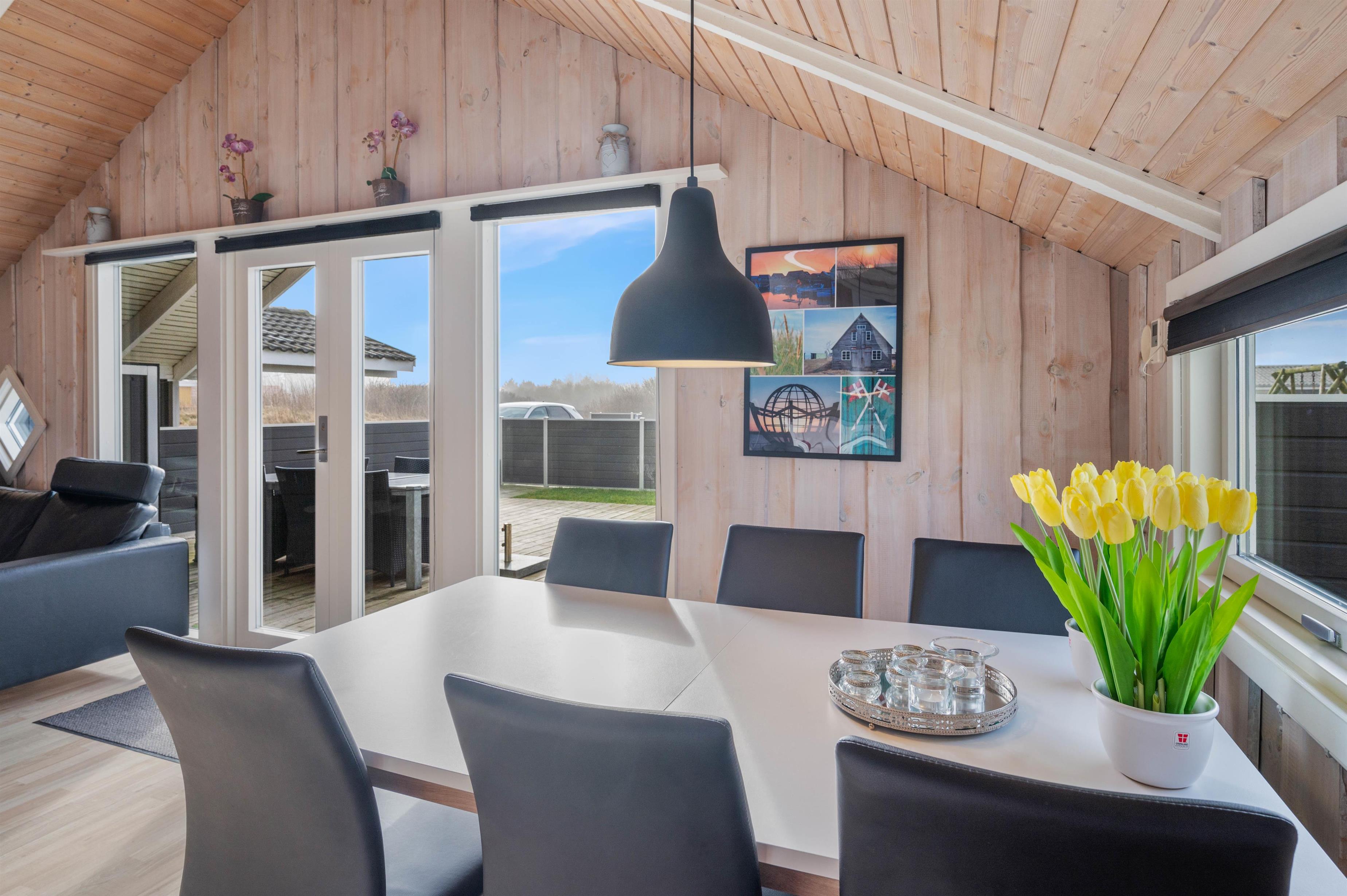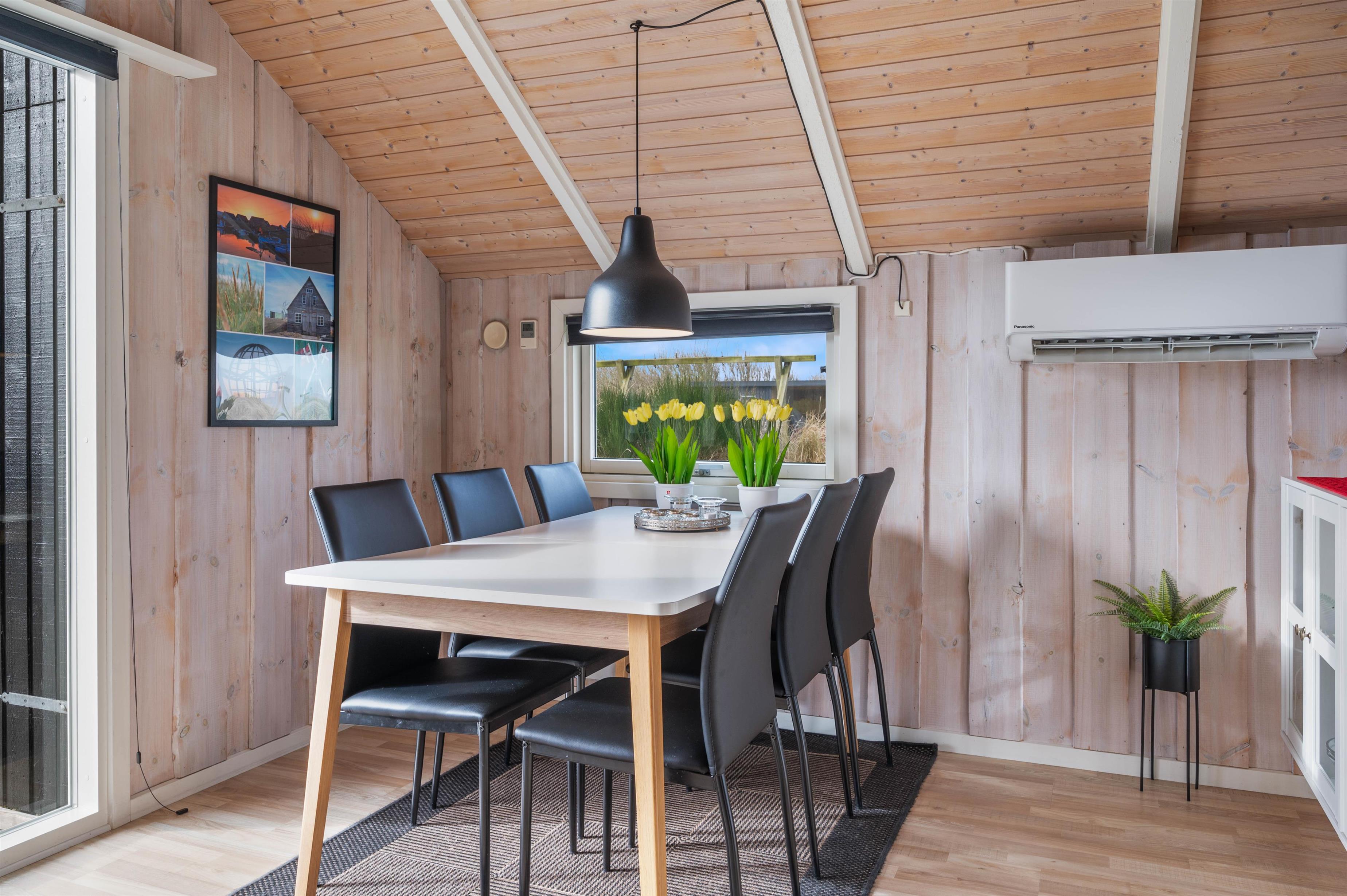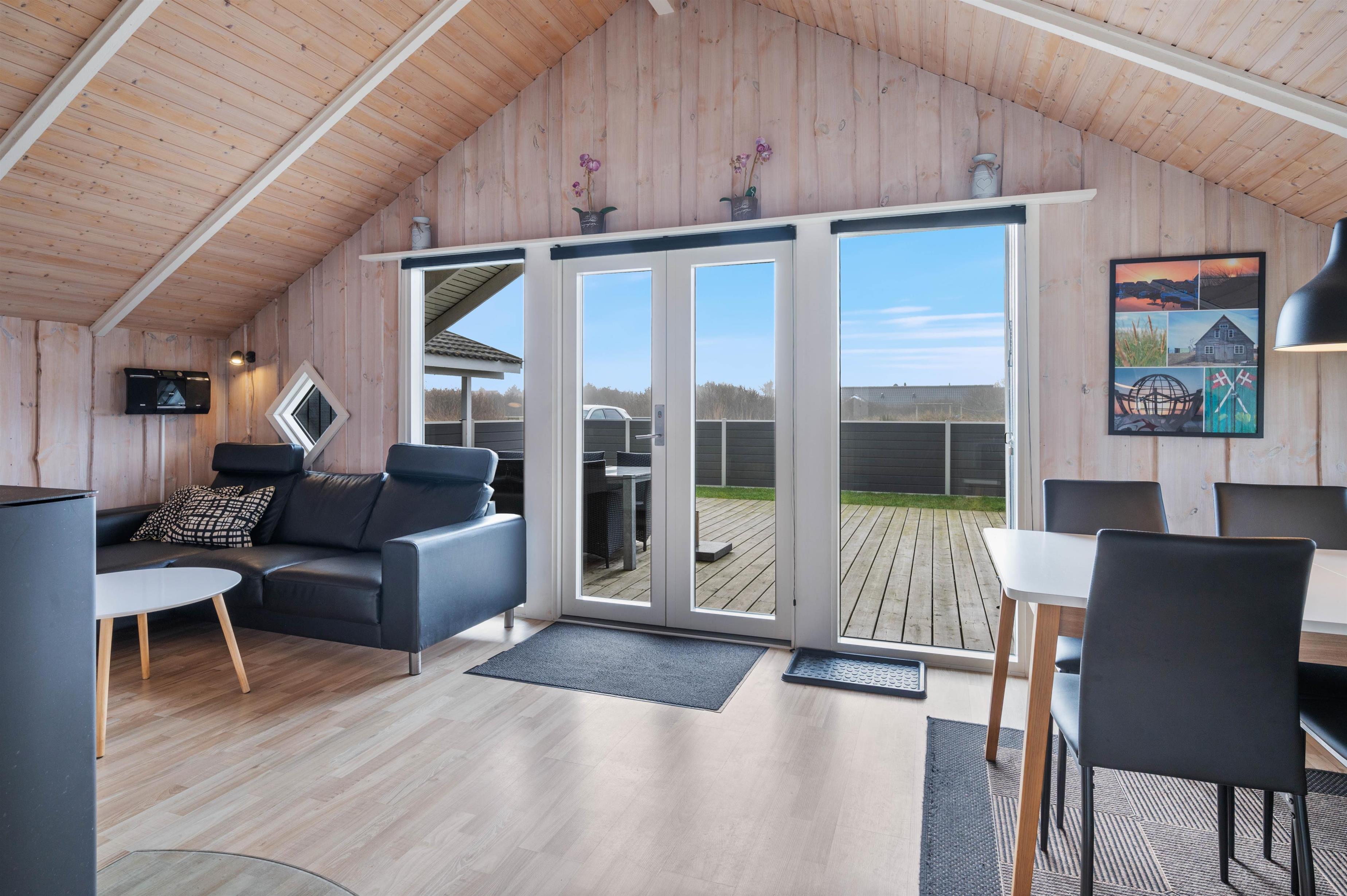 Den lyse og imødekommende indretning er til stedet både i det store køkken/alrum og på værelserne. Trævæggene i hvidmalet og lyst træ åbner huset op og spejler lyset fra det store vinduesparti i stuen ud til terrassen. I det hyggelige sofahjørne kan I læne jer tilbage foran fjernsynet eller nyde et glas vin i brændeovnens skær.