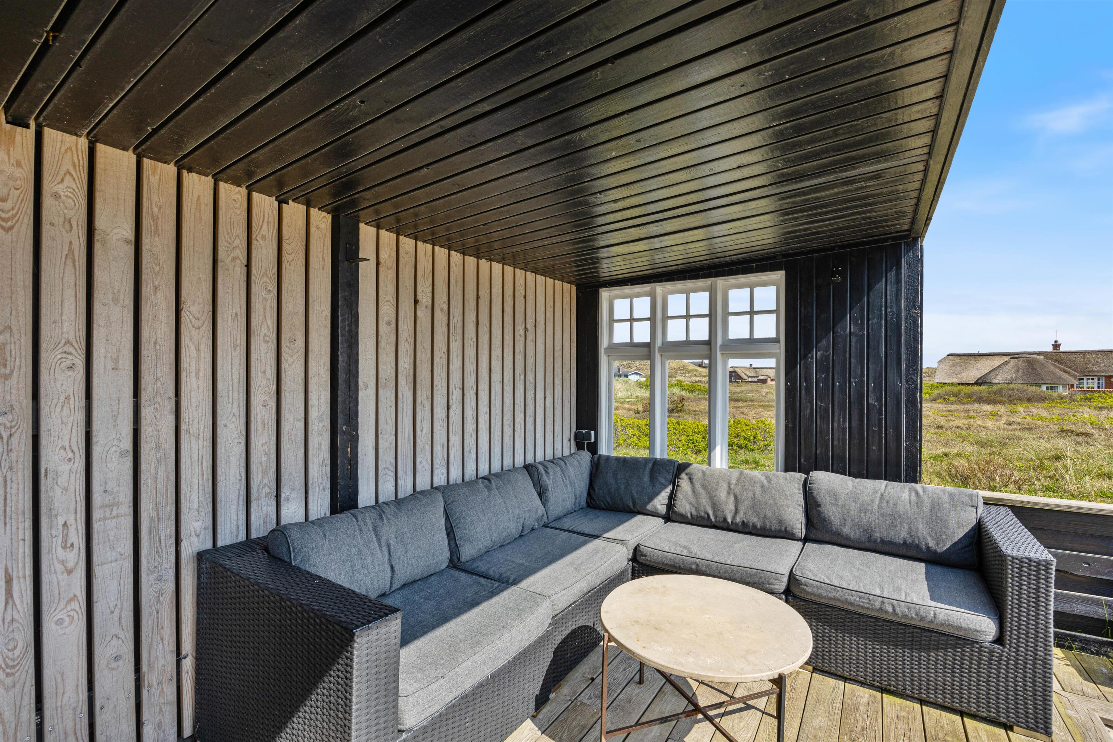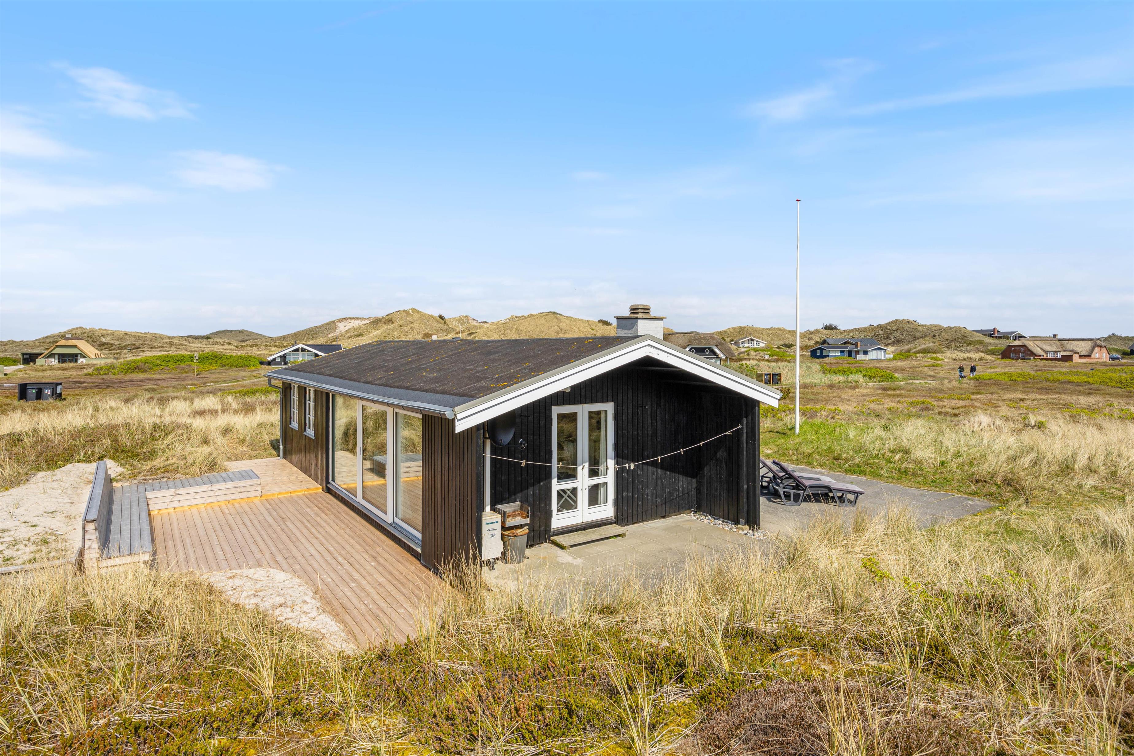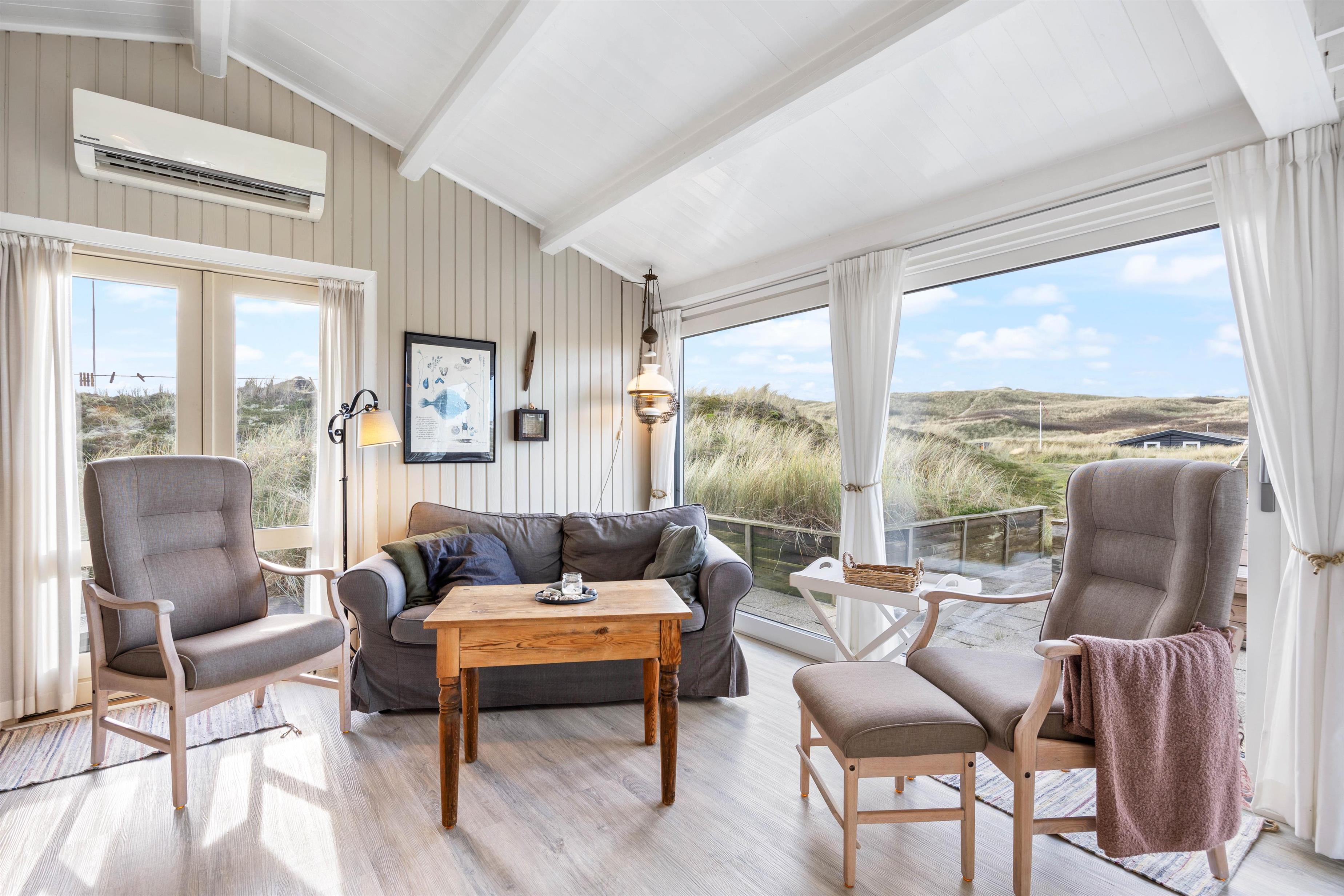 På en dejlig sommerhusvej i Haurvig ligger der en hyggelig drøm af et sommerhus. Feriehuset forener den klassiske sommerhusstil med moderne strejf af lys og luft. Her mellem klitter og hedestrækninger er der højt til loftet og virkelig plads til at slappe af og hygge sig sammen med familien.