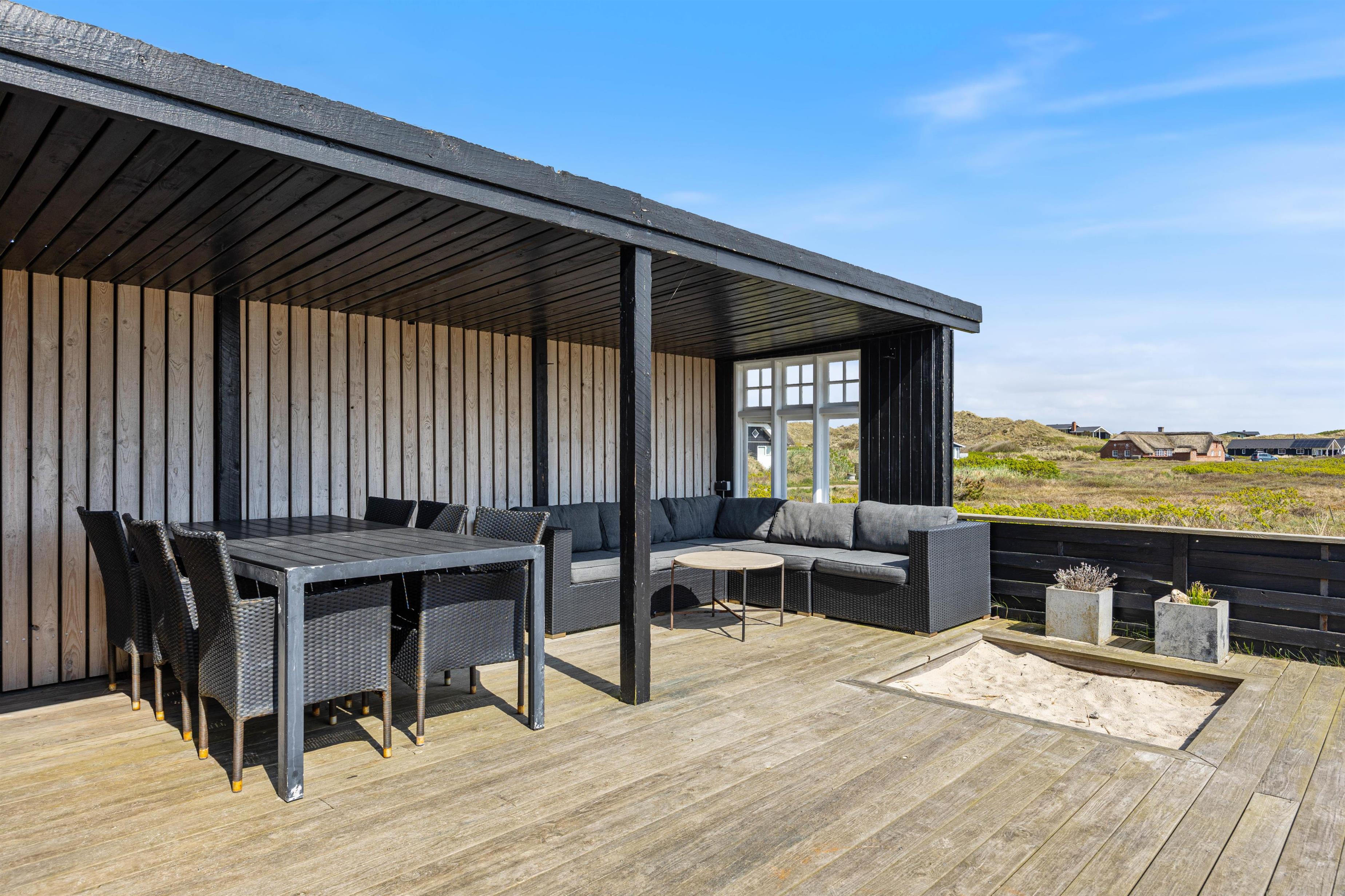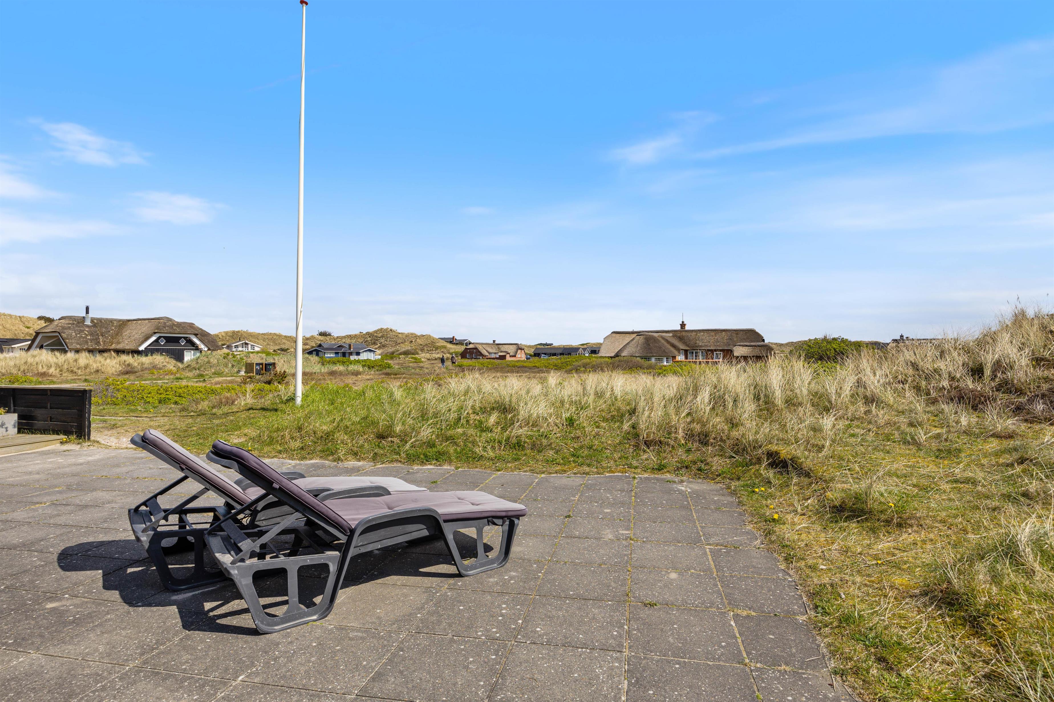 Til sommerhuset hører en rigtig dejlig, åben terrasse. Her er der både havemøbler, liggestole og grill. På varme sommerdage er terrassen perfekt til hygge sammen med venner og familie. Måske med en god middag fra grillen.